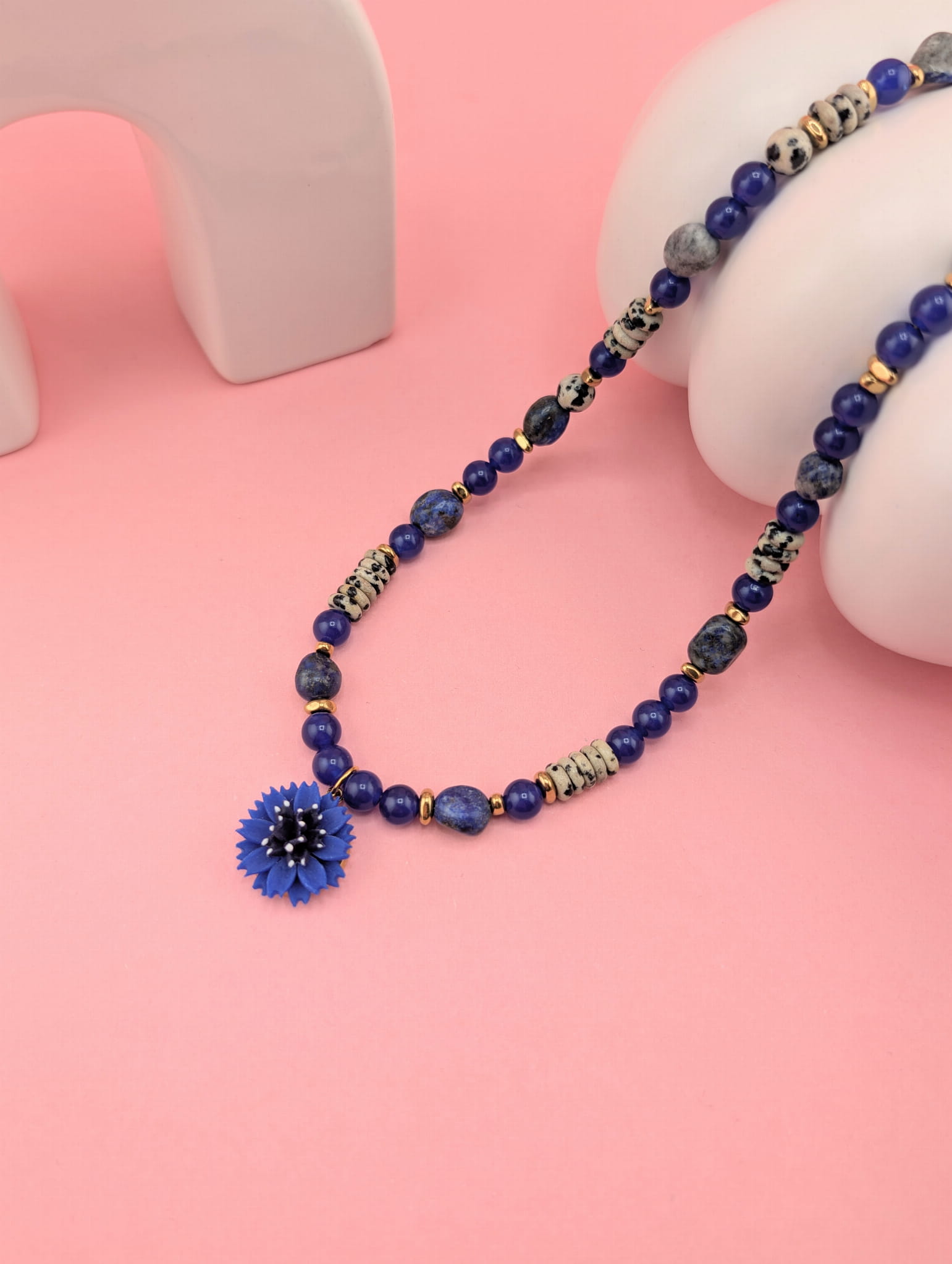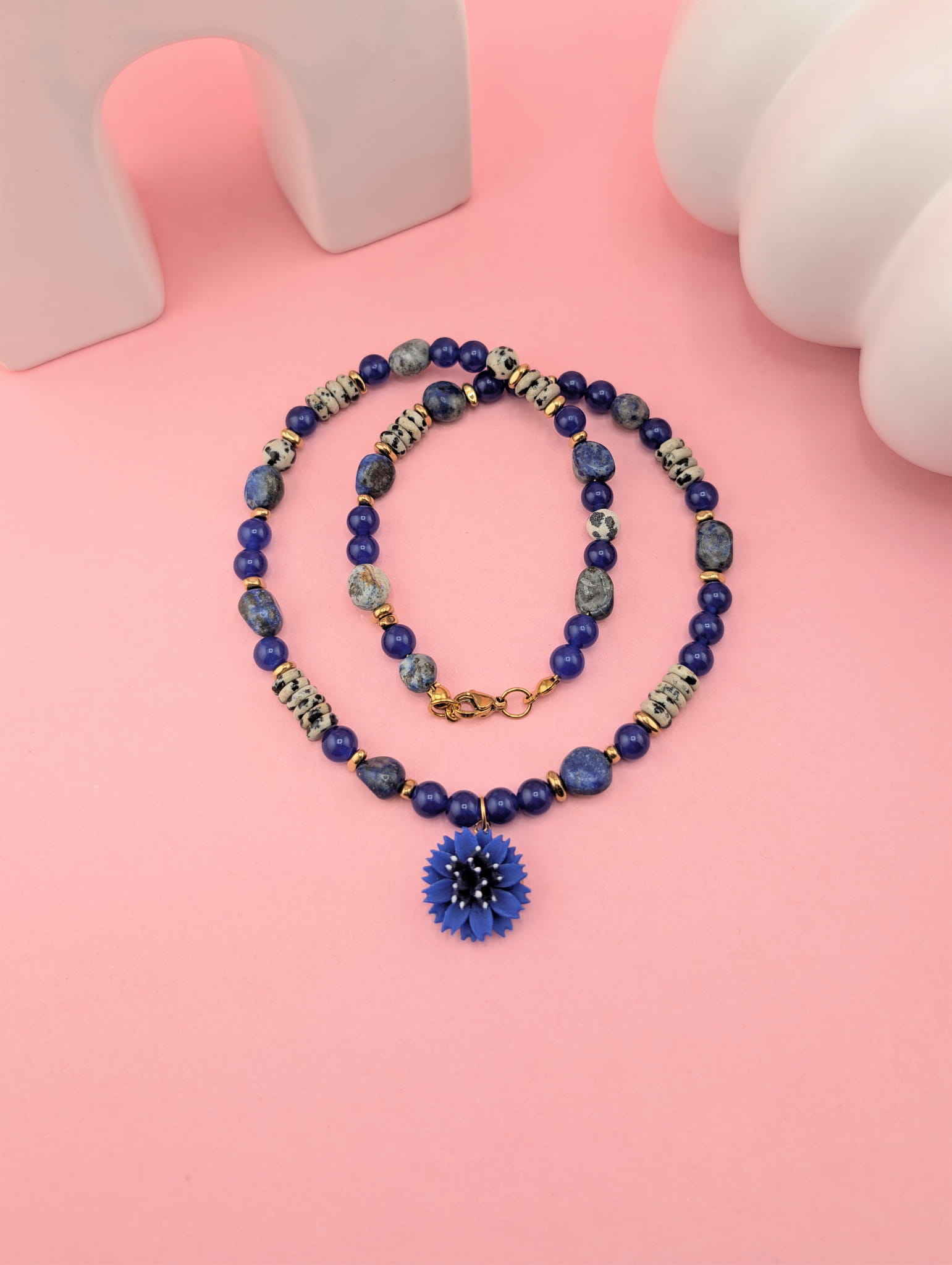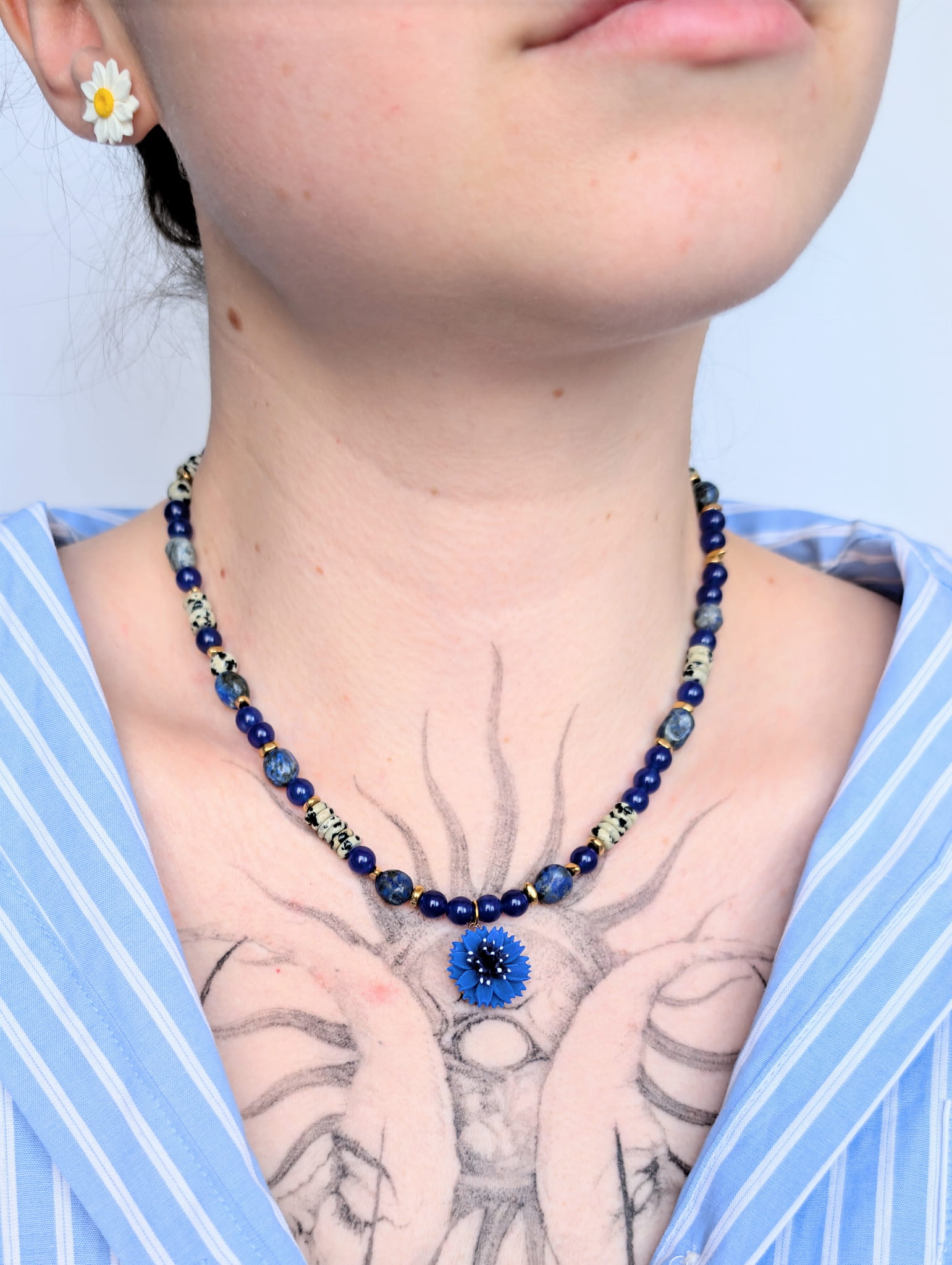 Naszyjnik z jadeitu, jaspisu i sodalitu w intensywnych chabrowych odcieniach to propozycja dla miłośniczek naturalnych materiałów. Zawieszka w kształcie chabra dodaje subtelnego, kwiatowego akcentu, idealnie łącząc naturalność z wiosennym stylem.