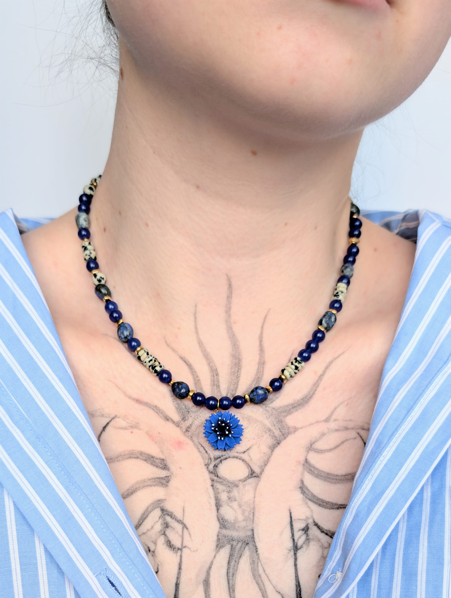Chabrowy naszyjnik z jadeitu, jaspisu i sodalitu z zawieszką w kształcie chabra. Długość naszyjnika to 45 cm. Naturalne kamienie w intensywnych chabrowych odcieniach w połączeniu z kwiatową zawieszką tworzą elegancką, wiosenną biżuterię.