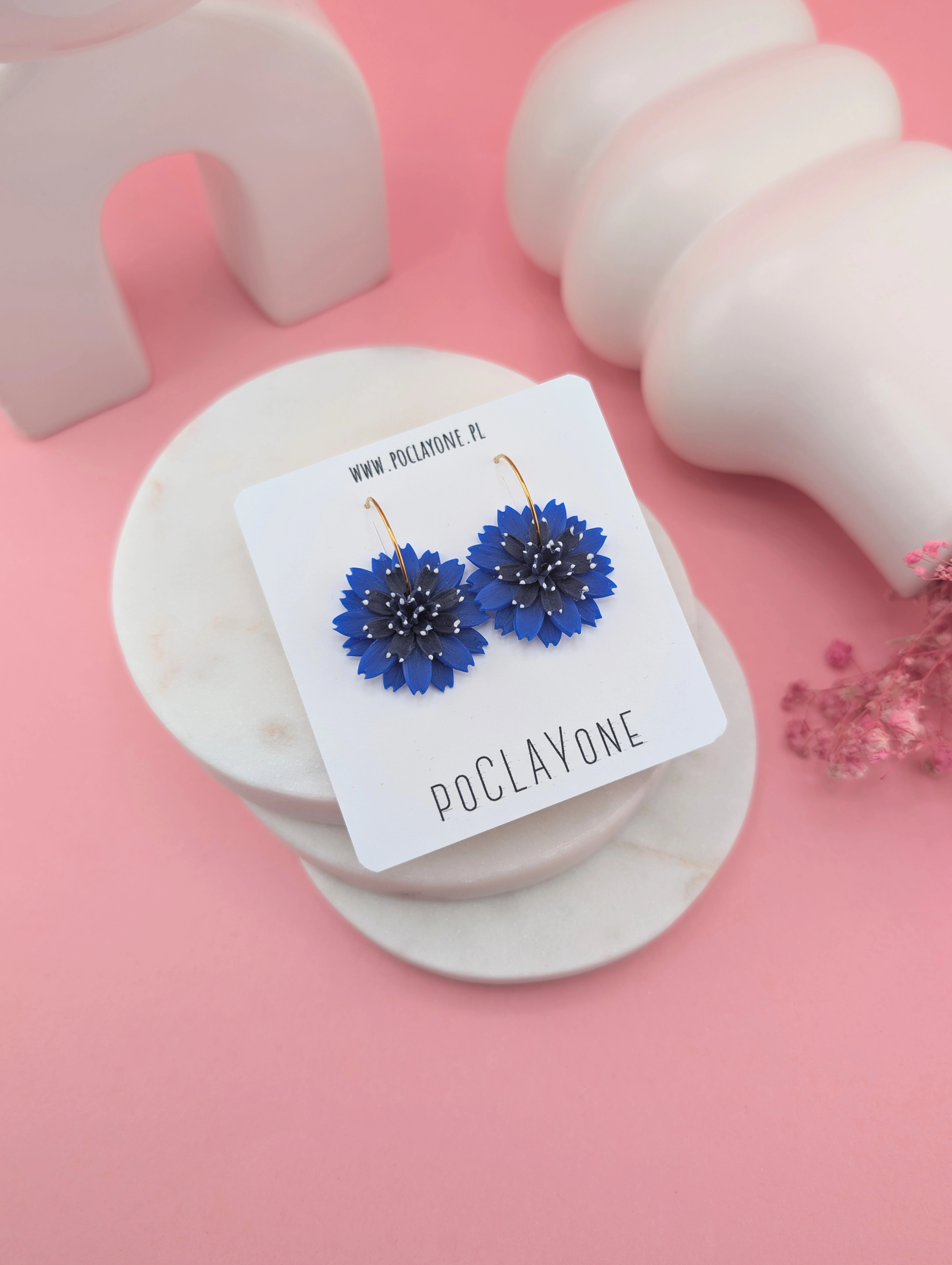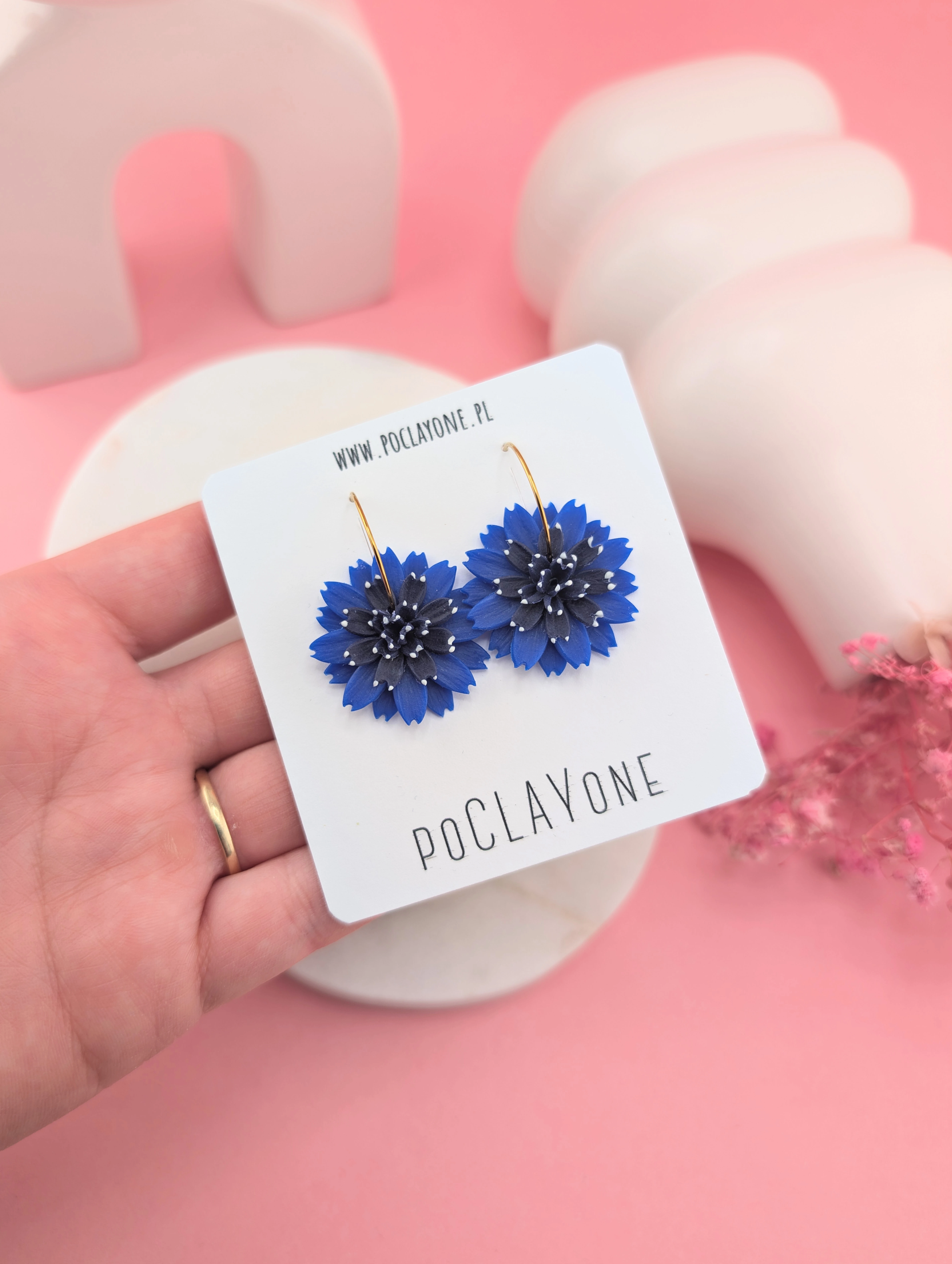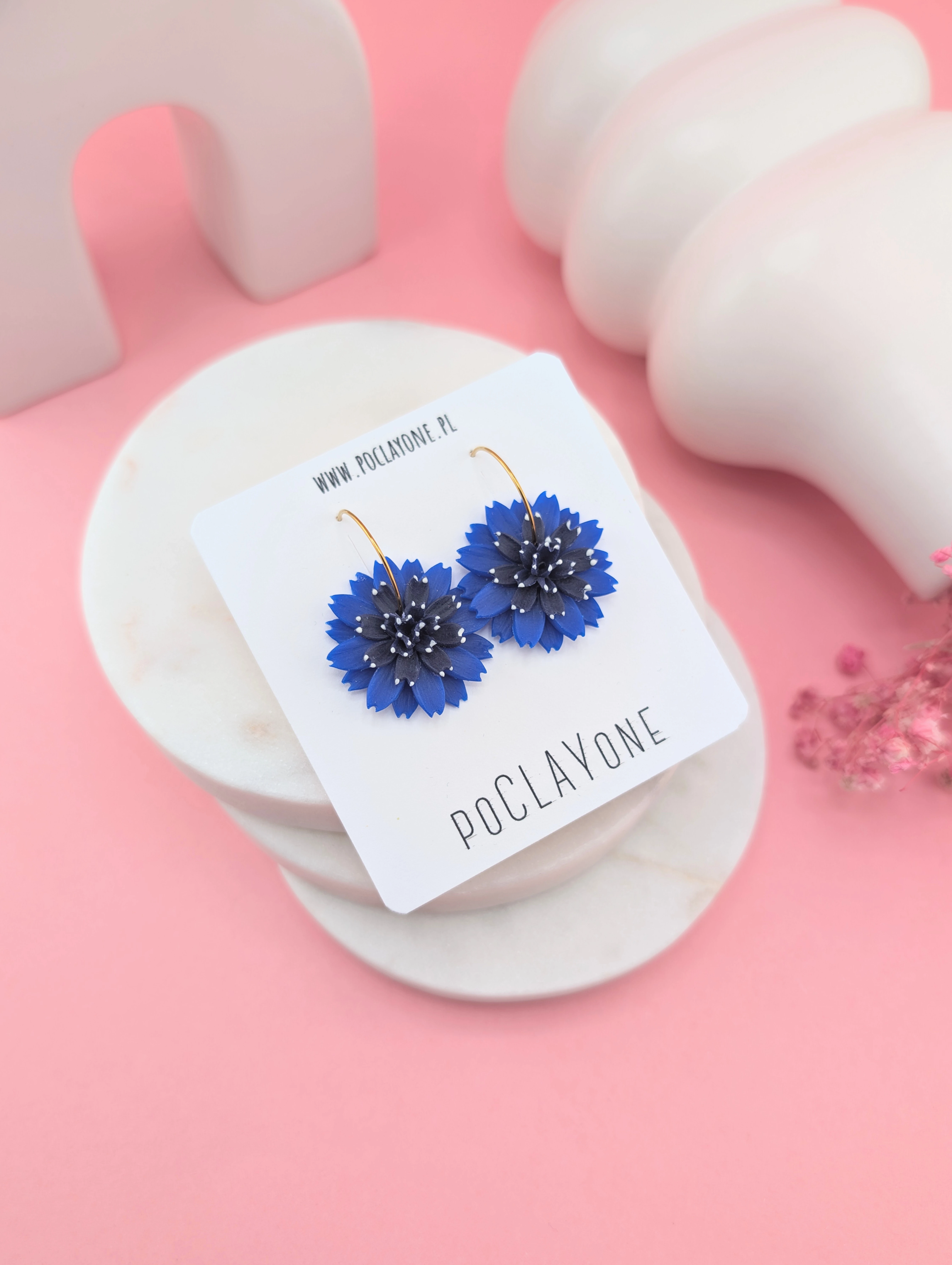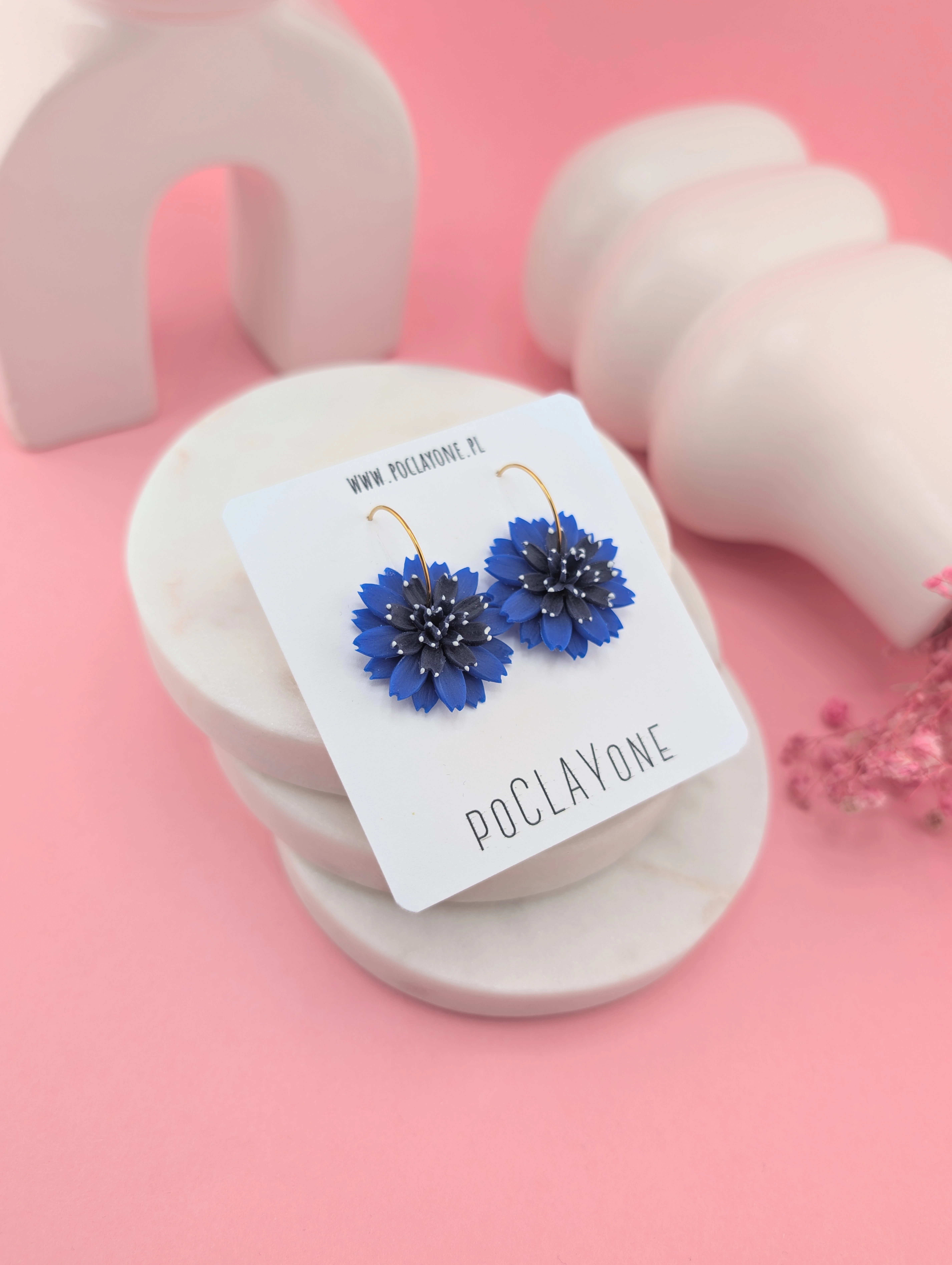 Eleganckie kolczyki chabry wiszące, ręcznie robione z gliny polimerowej i stali chirurgicznej w kolorze złotym i strebrym. Połączenie natury i klasycznej elegancji.