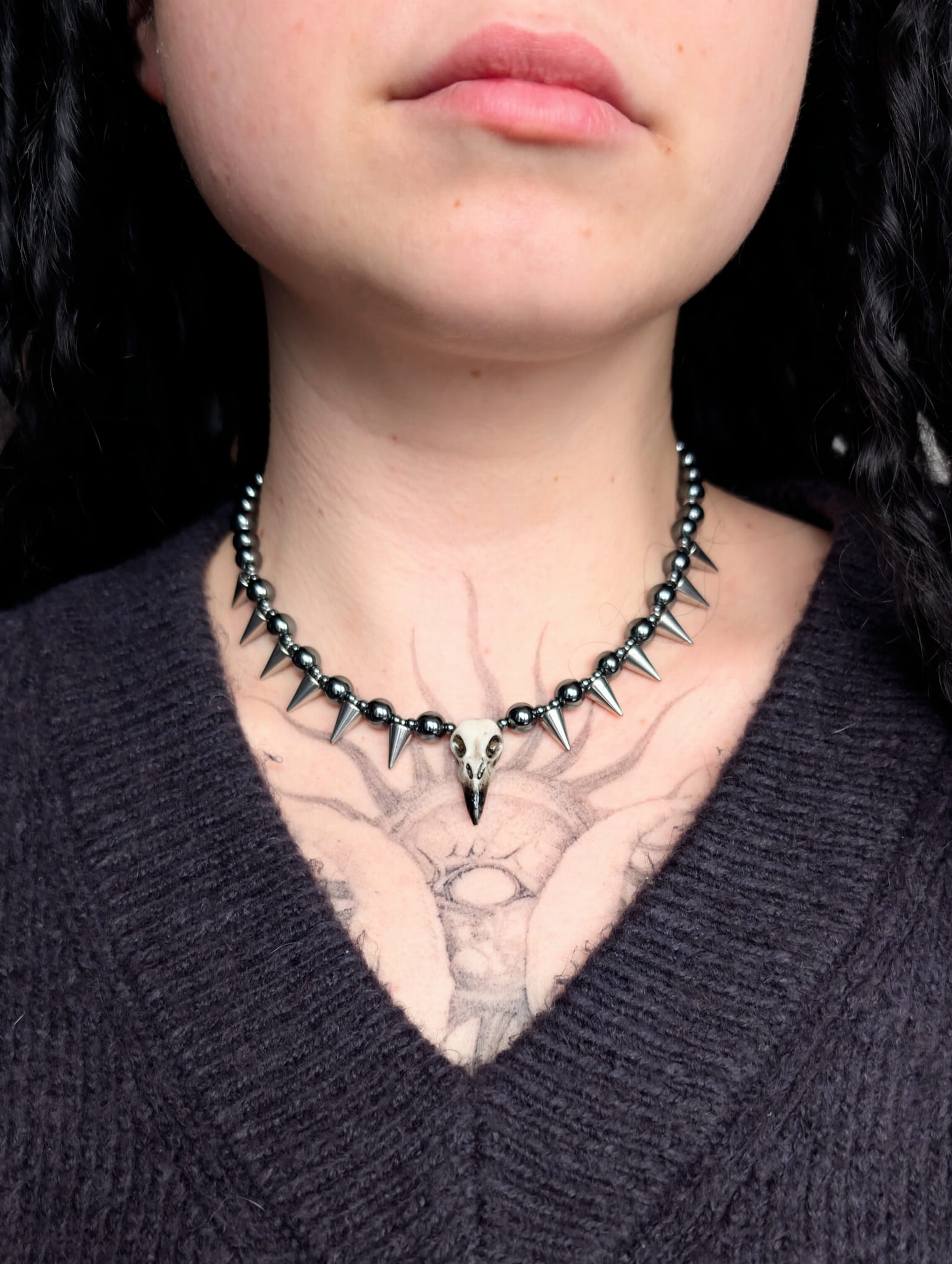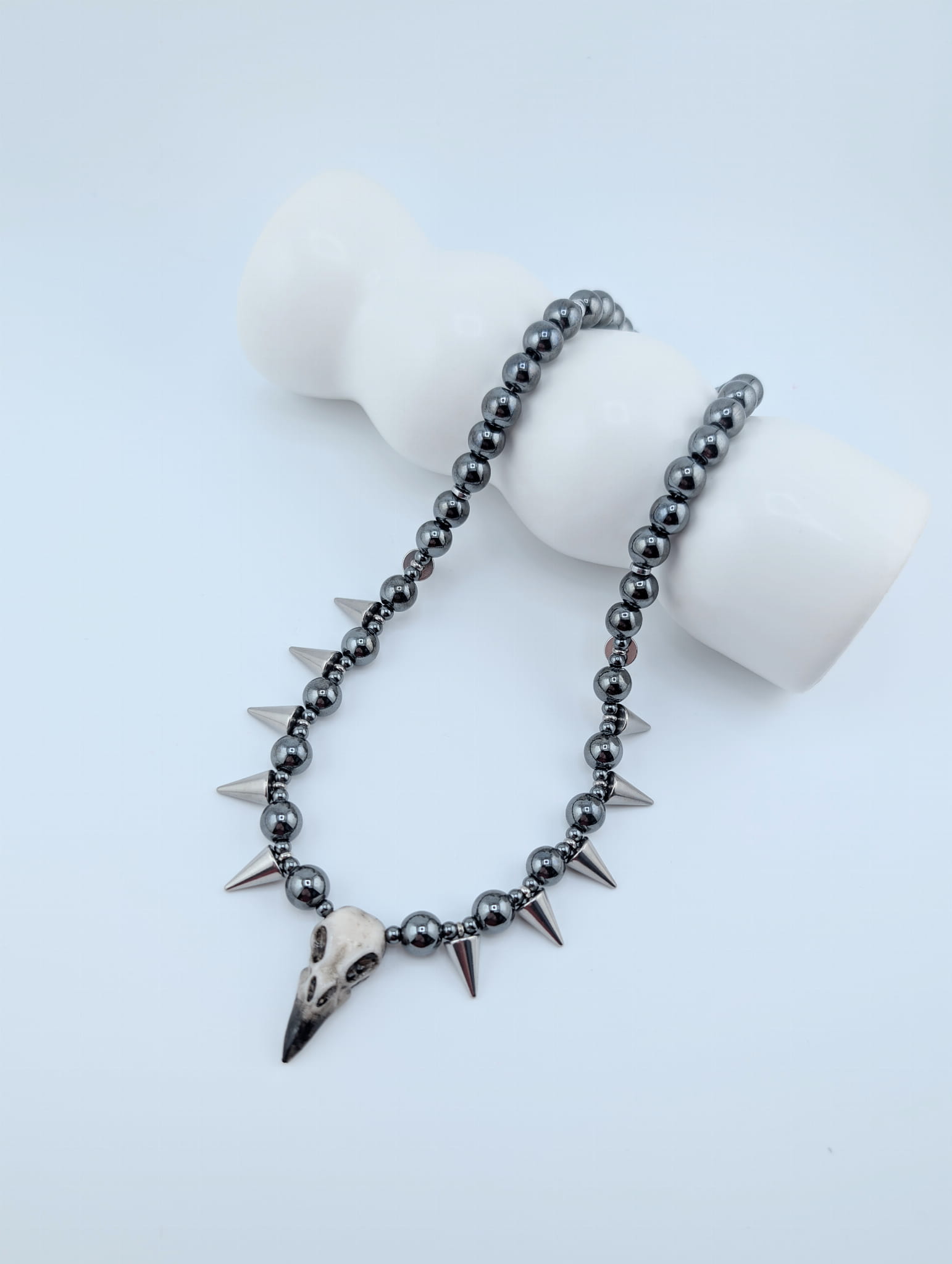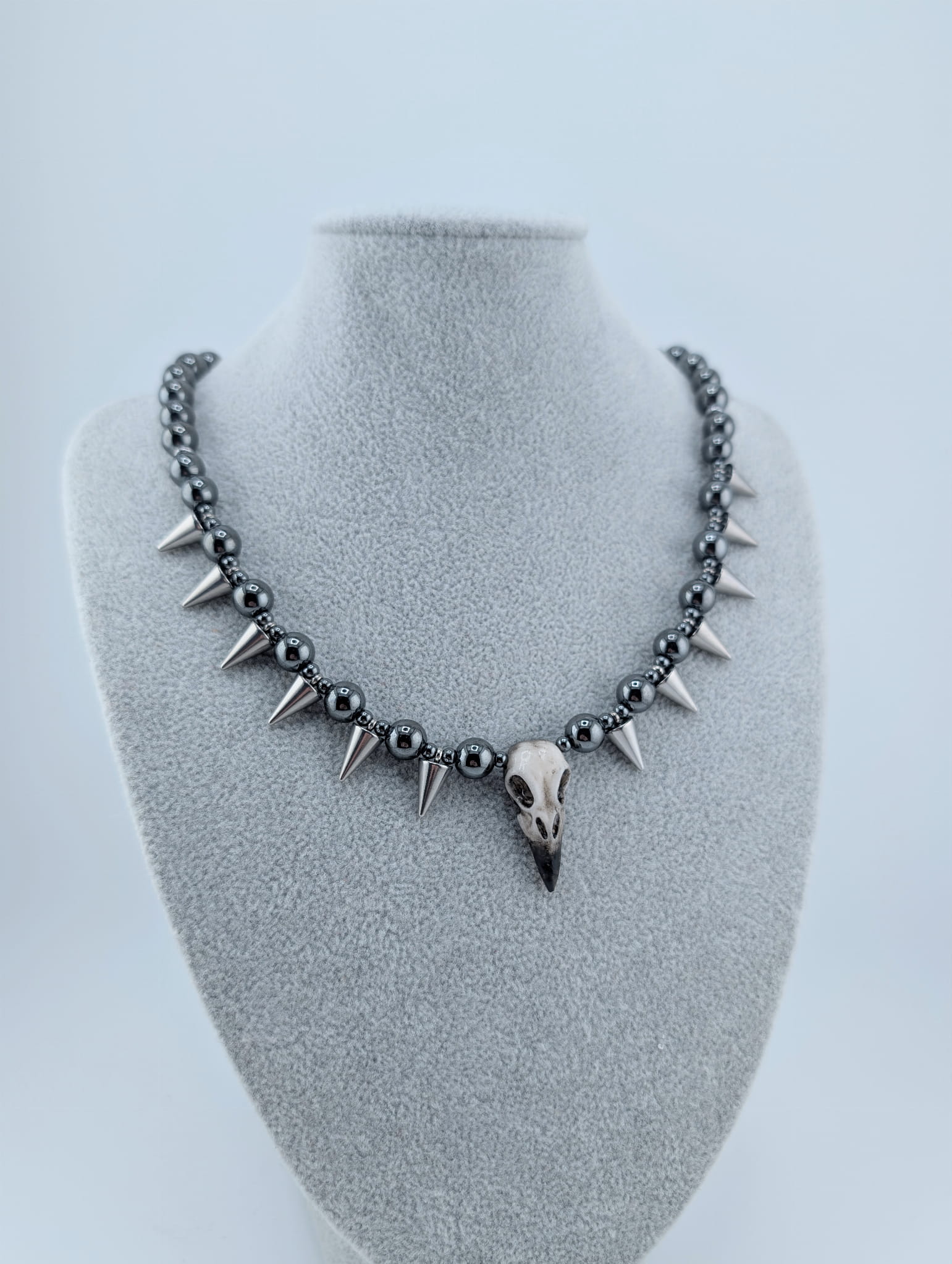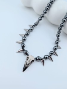 Chunky Graphit Raven Spike to wyrazisty, mroczny naszyjnik handmade z hematytu grafitowego i stalowymi kolcami. Centralna zawieszka w kształcie kruczej czaszki dodaje charakteru. Idealny dla fanów gotyku, alternatywnej mody i jesiennych stylizacji.