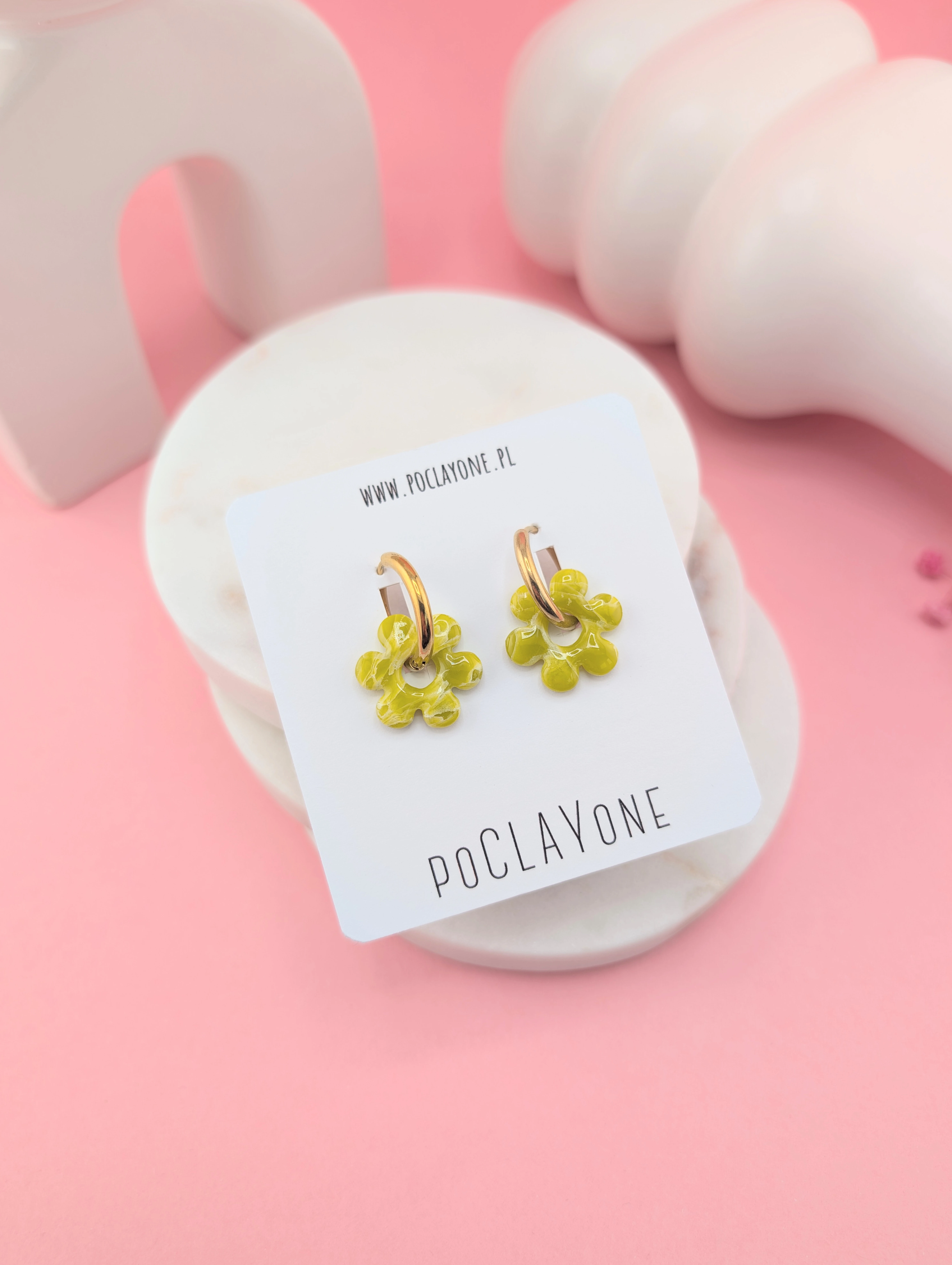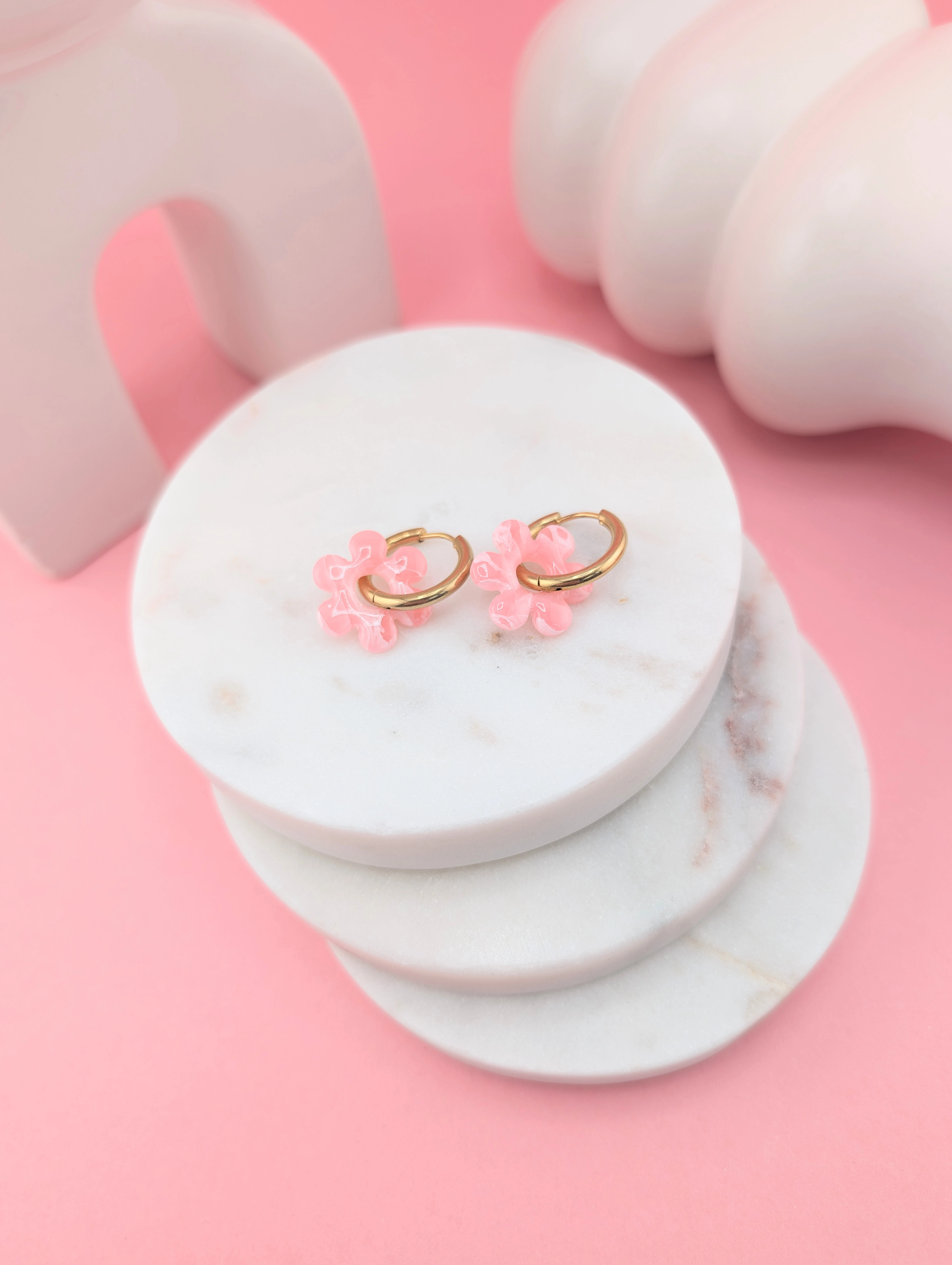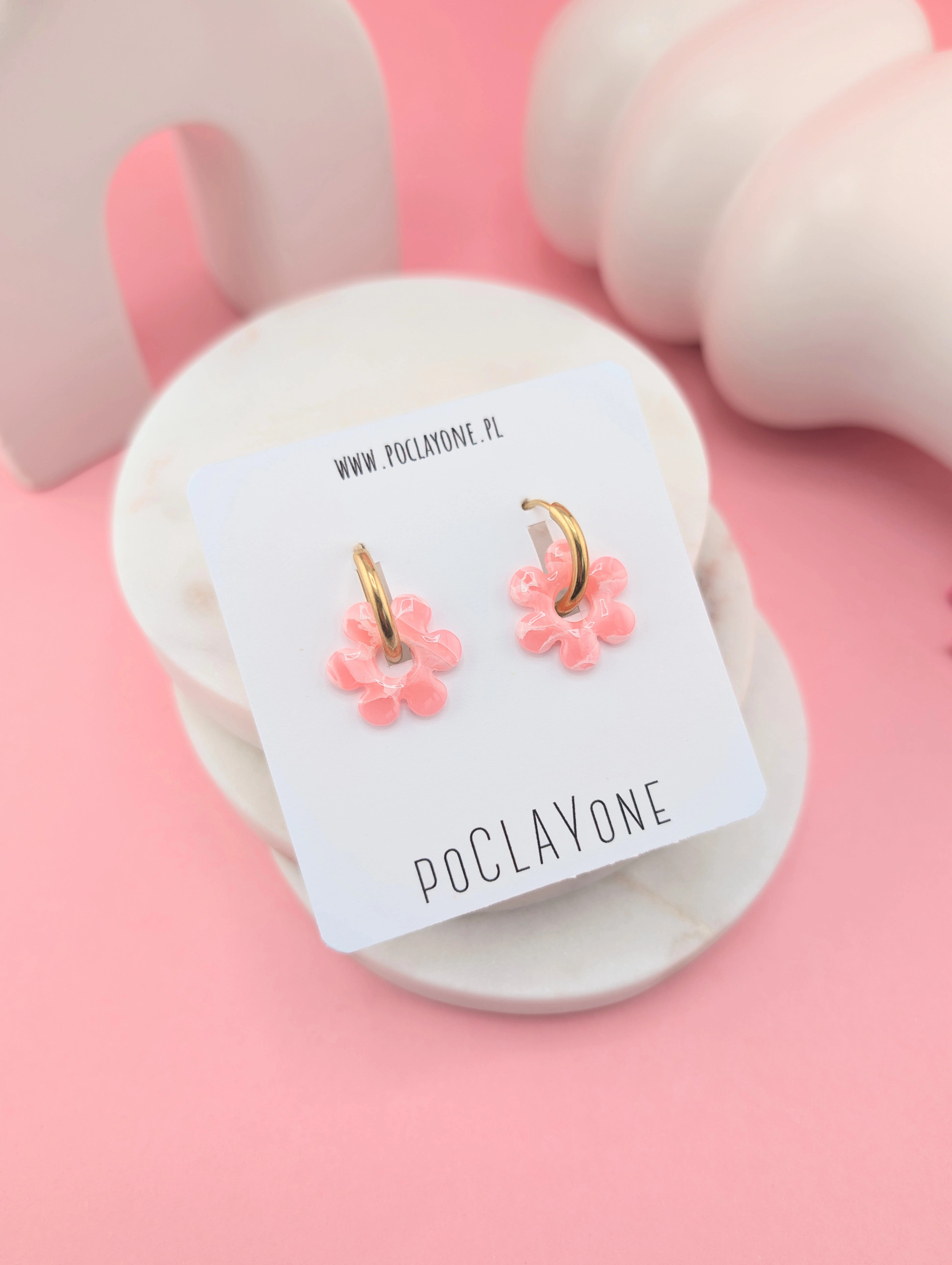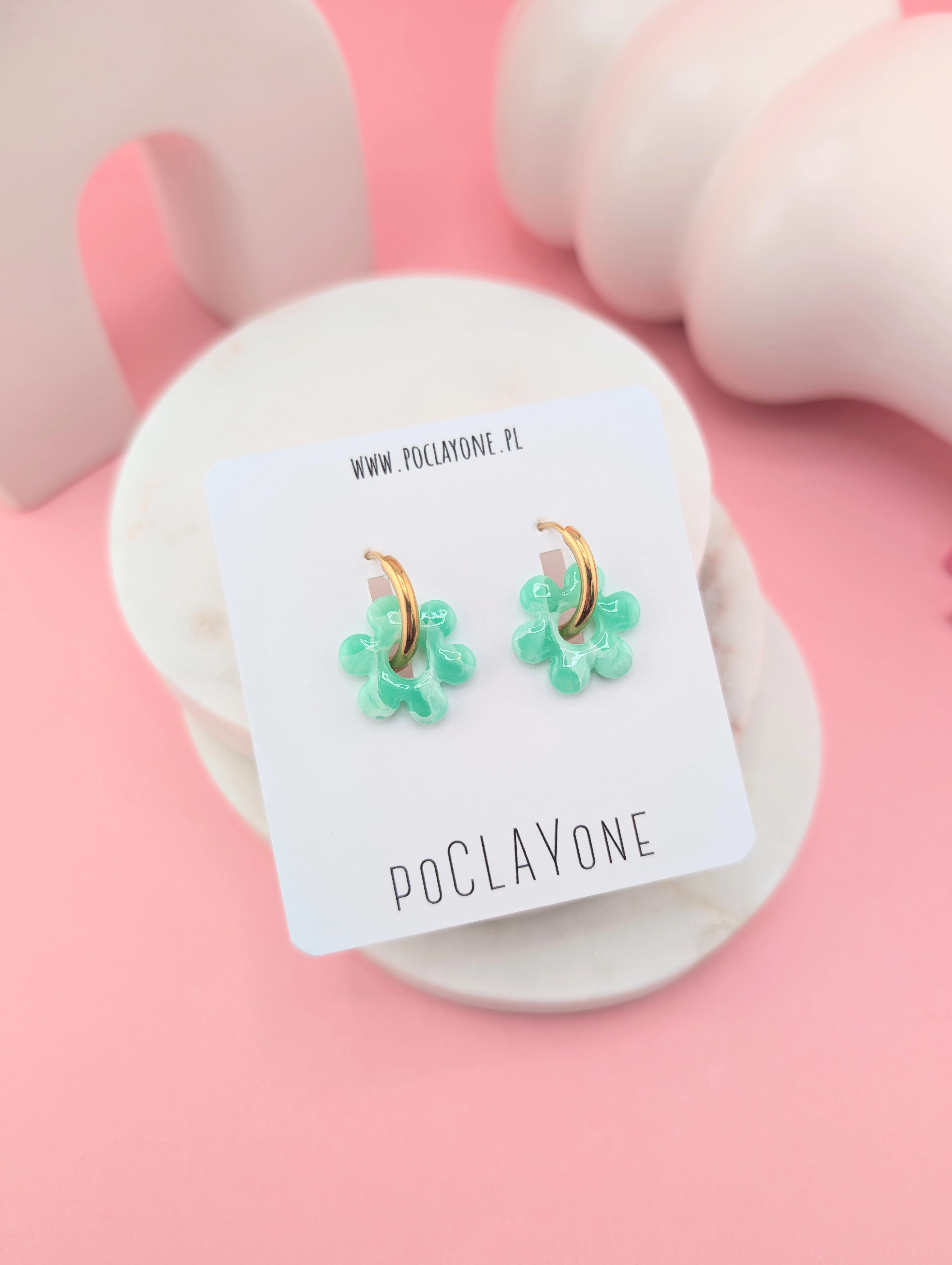 Cukierkowe kolczyki kwiatuszki w odcieniach różu, limonki i mięty, wykonane metodą marmurkową. Osadzone na okrągłych biglach (19 mm), możliwość noszenia z kwiatuszkiem lub solo.