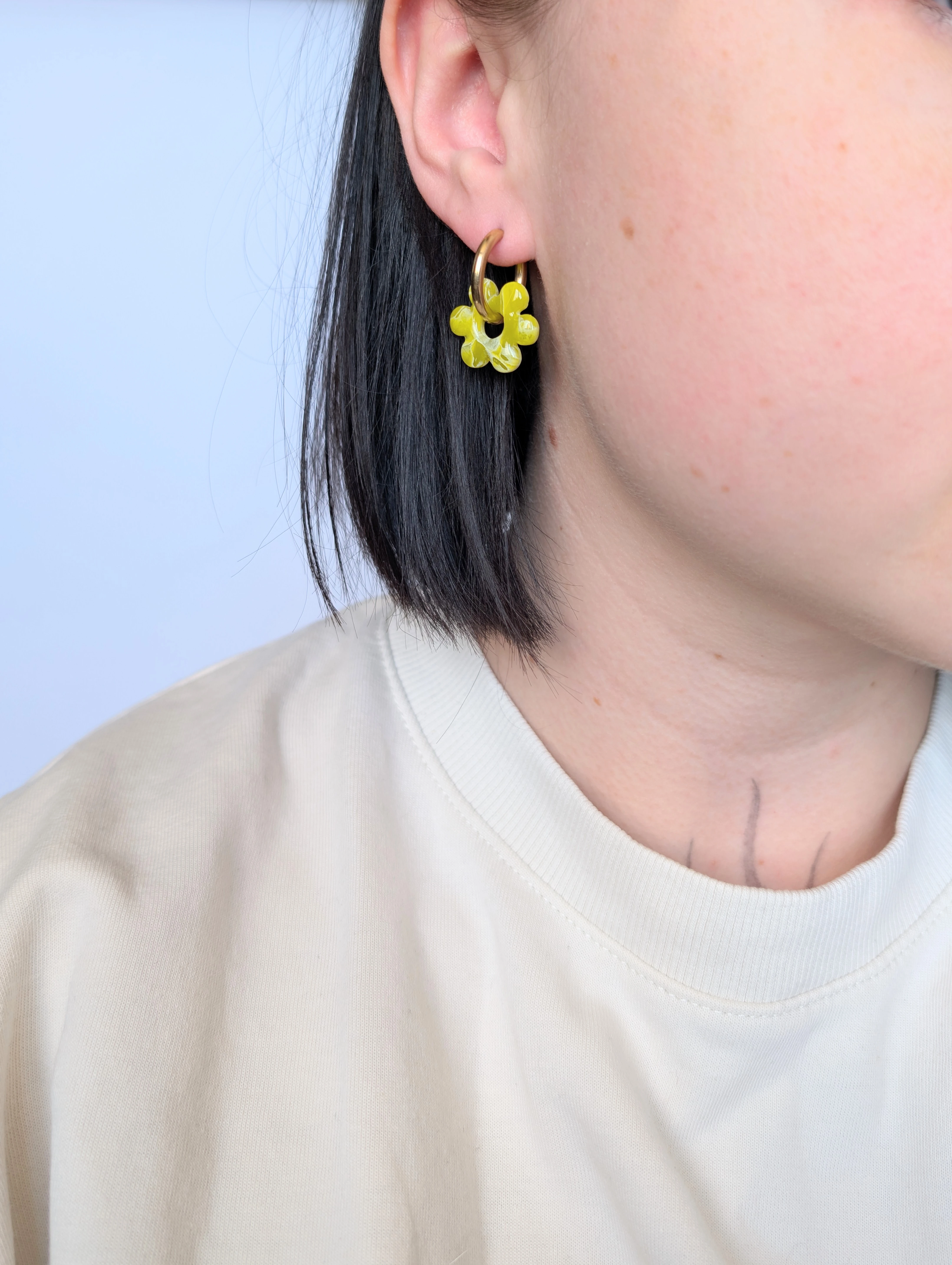 Dzięki przemyślanej konstrukcji kolczyki można nosić na dwa sposoby – jako pełne kolczyki z kwiatuszkiem lub same minimalistyczne kółeczka, co daje większą swobodę stylizacji.