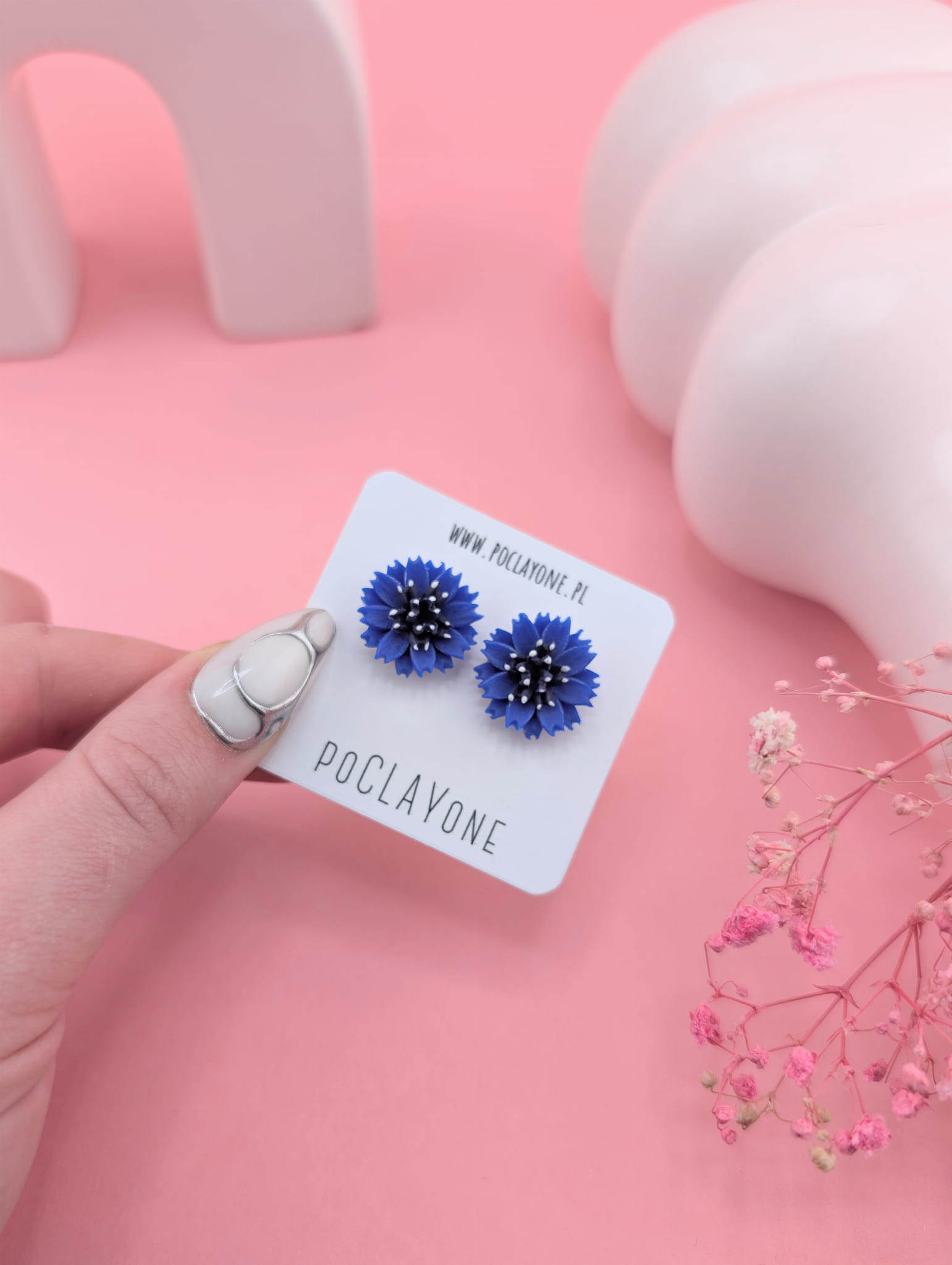 Wprowadź odrobinę letniego nieba do swojej stylizacji dzięki kolczykom sztyftom w kształcie chabrów. Ręcznie modelowane kwiaty z gliny polimerowej oddają każdy detal tych dzikich, polnych kwiatów, emanując naturalnym pięknem i delikatnością. Idealne do codziennych oraz eleganckich, romantycznych stylizacji.