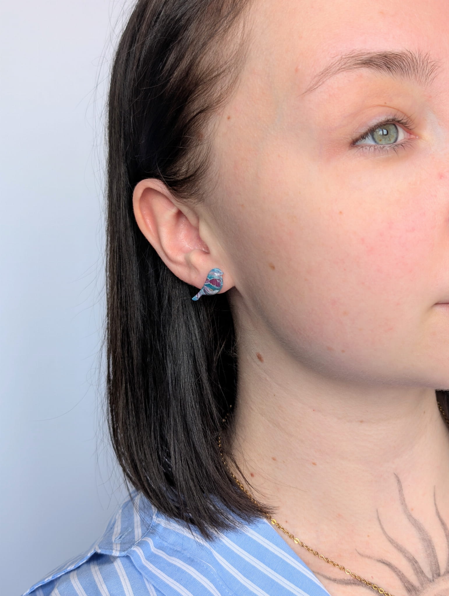 Malutkie kolczyki ptaszki Lagoon Mist w marmurkowych kolorach turkusu, niebieskiego i różu. Każda para jest ręcznie wykonana i występuje tylko w jednym egzemplarzu.