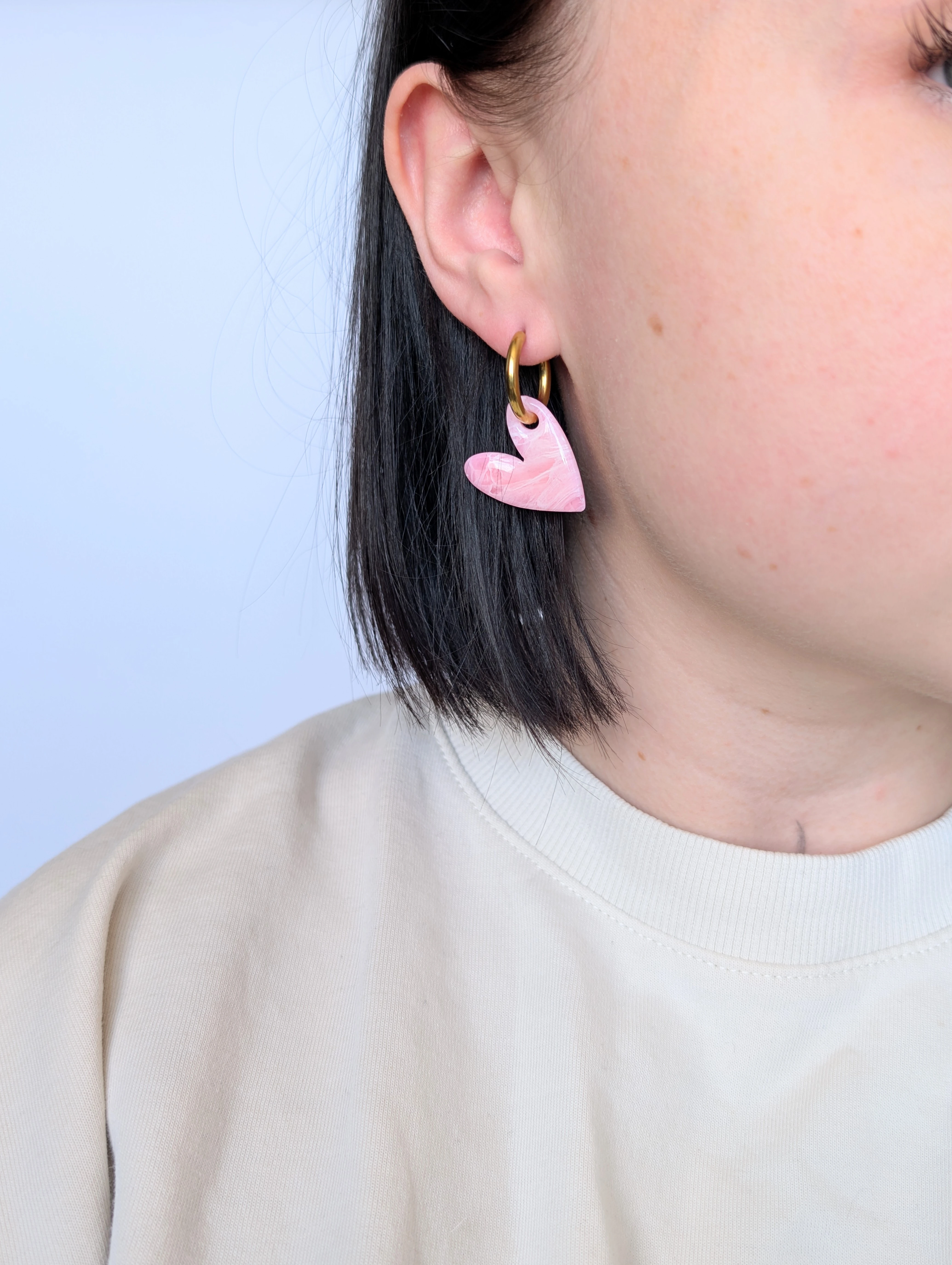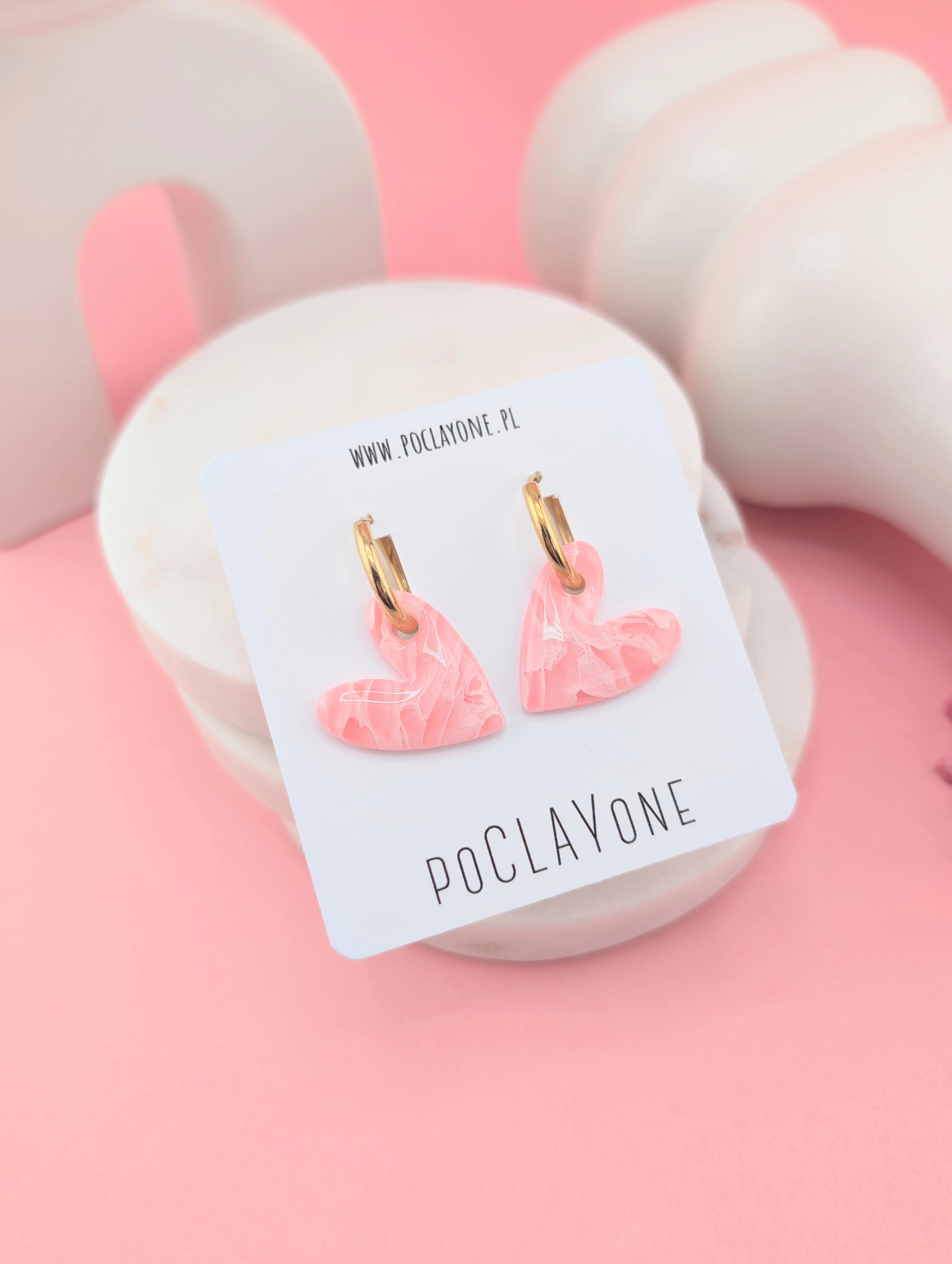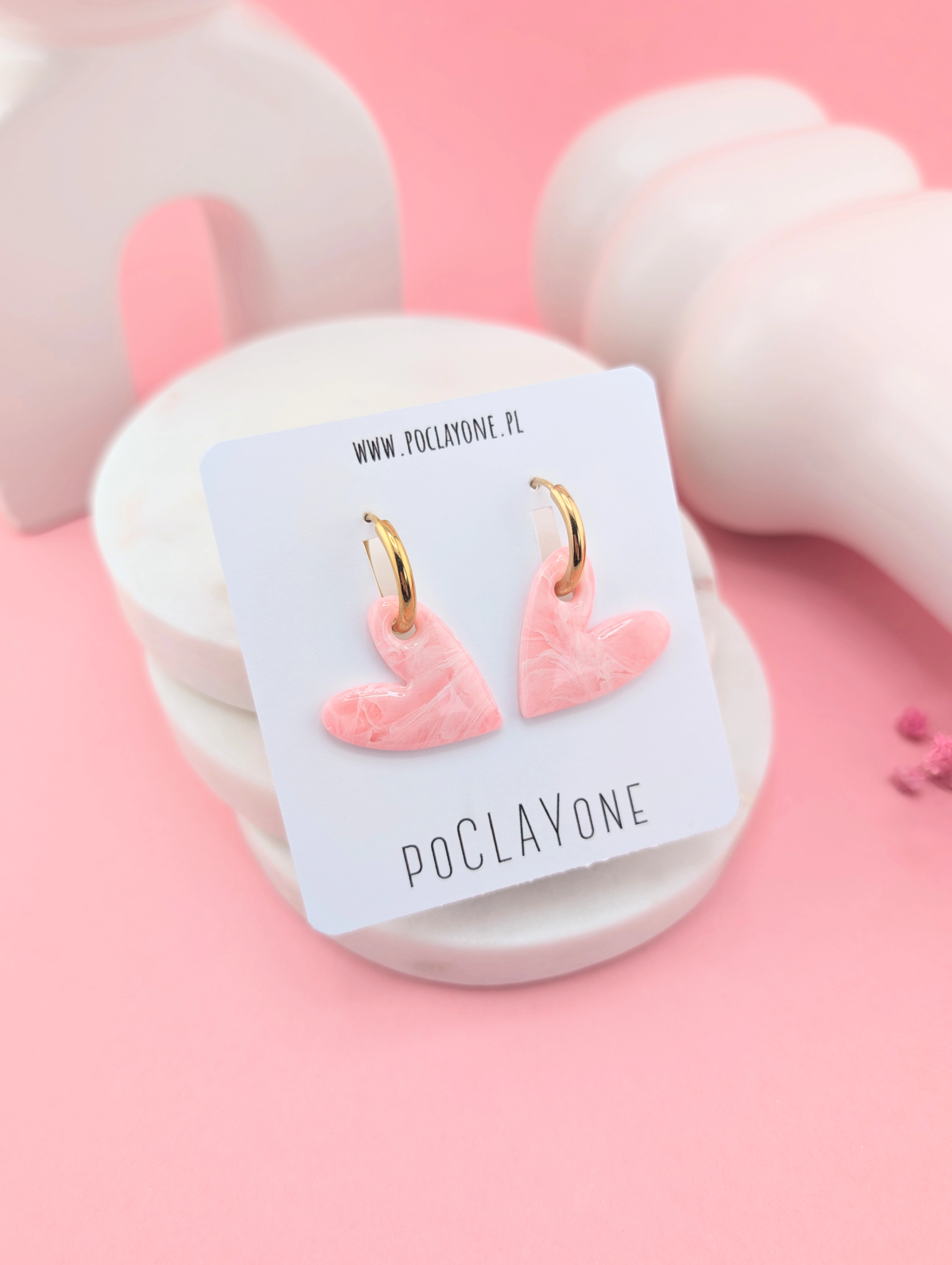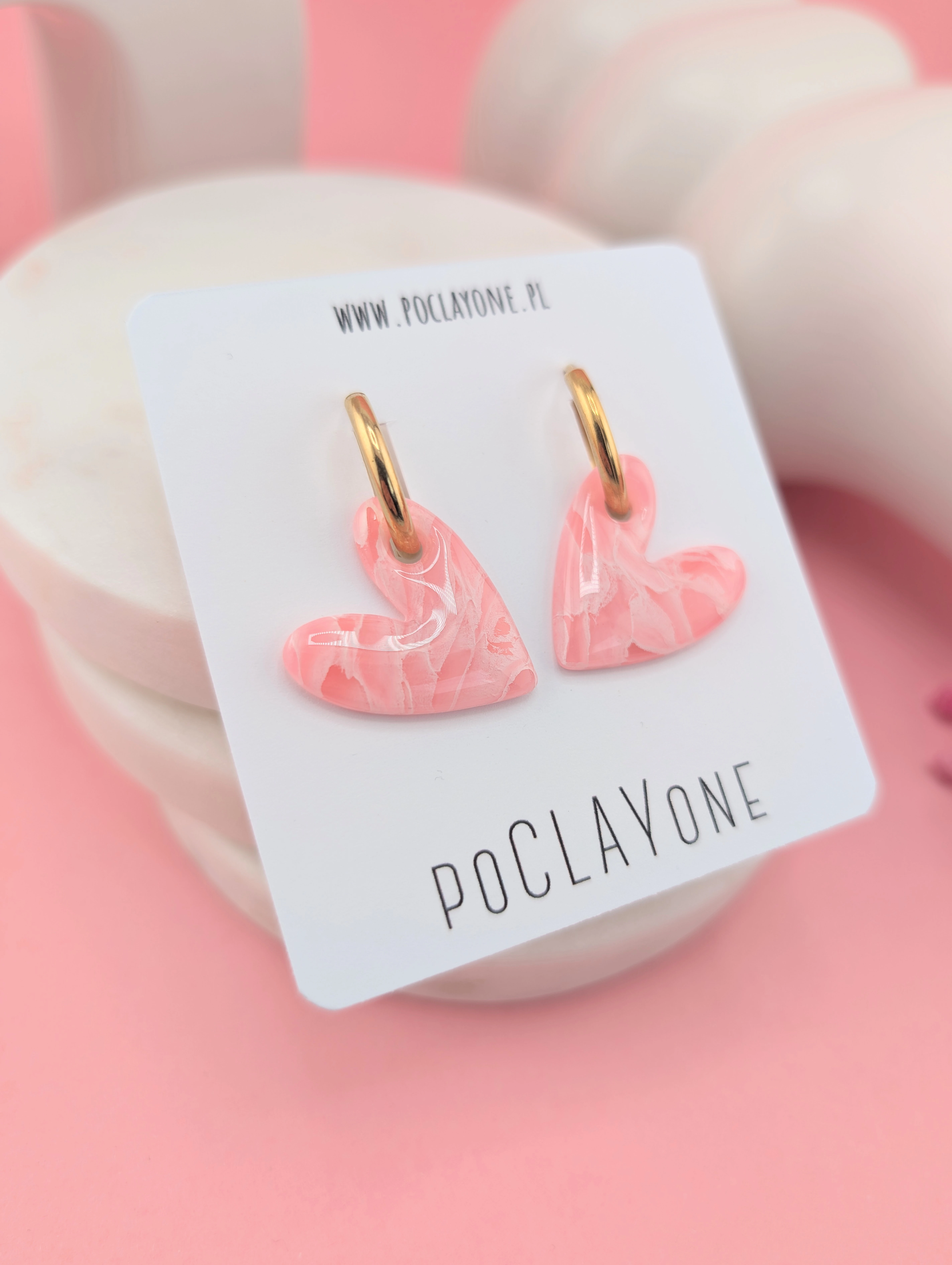 Kolczyki serduszka różowy marmurek na okrągłych biglach. Delikatne, romantyczne i pełne uroku – idealne na co dzień i na wyjątkowe okazje.