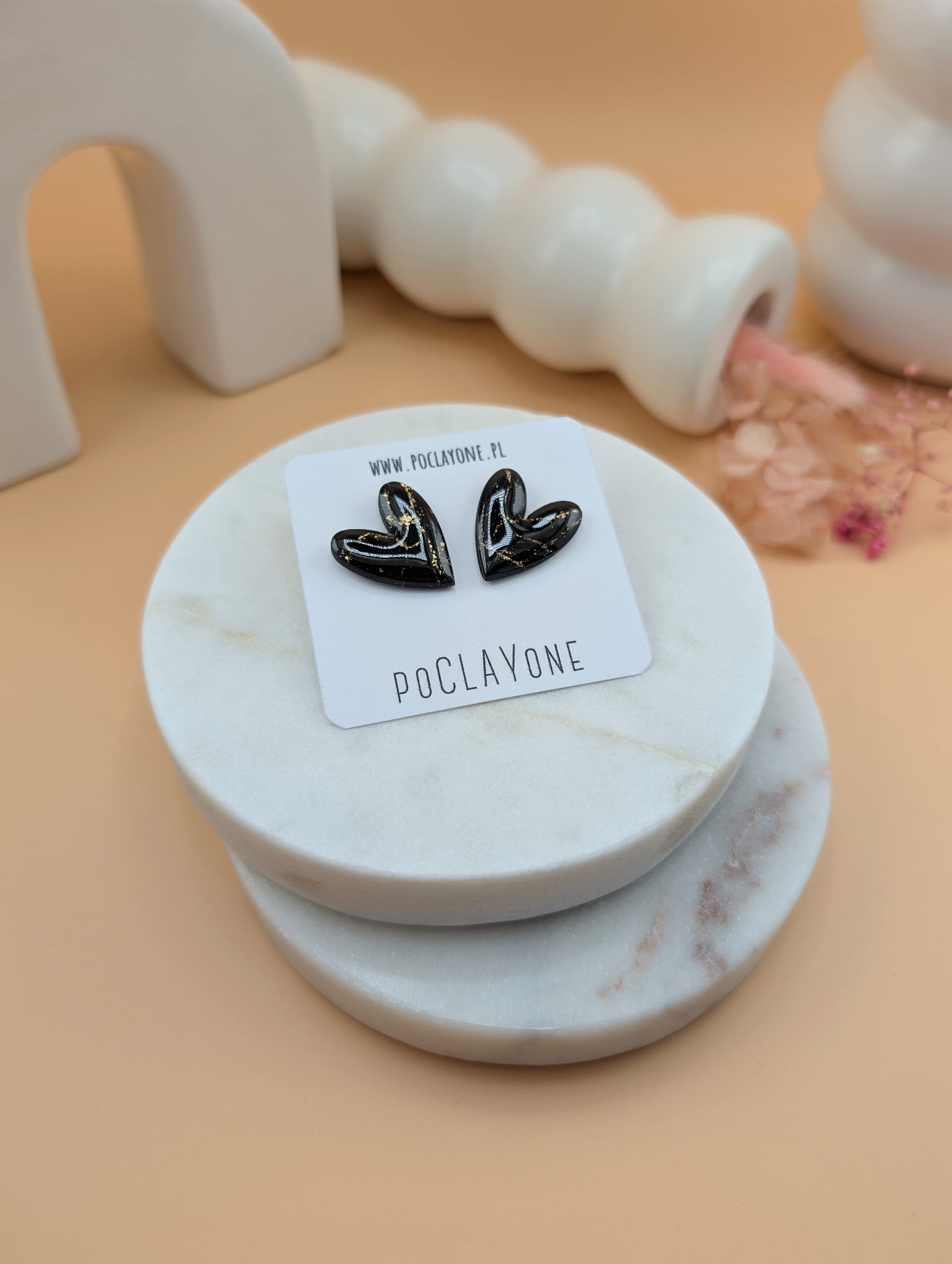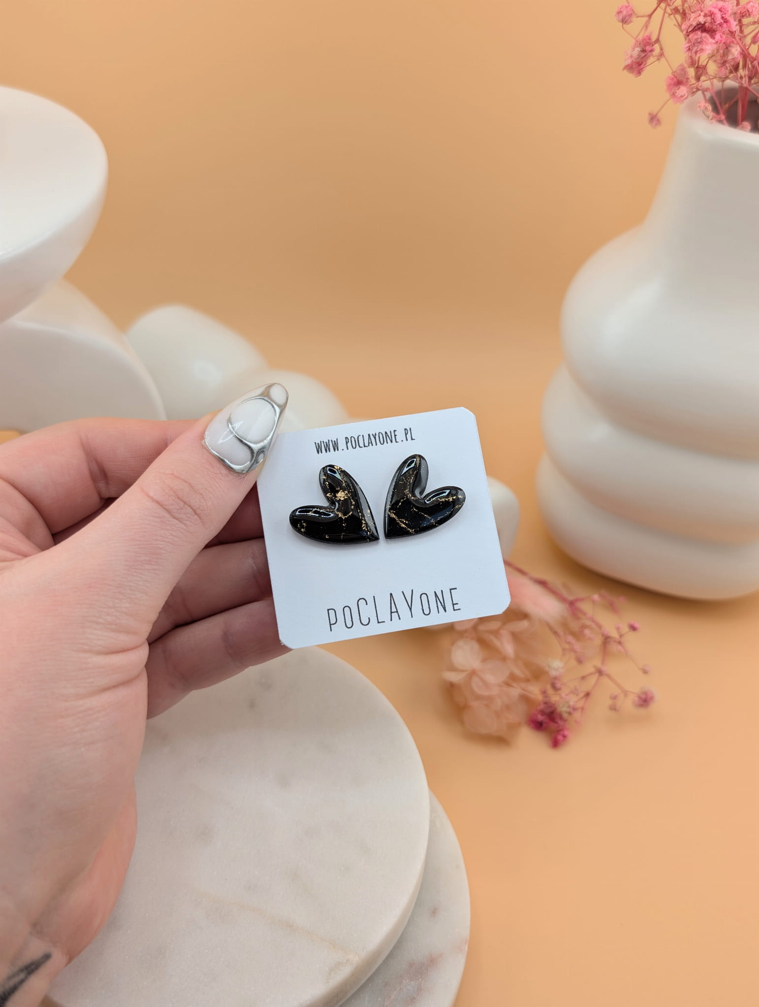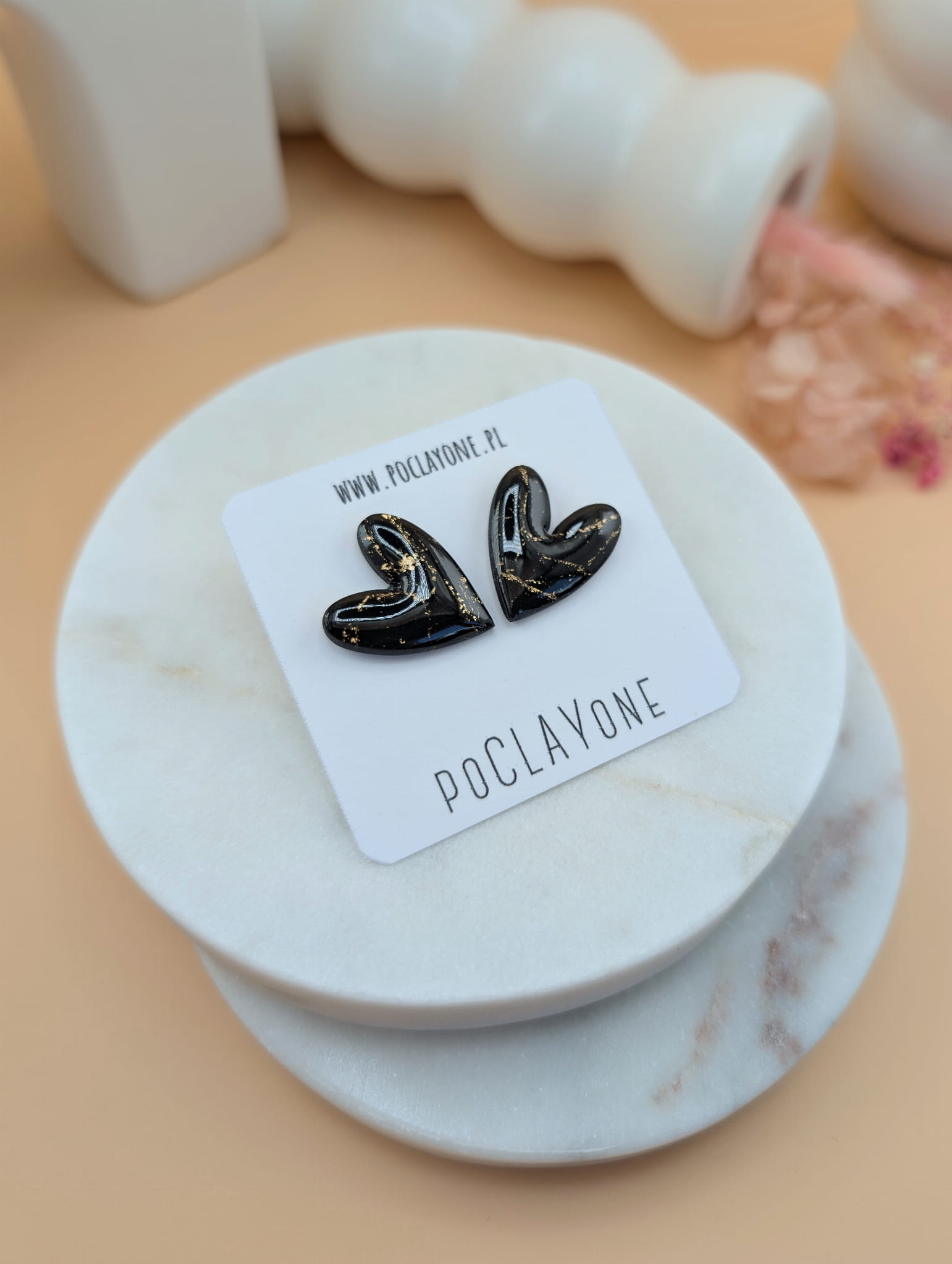 Każda para została ręcznie wykonana z gliny polimerowej FIMO i wykończona stalą chirurgiczną wysokiej jakości, co zapewnia komfort noszenia i trwałość. Technika ręcznego modelowania sprawia, że nie ma dwóch identycznych egzemplarzy, a klasyczny kształt serca pozostaje uniwersalny.