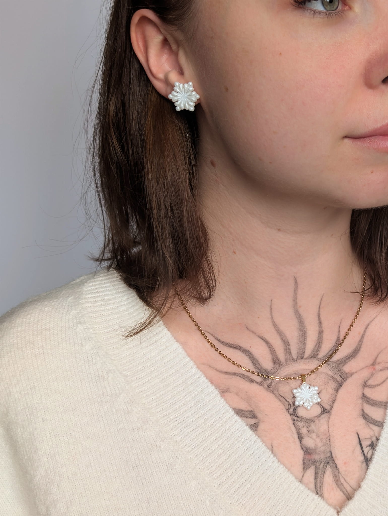 Kolczyki w kształcie większych śnieżynek w perłowym wykończeniu to wyjątkowo efektowny dodatek, który podkreśli każdą zimową stylizację. Dzięki większym rozmiarom są bardziej widoczne, a jednocześnie lekkie i wygodne w noszeniu, idealne na codzienne i świąteczne okazje.