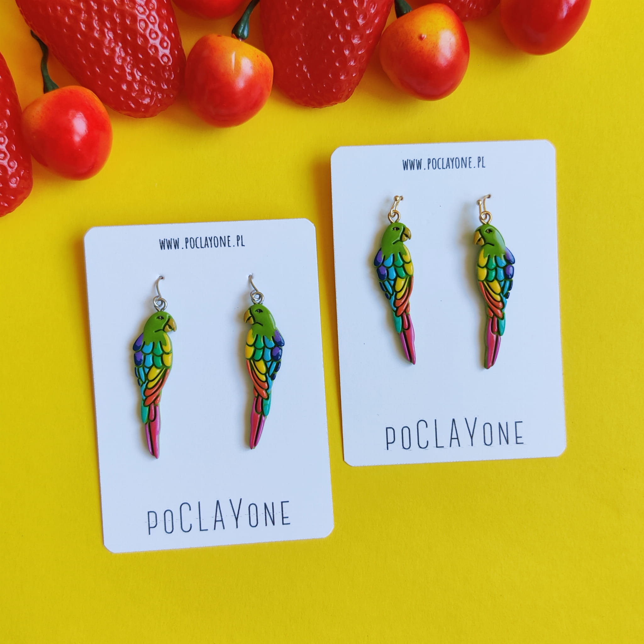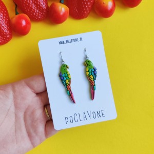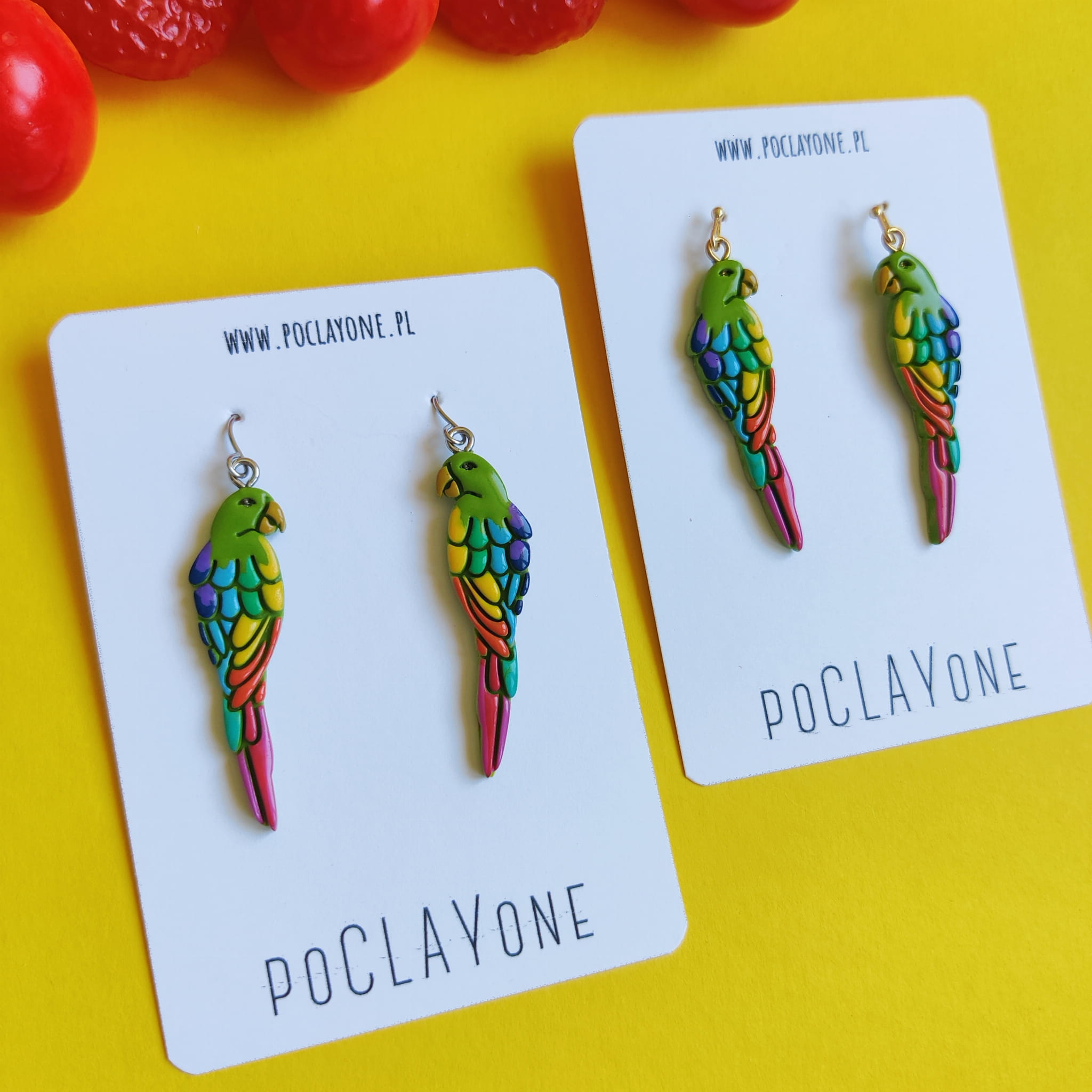 Kolorowe kolczyki papugi wiszące – tropikalna letnia biżuteria handmade