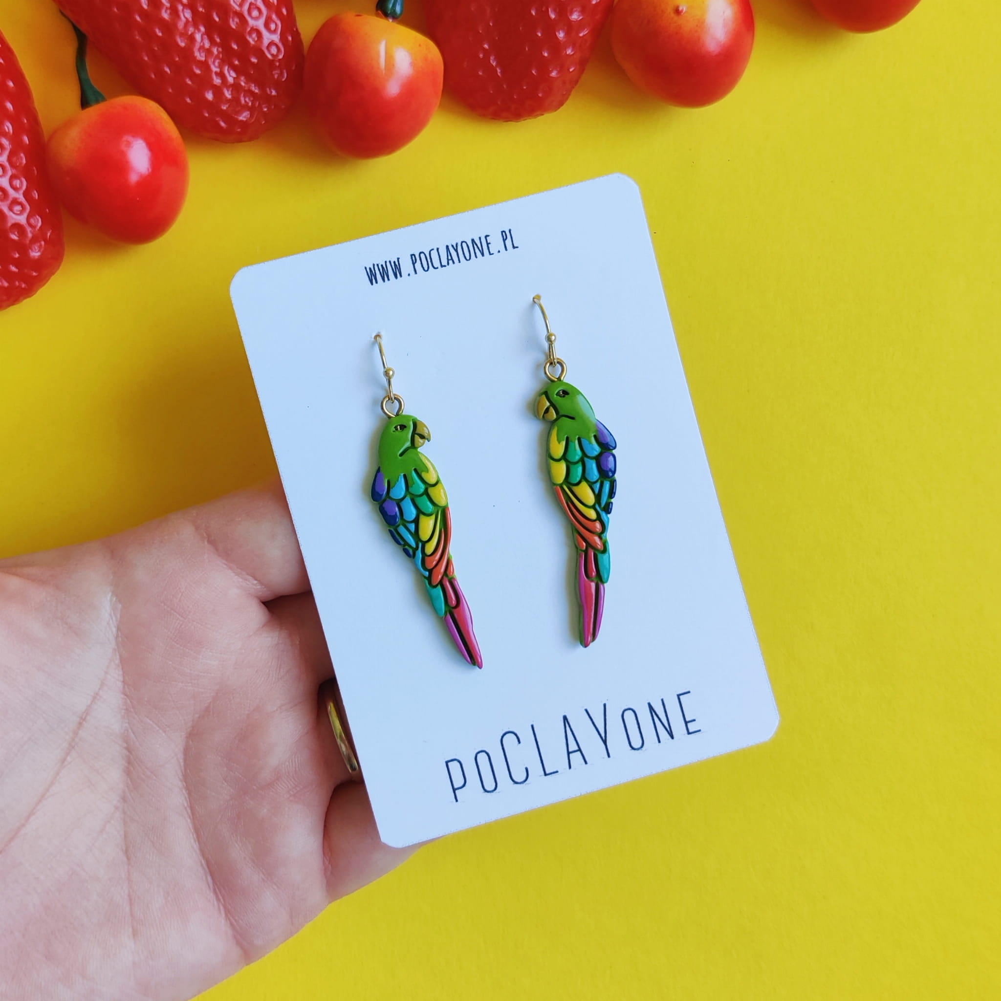 Ręcznie wykonane, wiszące kolczyki papugi w żywych, letnich kolorach. Idealne na wakacje i tropikalne stylizacje.