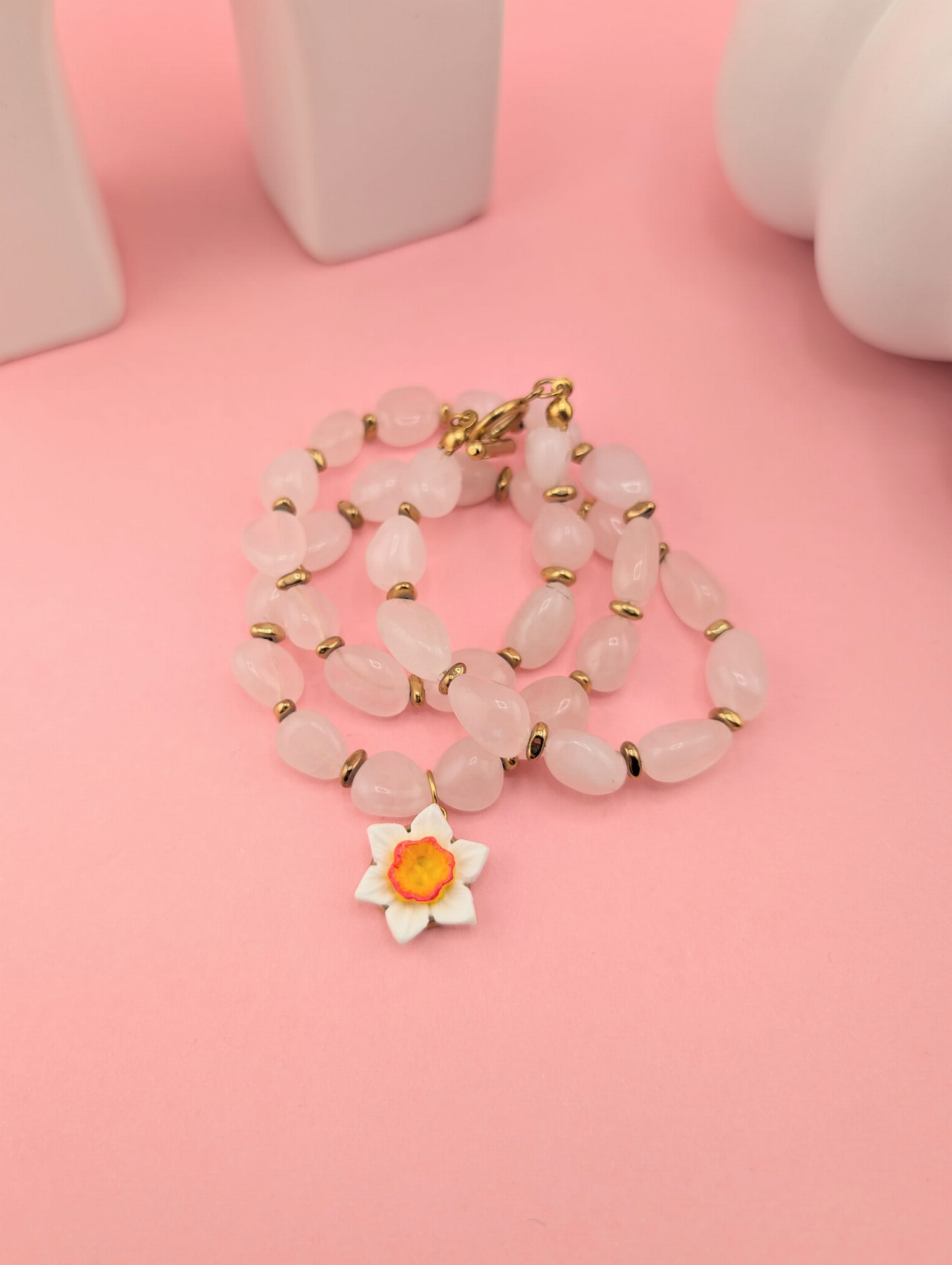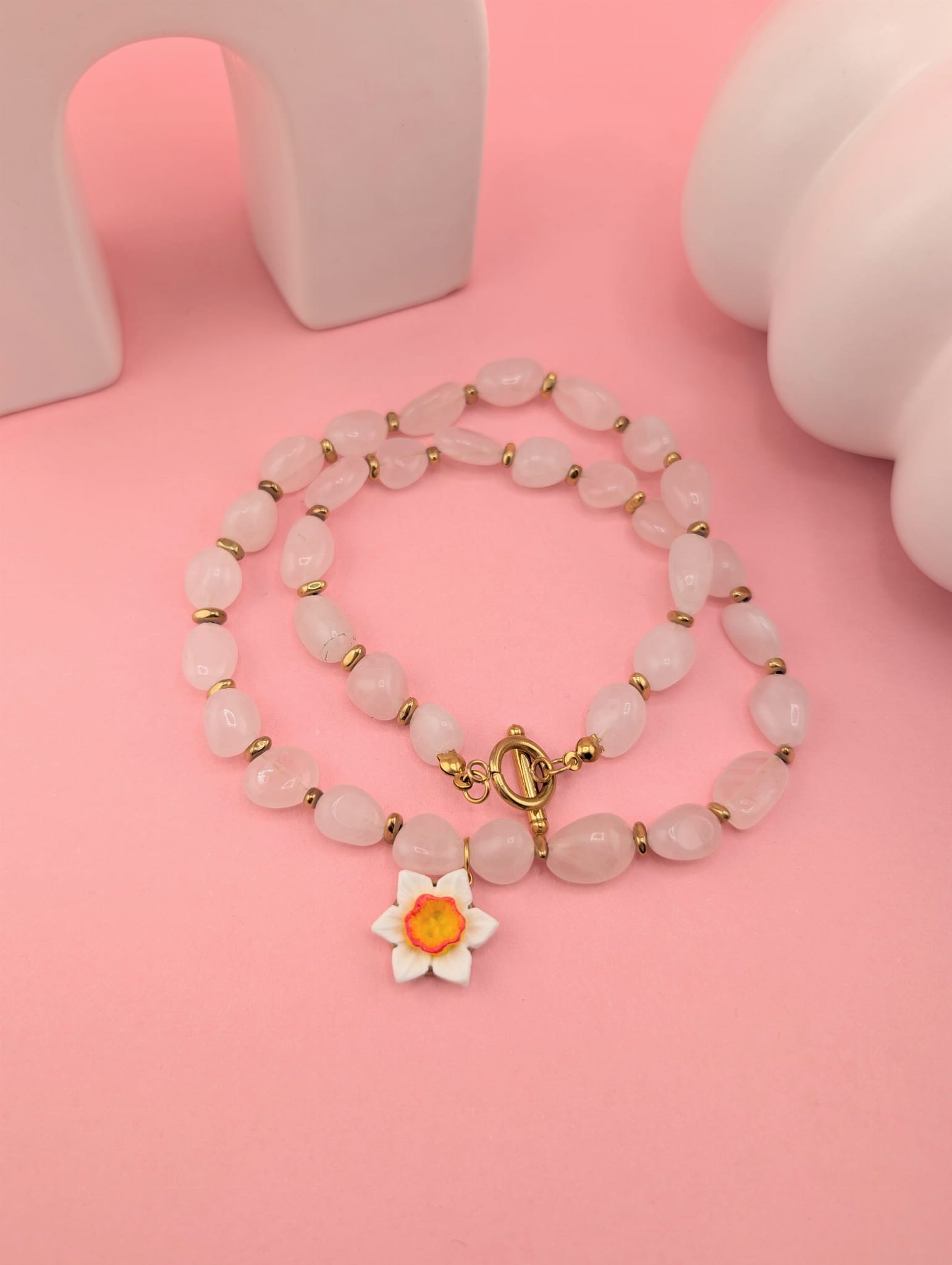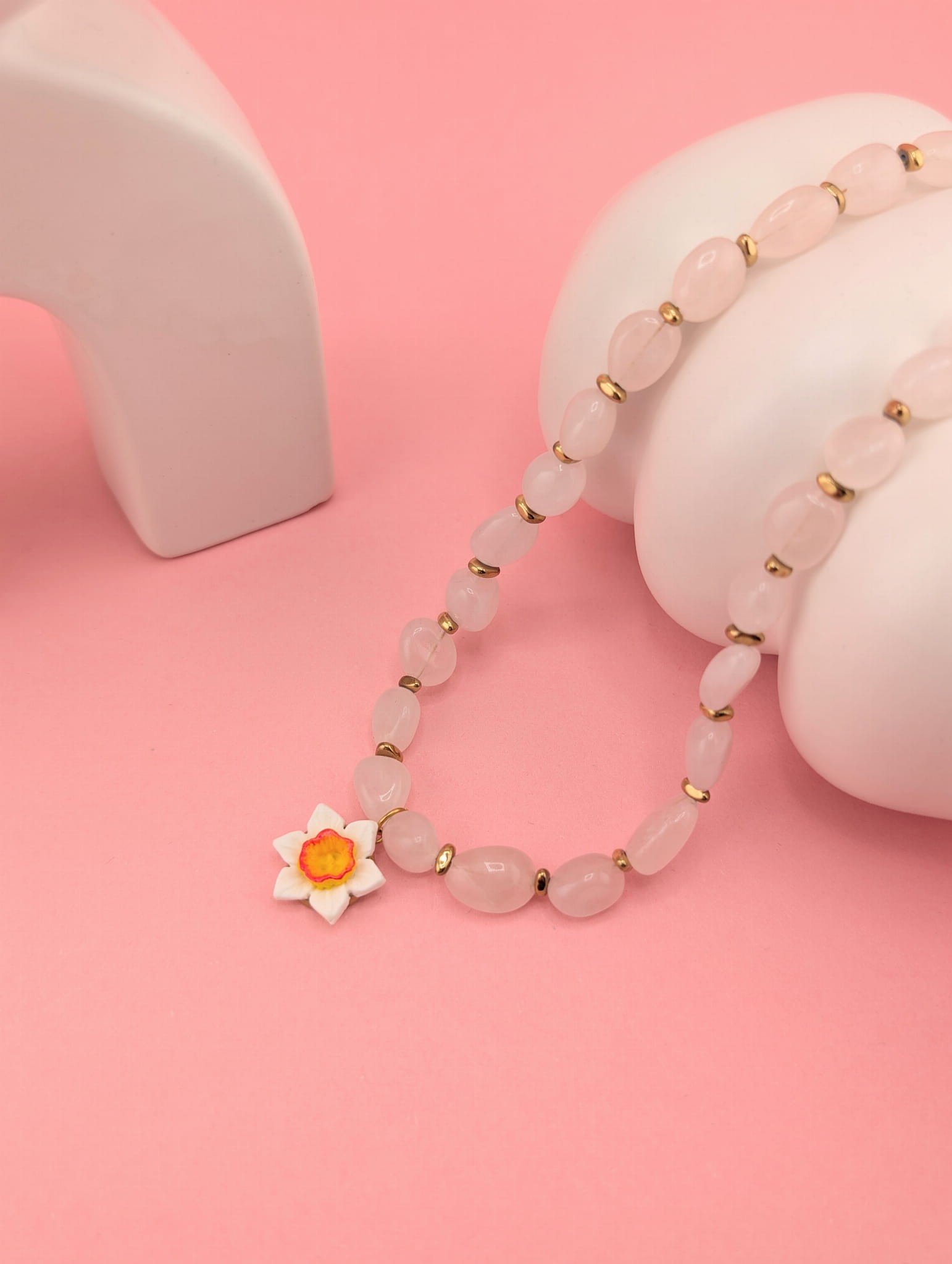 Masywny naszyjnik z kwarcu różowego i złotego hematytu z zawieszką białego żonkila. Wiosenna, elegancka biżuteria o długości około 48 cm, idealna do wyróżniających się stylizacji.