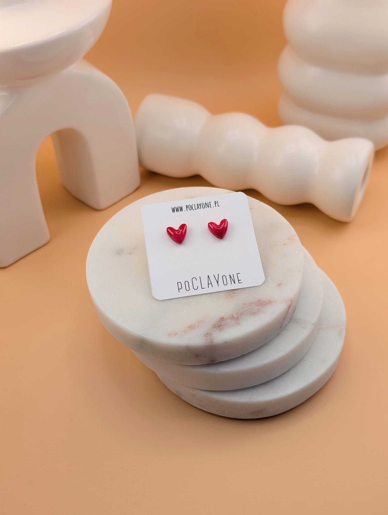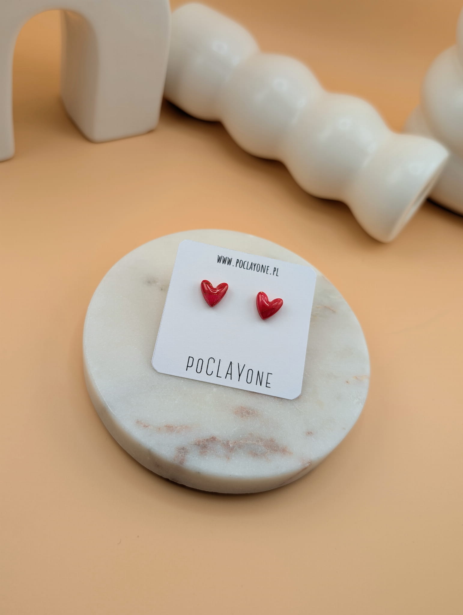 Najmniejsze mini kolczyki serduszka o wysokości 8 mm w czerwono-złotej marmurkowej kolorystyce z subtelnym perłowym połyskiem. Idealne jako kolczyki do drugiego przekłucia lub delikatna biżuteria walentynkowa na co dzień.