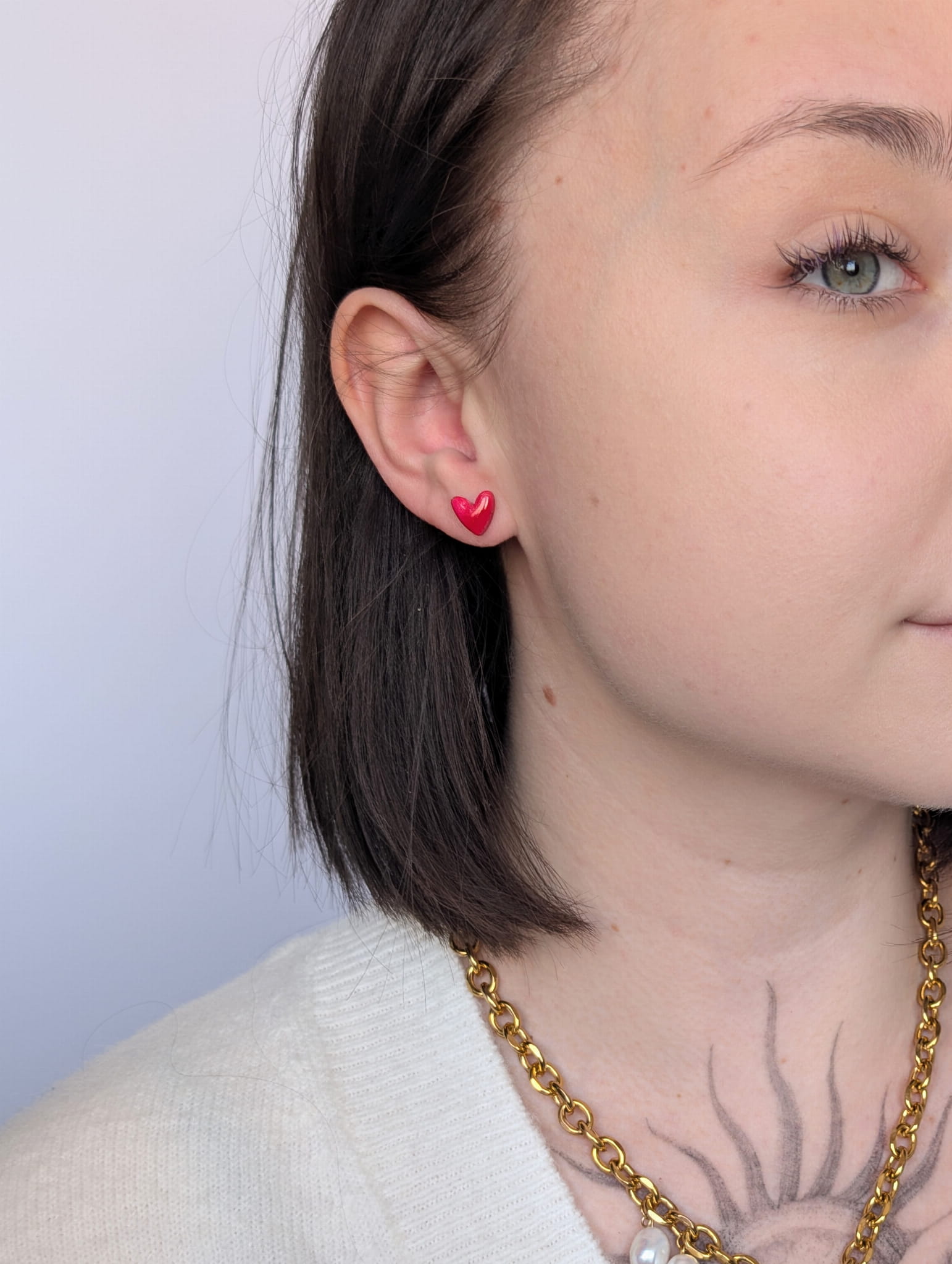 Te miniaturowe kolczyki serduszka 8 mm to najbardziej subtelna wersja romantycznej biżuterii z kolekcji walentynkowej. Ich niewielki rozmiar sprawia, że są niemal niewyczuwalne na uchu, a jednocześnie pięknie dopełniają stylizację delikatnym czerwono-złotym akcentem.