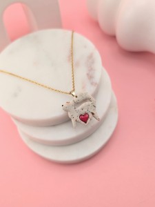 Naszyjnik z zawieszką w kształcie piaskowego kotka trzymającego czerwone serduszko to wyjątkowy i zabawny dodatek dla miłośniczek kotów. Delikatny i subtelny motyw wprowadza radosny akcent do codziennych stylizacji.