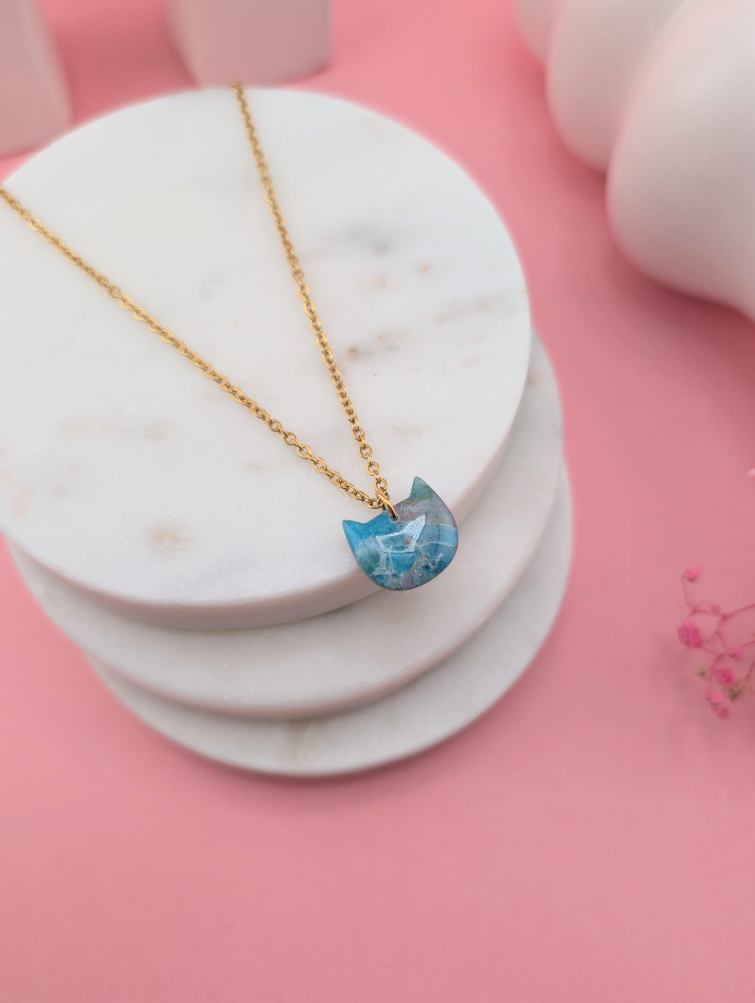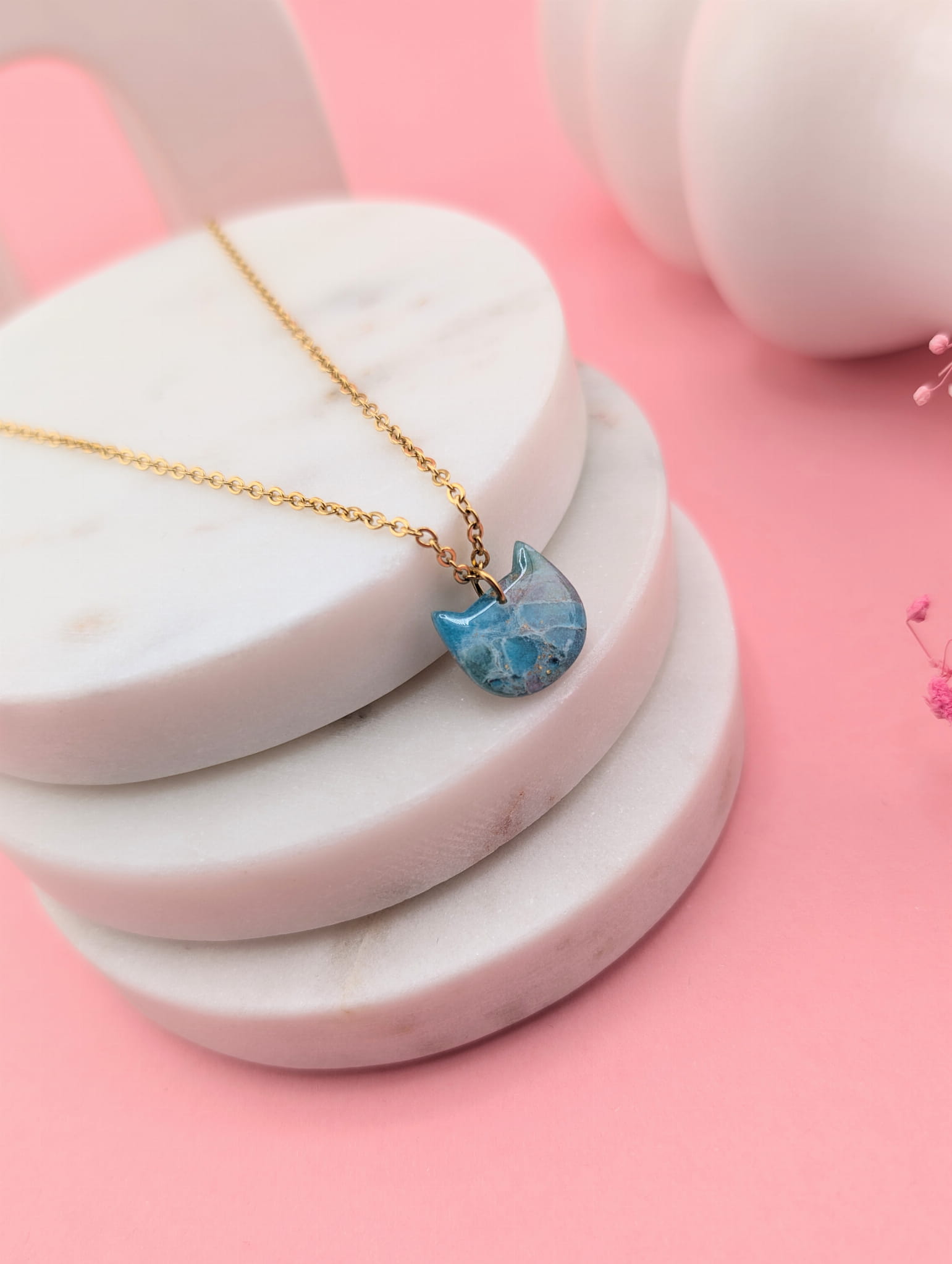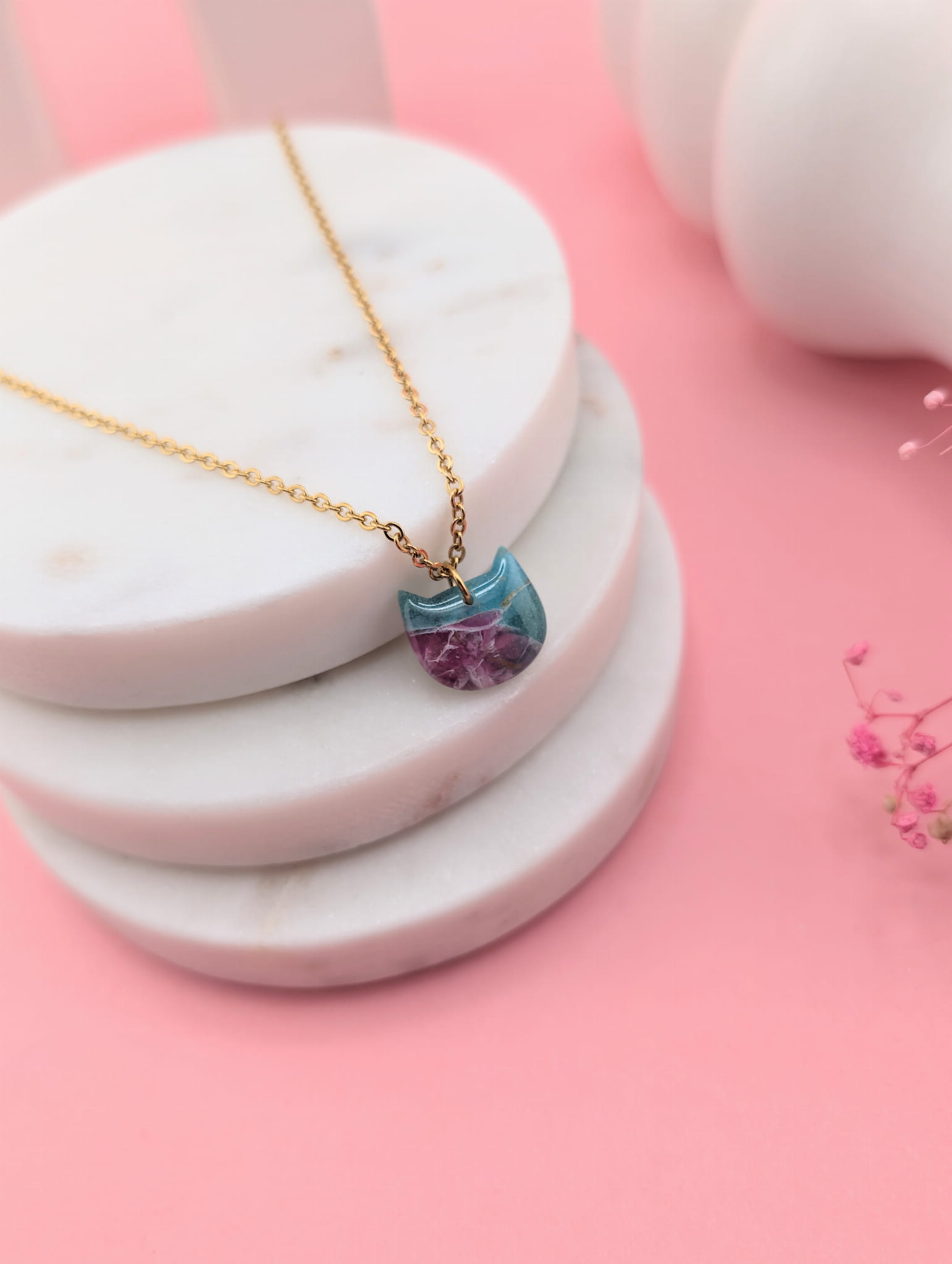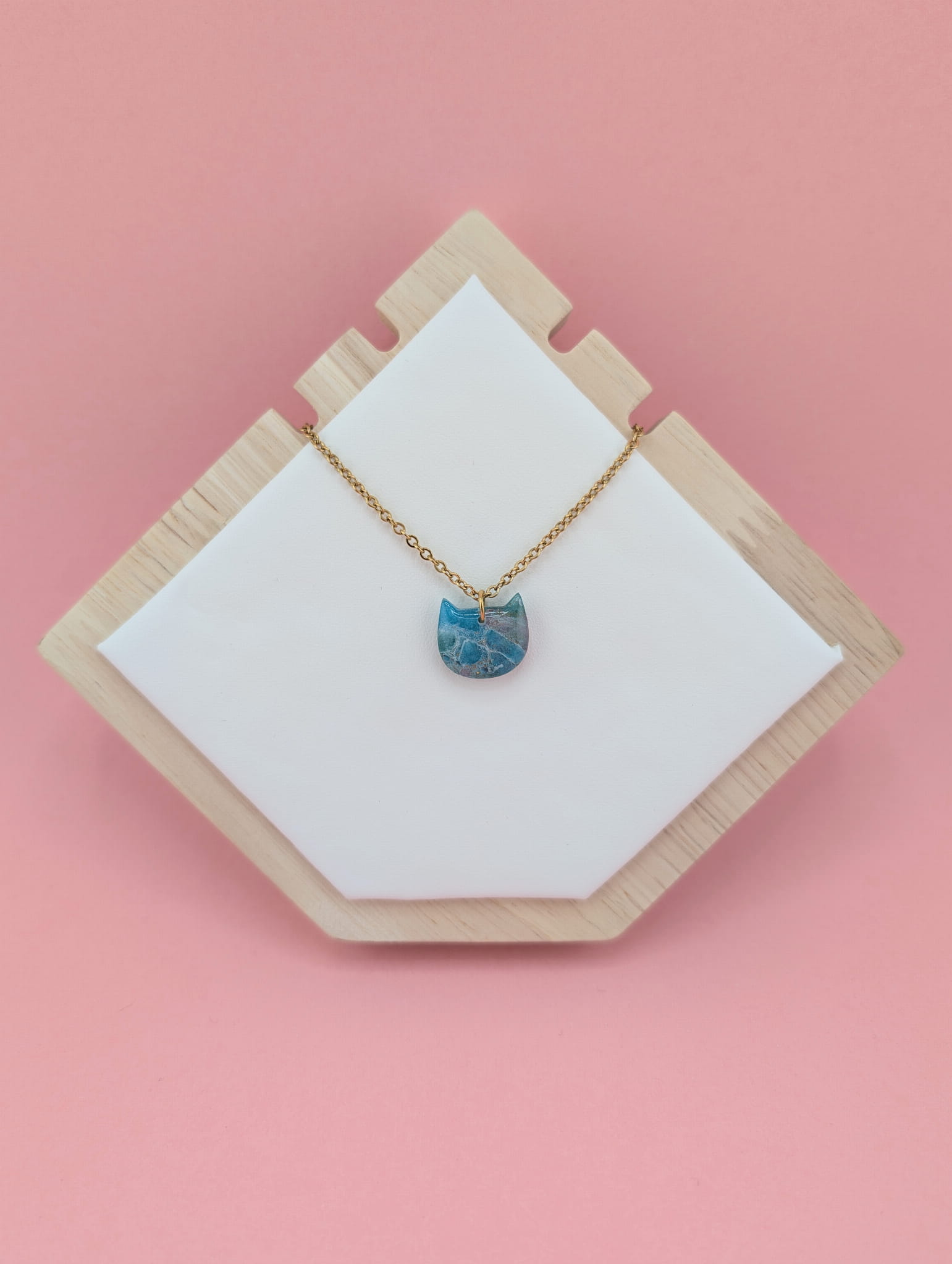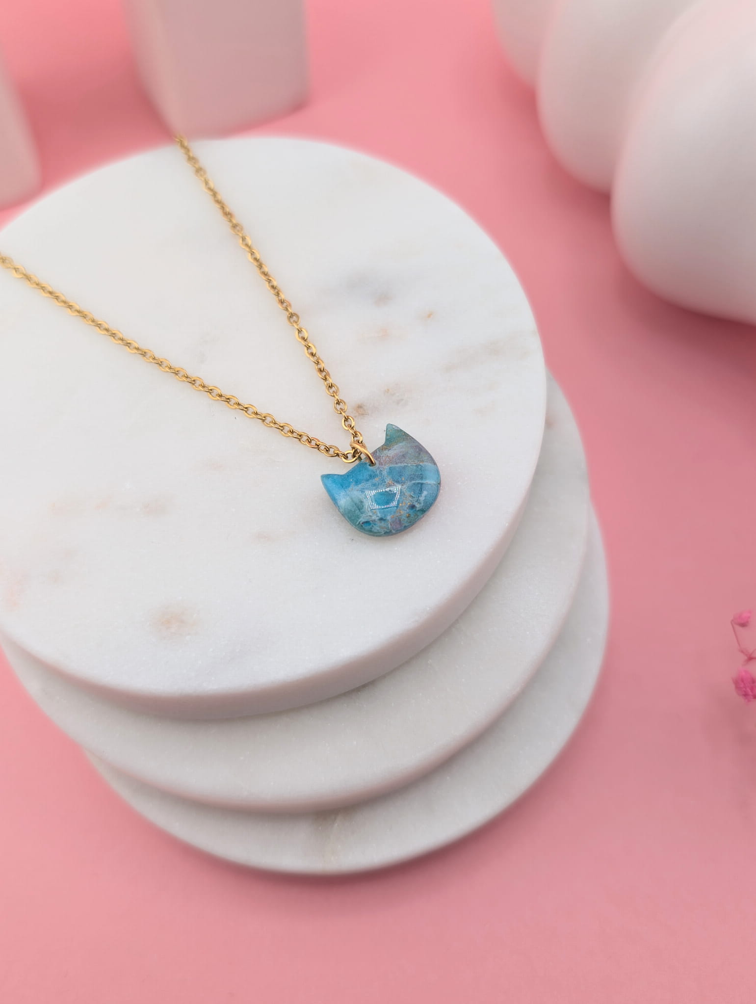 Naszyjnik Lagoon Mist z zawieszką w kształcie kociej głowy. Dwustronny marmurkowy wzór – z jednej strony turkusowo-niebieski, z drugiej różowo-niebieski. Łańcuszek o długości około 45 cm.
