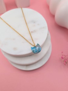 Naszyjnik z kolekcji Lagoon Mist zachwyca marmurkową kompozycją kolorów inspirowanych magiczną laguną. Odcienie turkusu, niebieskiego i różu tworzą efekt przypominający bajkowy kamień.