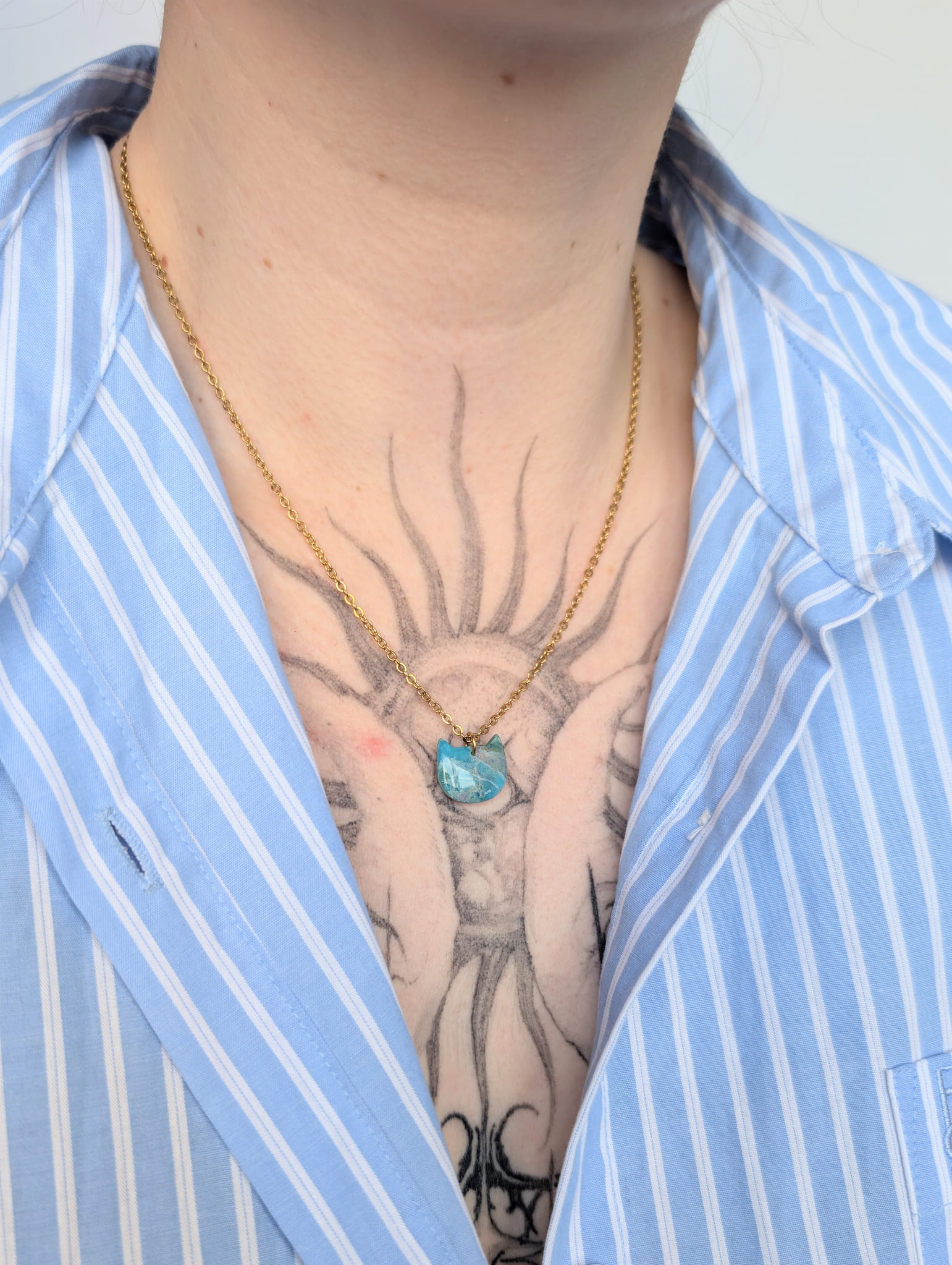 Zawieszka w kształcie kociej głowy jest dwustronna. Z jednej strony utrzymana jest w turkusowo-niebieskiej kolorystyce, z drugiej w odcieniach różowo-niebieskich. Dzięki temu naszyjnik można nosić na dwa sposoby, dopasowując go do stylizacji.