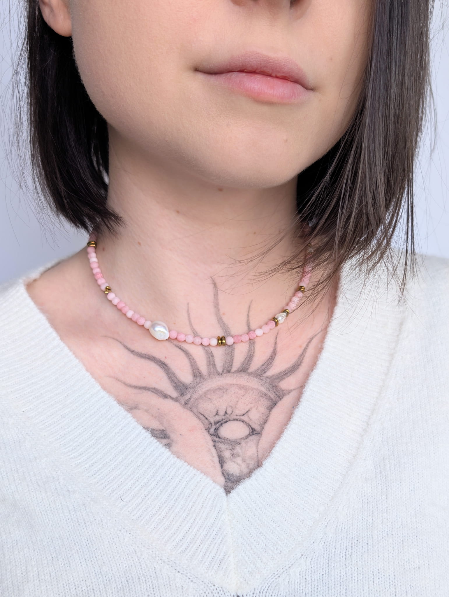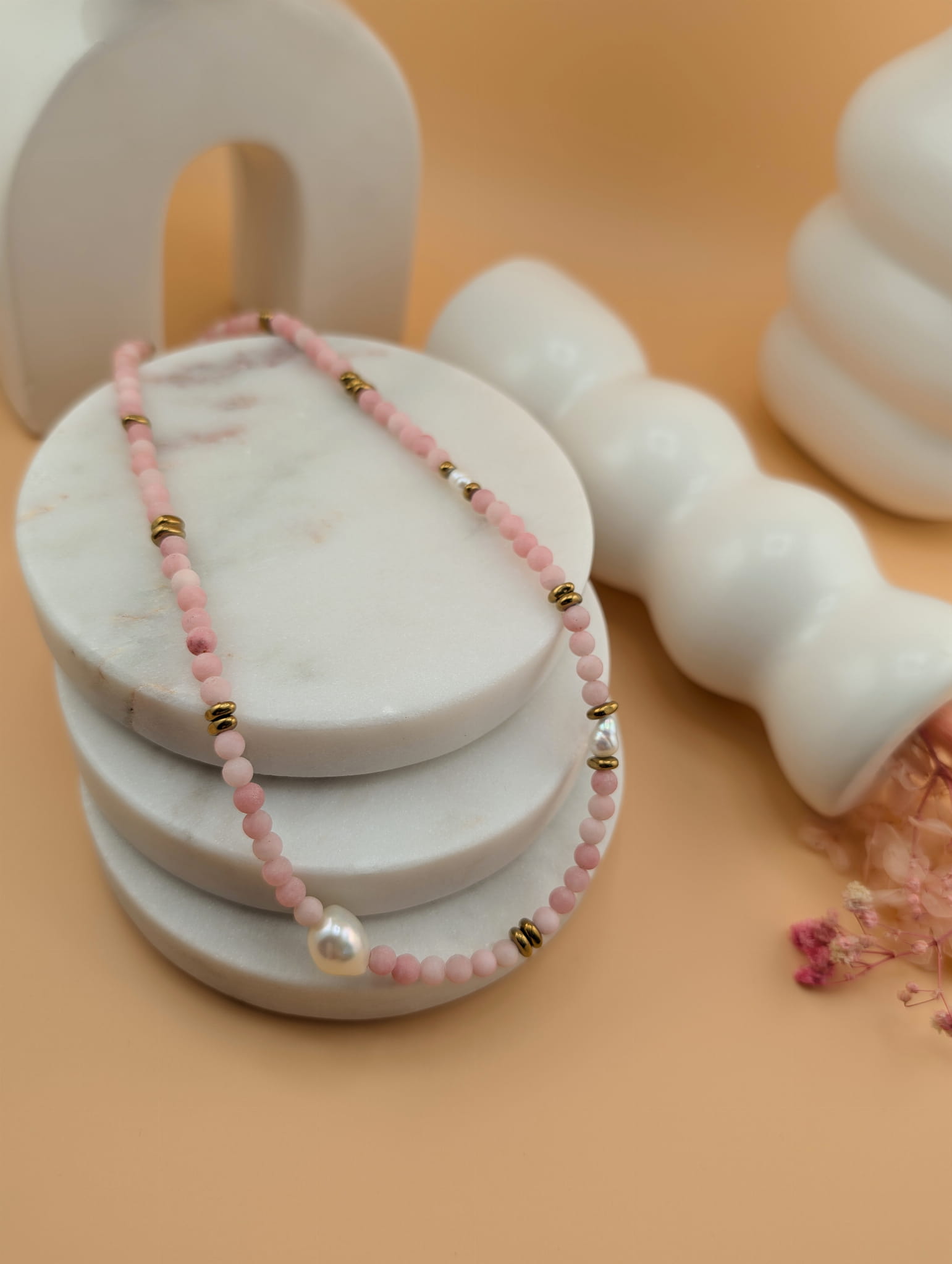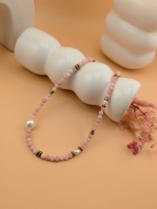 Ten naszyjnik z różowego agatu matowego, złotego hematytu i pereł o długości 41 cm to propozycja dla osób ceniących ręcznie robioną, minimalistyczną i elegancką biżuterię. Delikatny, różowy odcień agatu w połączeniu ze złotym hematytem i perełką tworzy harmonijną i subtelną kompozycję, idealną dla dziewczęcego, romantycznego stylu.