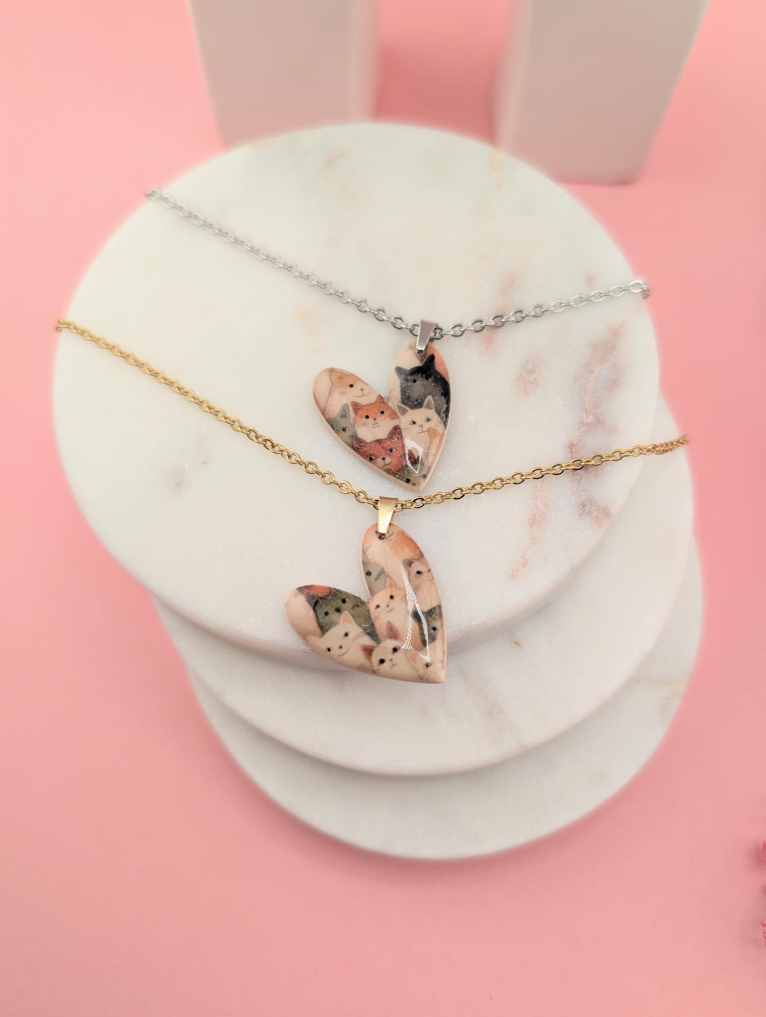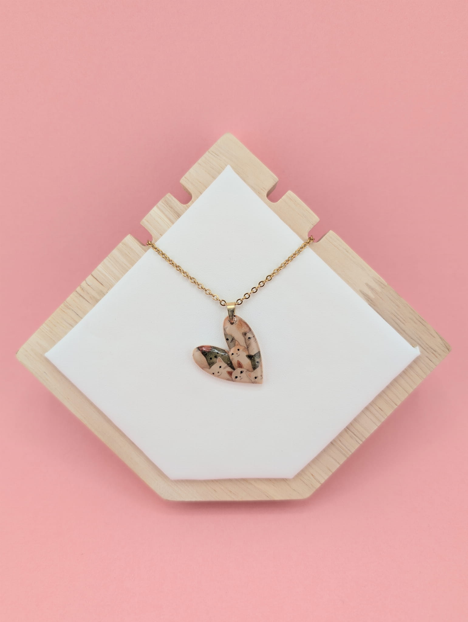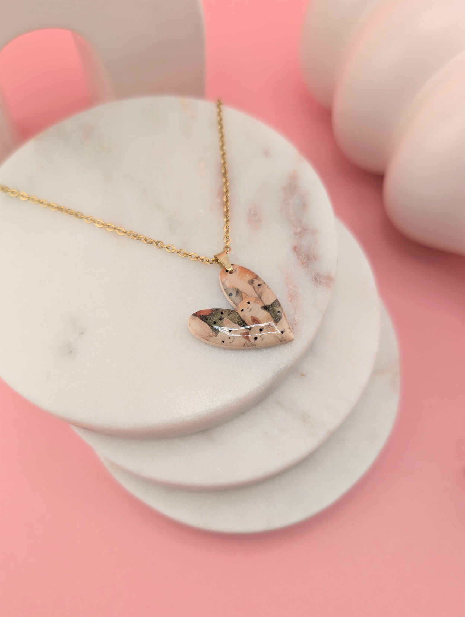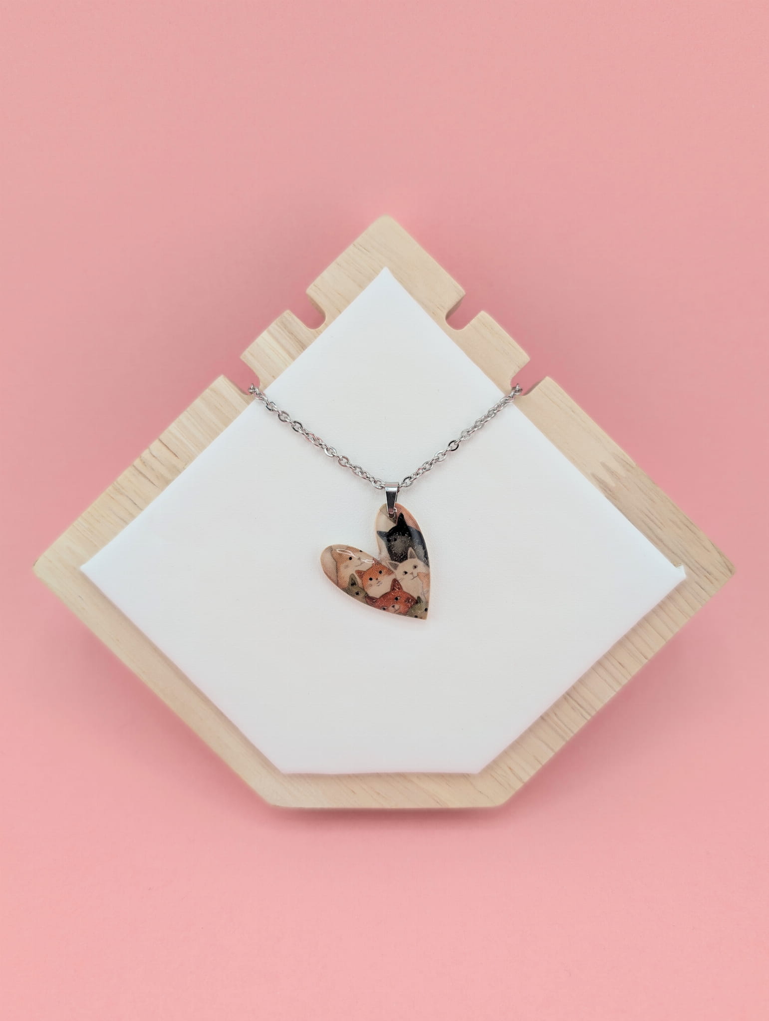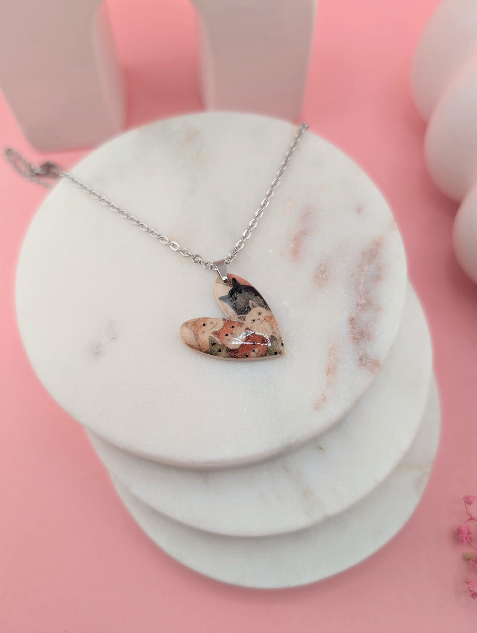 Naszyjnik z zawieszką serce w kocie mordki o wielkości 2,5 cm, pokrytą żywicą, dzięki czemu pięknie połyskuje i jest odporna na ścieranie. Idealny prezent dla każdej kociary i miłośniczki unikatowej biżuterii.