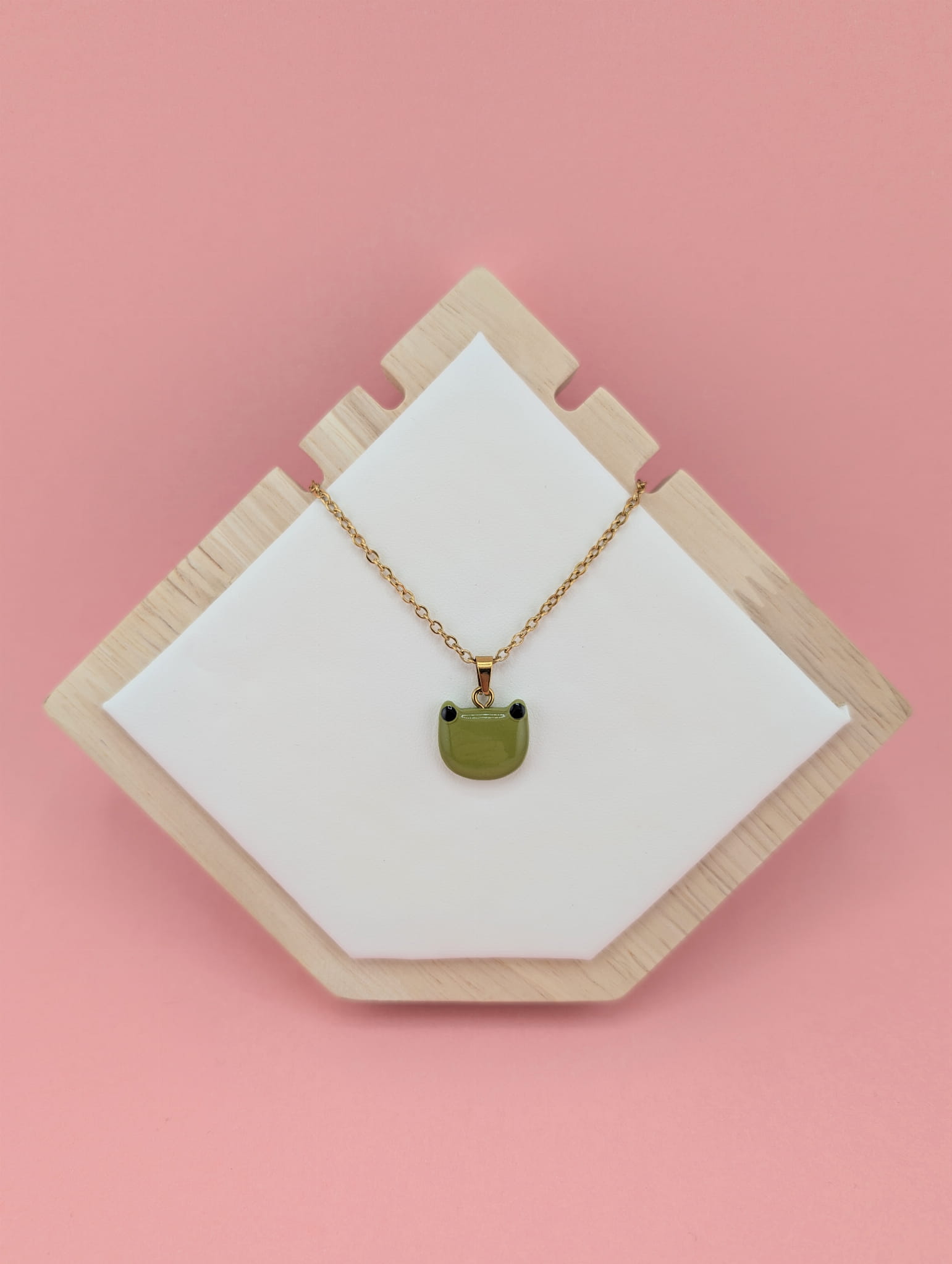 Naszyjnik z zieloną żabką na łańcuszku o długości 45 cm. Delikatna, ręcznie wykonana zawieszka w kształcie żabki dodaje wiosennego uroku i subtelnej zabawy do każdej stylizacji.
