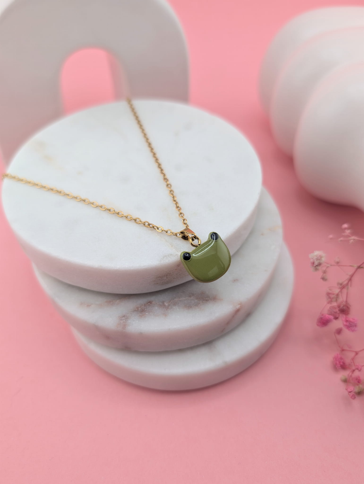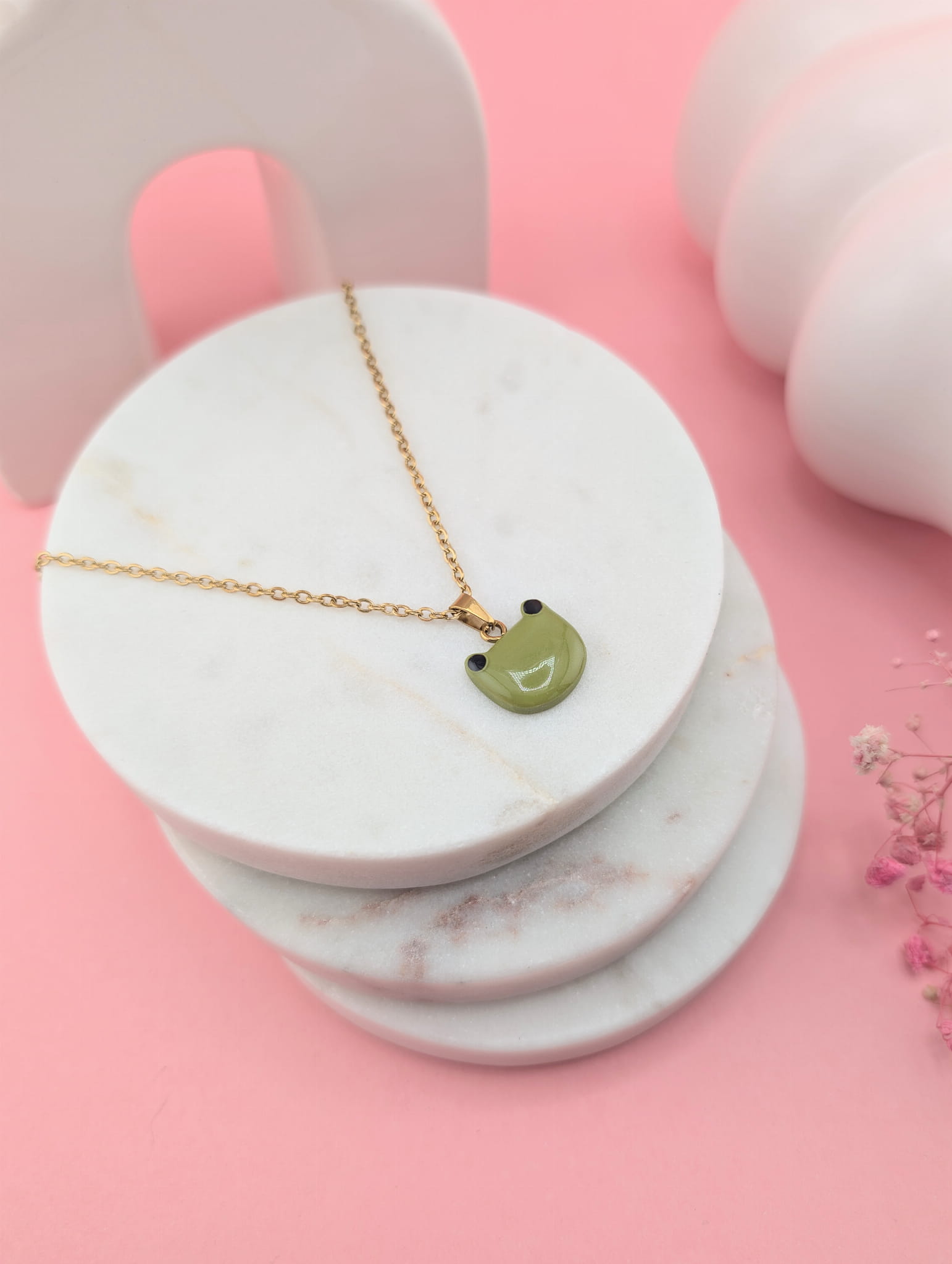 Zawieszka jest ręcznie wykonana z dbałością o detale, a kolor i kształt żabki nadają naszyjnikowi wyjątkowego charakteru. Uniwersalny design sprawia, że naszyjnik pasuje do codziennych i wiosennych stylizacji.