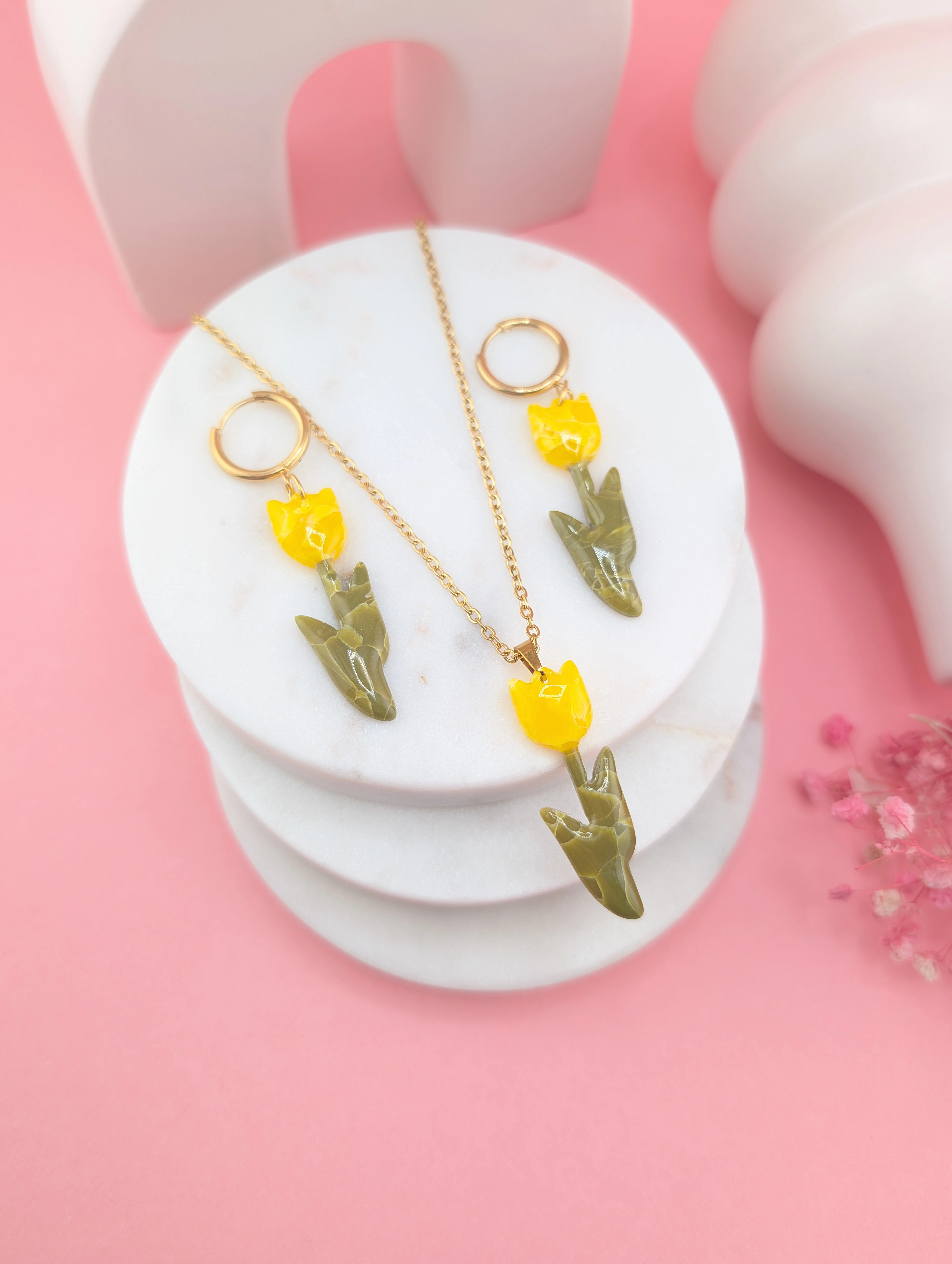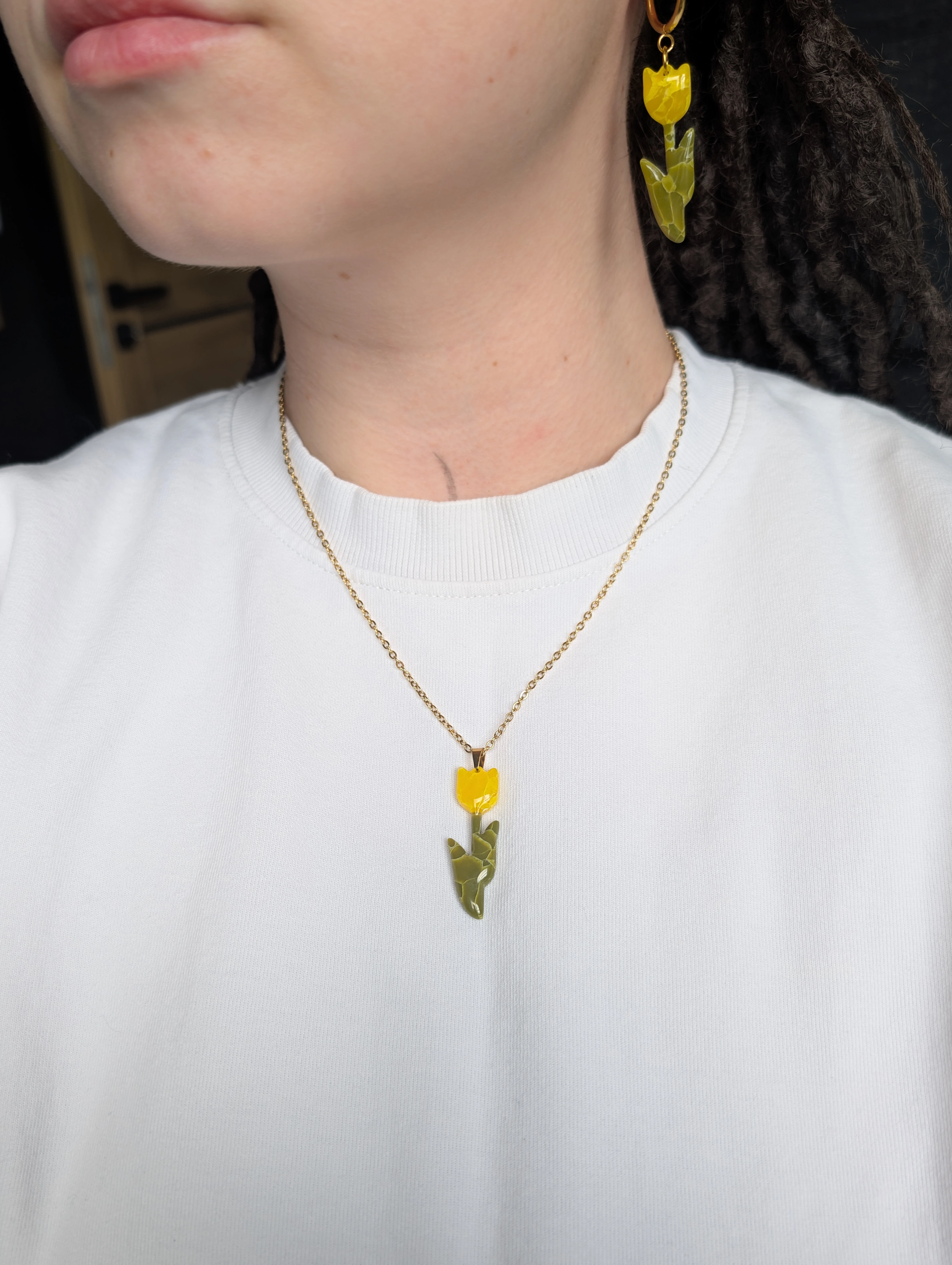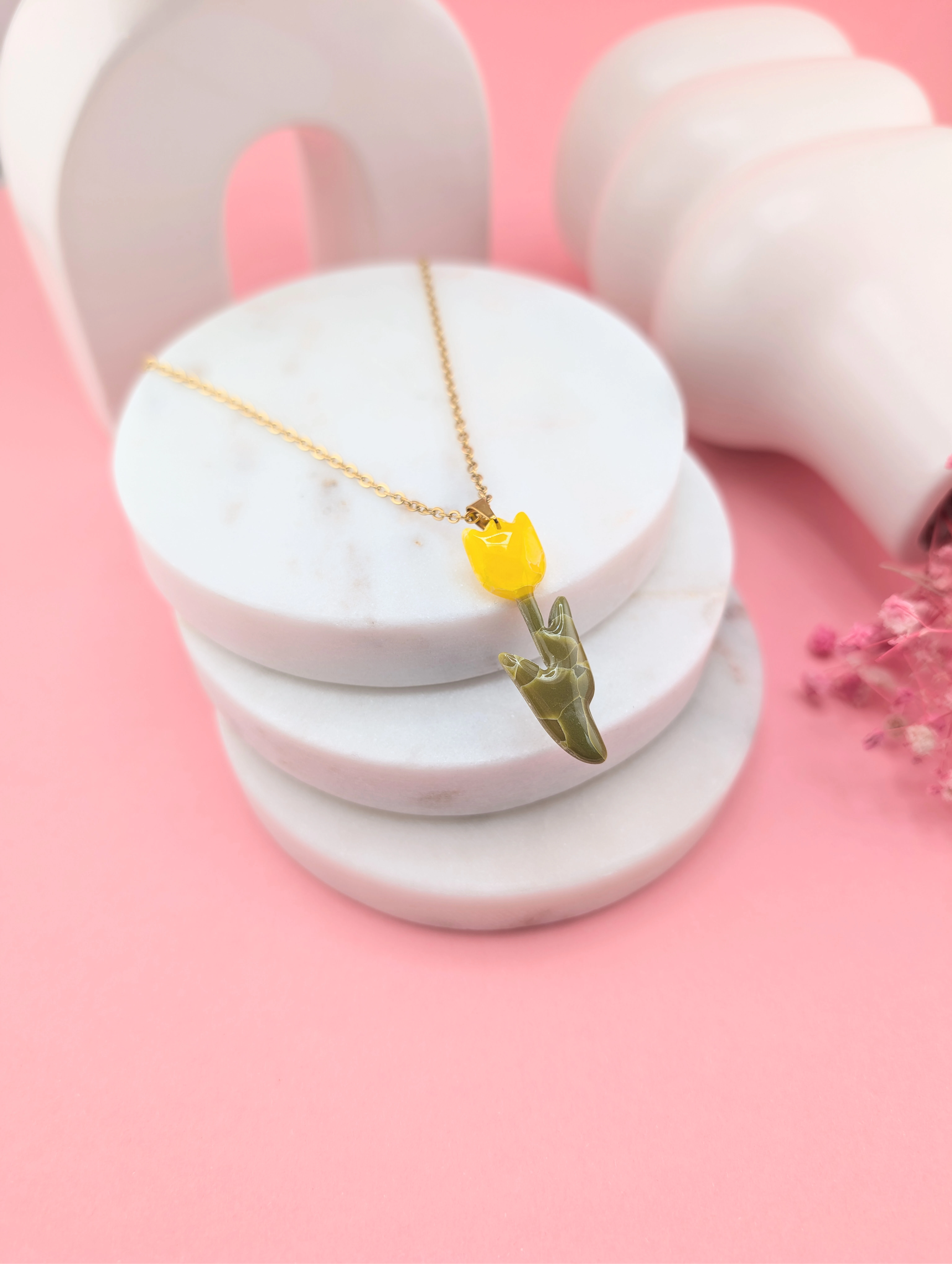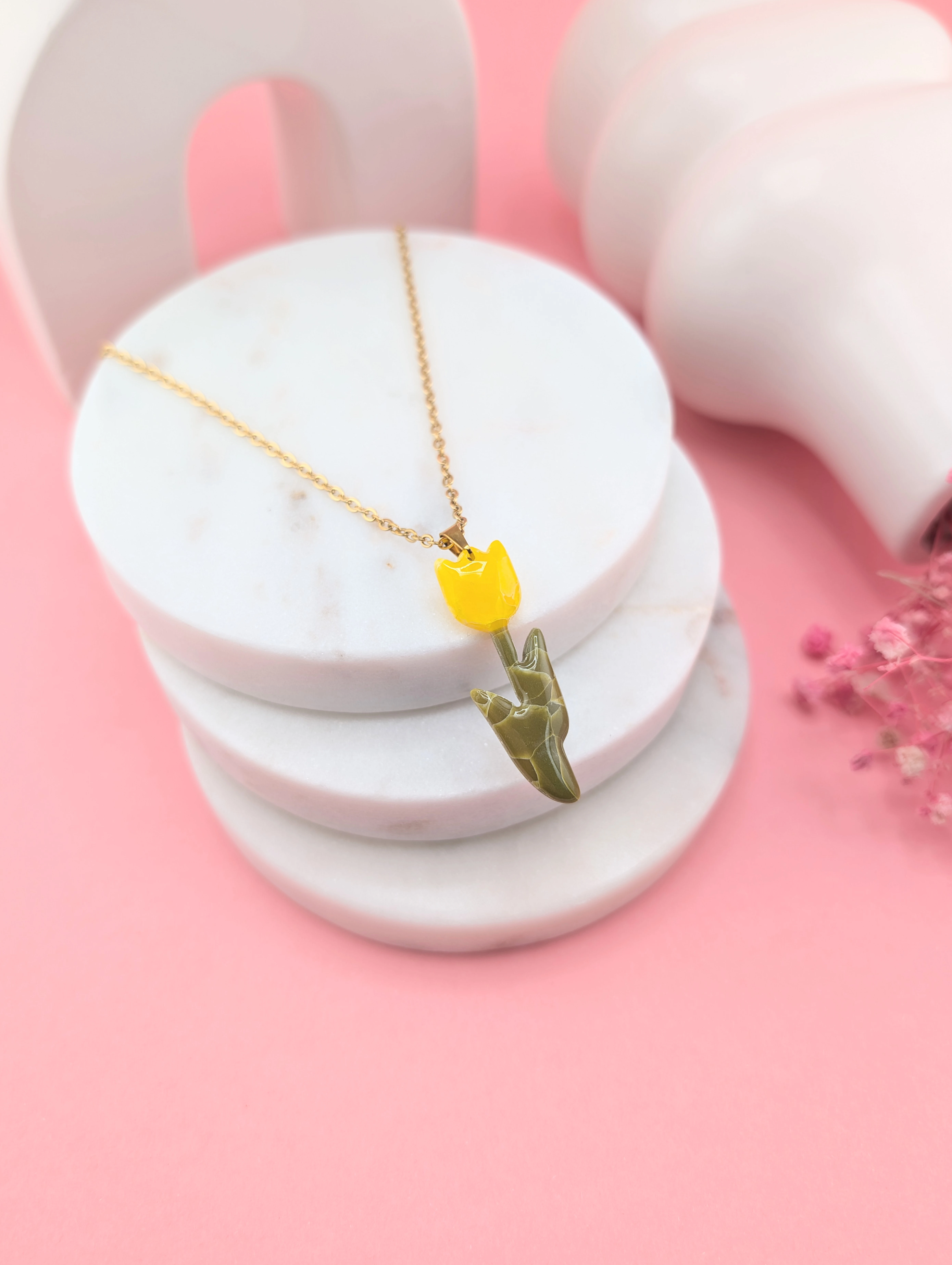 Naszyjnik z żółtym tulipanem to piękny symbol wiosny, świeżości i kobiecości. Intensywny kolor kwiatu przyciąga wzrok i dodaje stylizacji wyjątkowego charakteru.