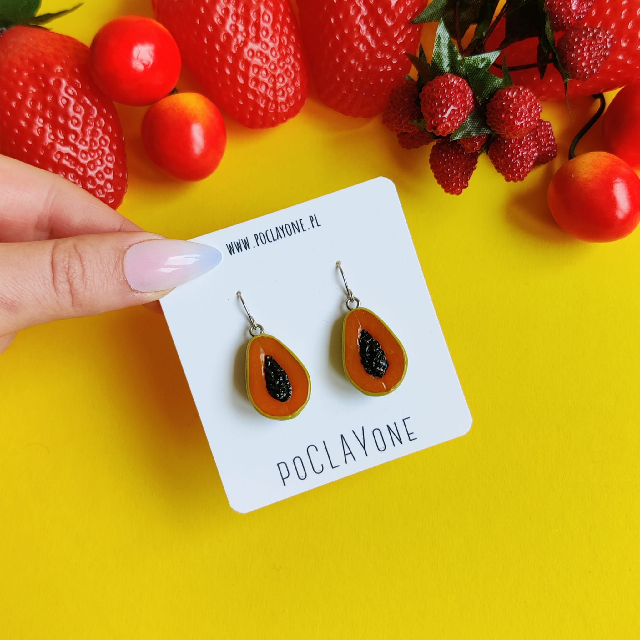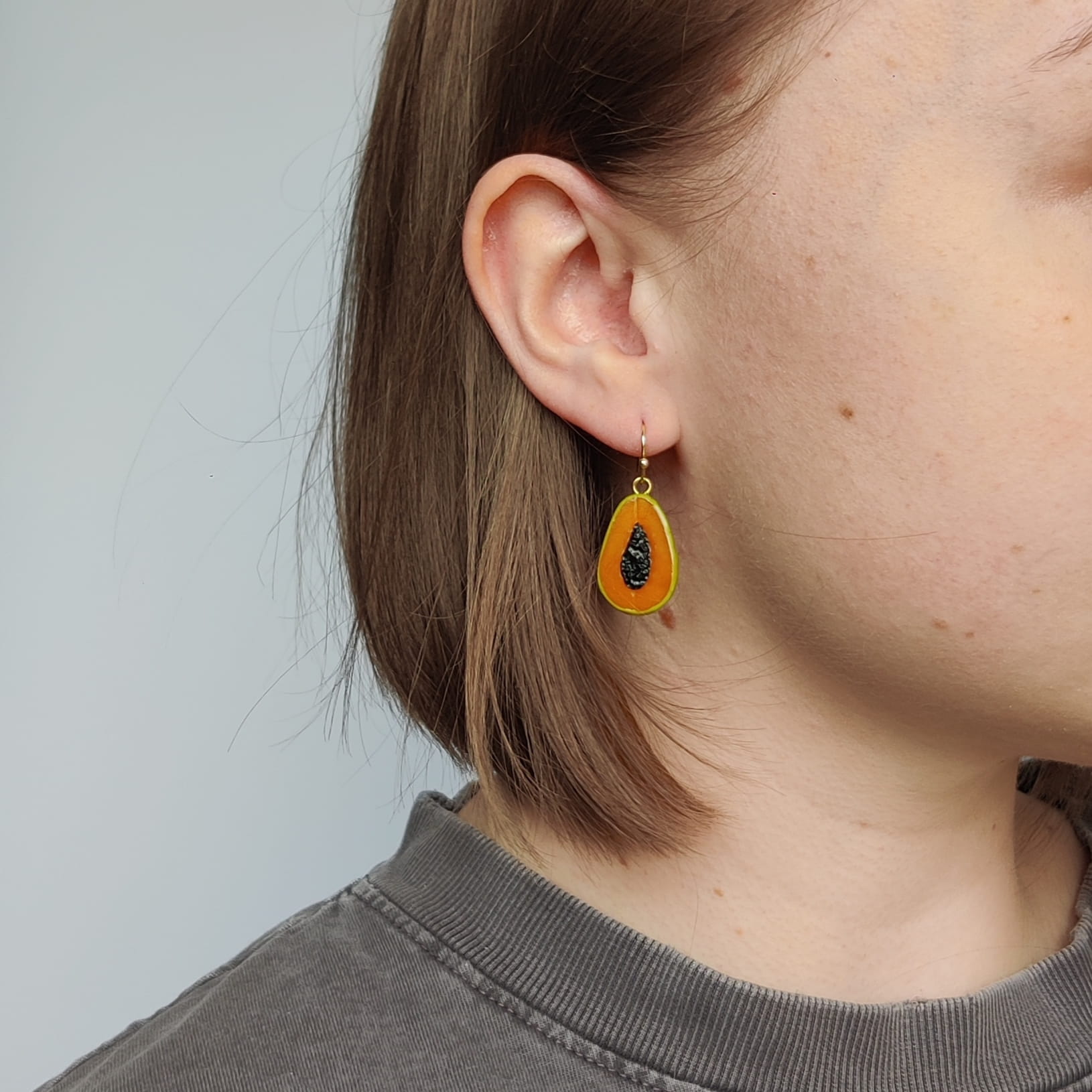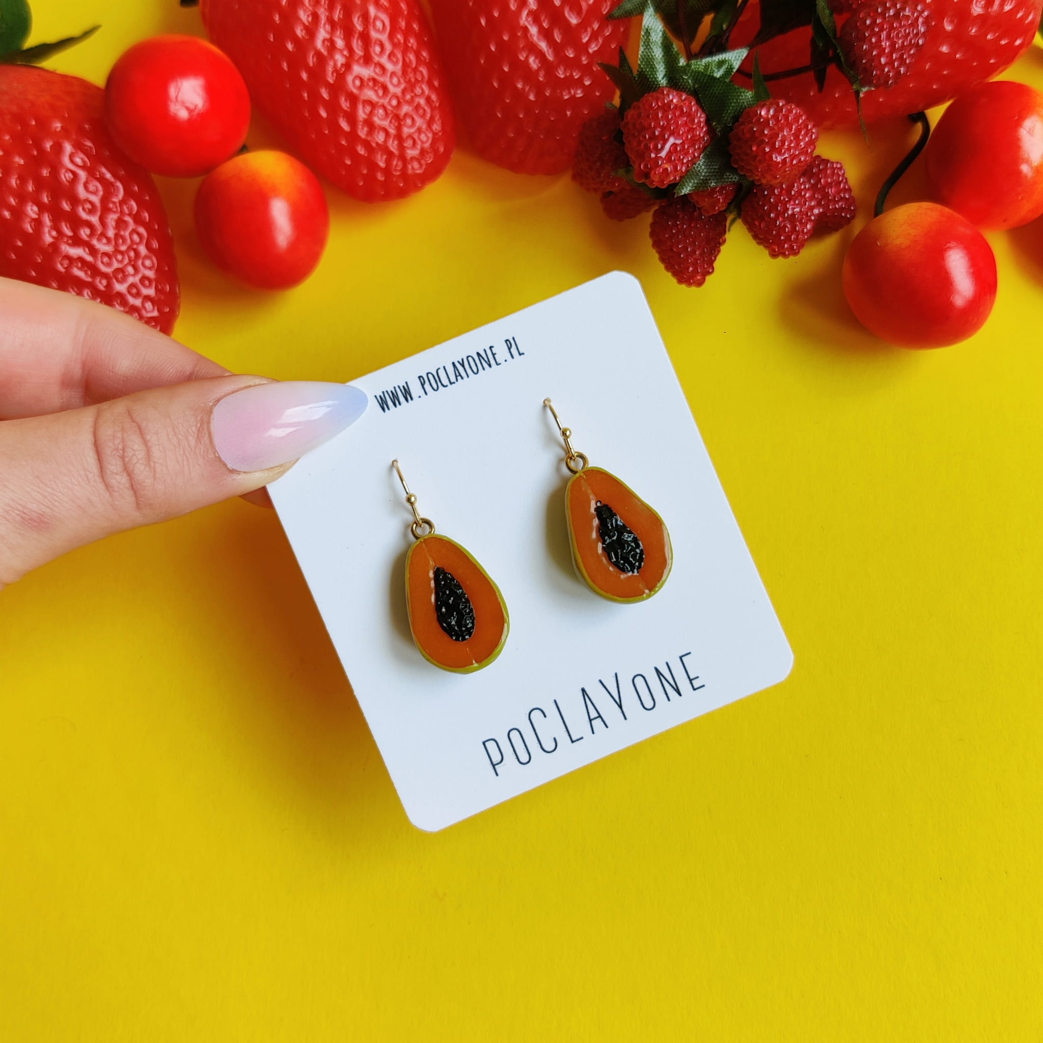 Dodaj tropikalnego charakteru do swoich letnich stylizacji z wiszącymi kolczykami papaje (papaya), wykonanymi ręcznie z gliny polimerowej. Egzotyczny motyw papai w intensywnych, soczystych kolorach doskonale podkreśli wakacyjny, kolorowy styl i doda świeżości Twoim outfitom.