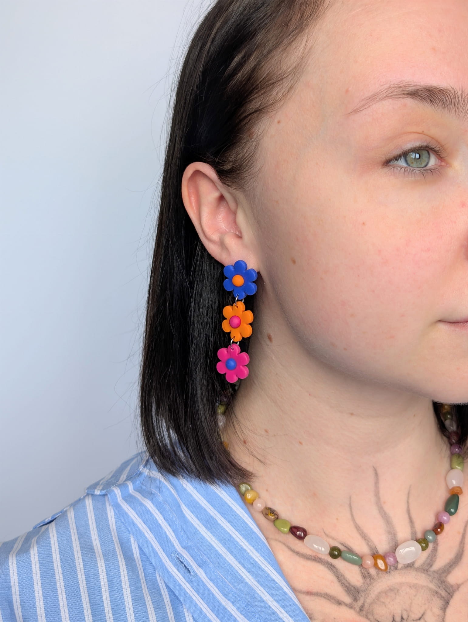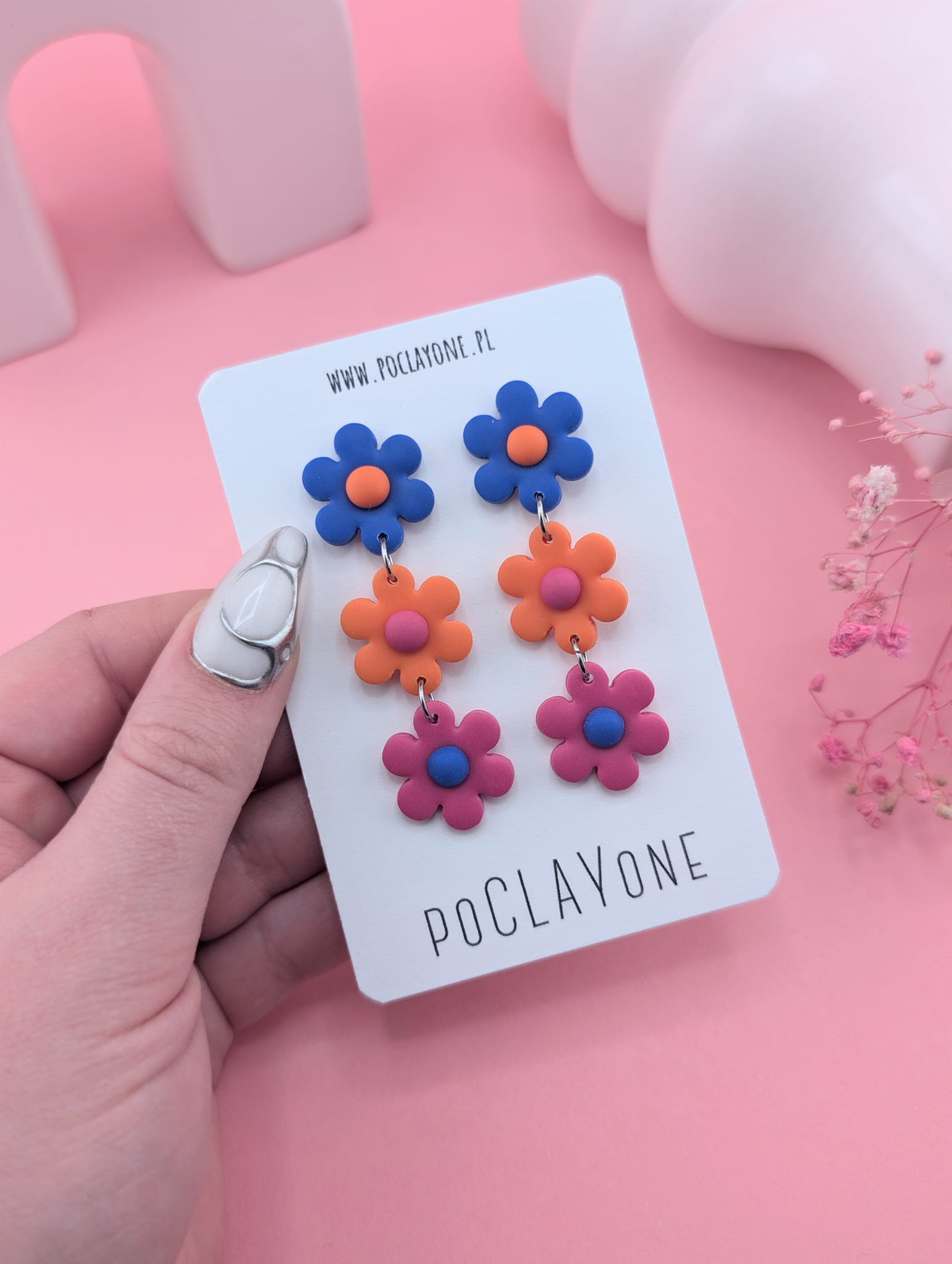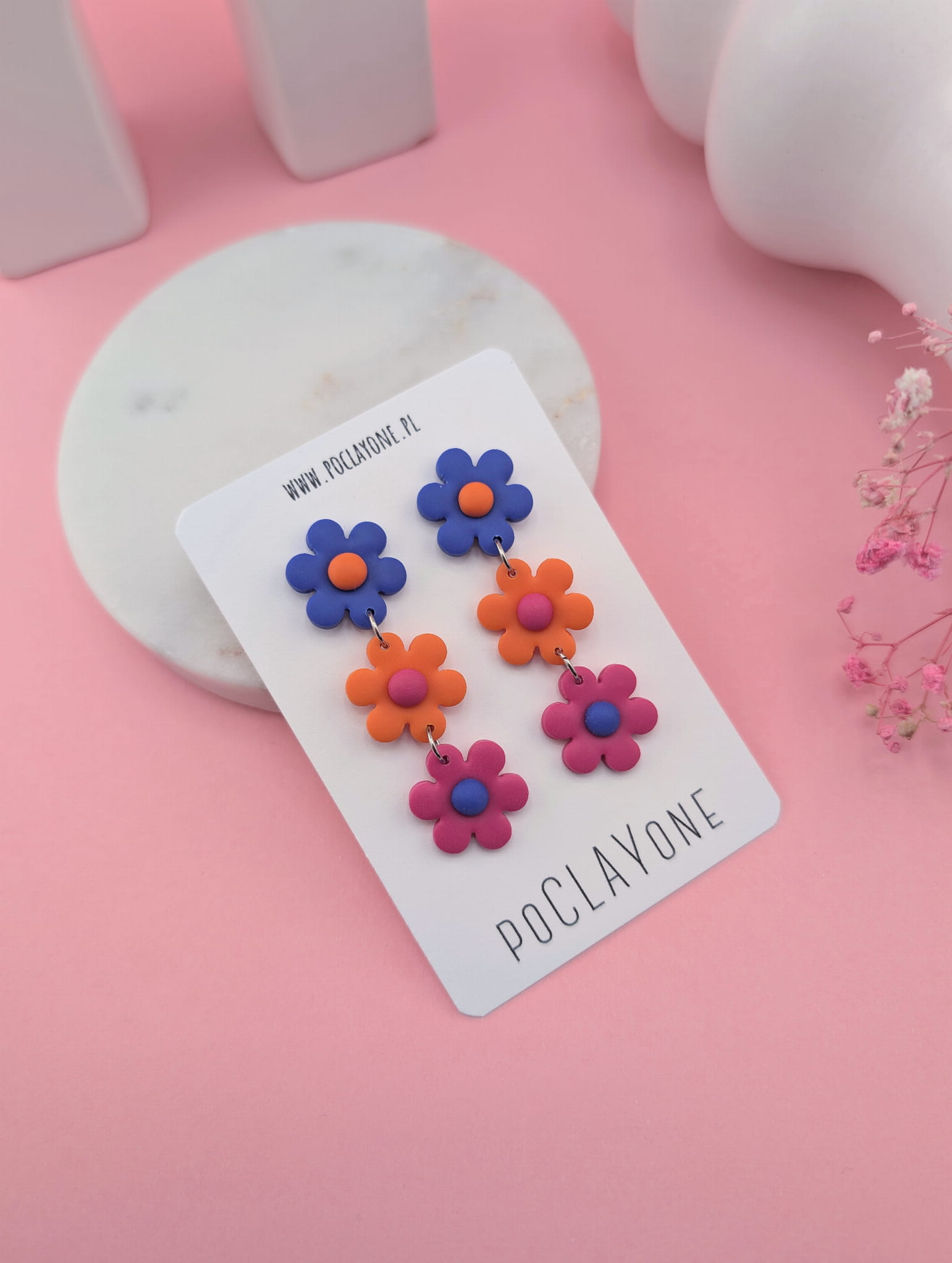 Te wyjątkowe kolczyki z trzema połączonymi kwiatkami to połączenie trzech intensywnych kolorów – chabrowego, pomarańczowego i amarantowego. Stworzone z myślą o energicznych, wiosennych stylizacjach, dodają każdemu lookowi charakteru. Ręcznie wykonane z gliny polimerowej i stali chirurgicznej, będą doskonałym wyborem na każdą okazję.