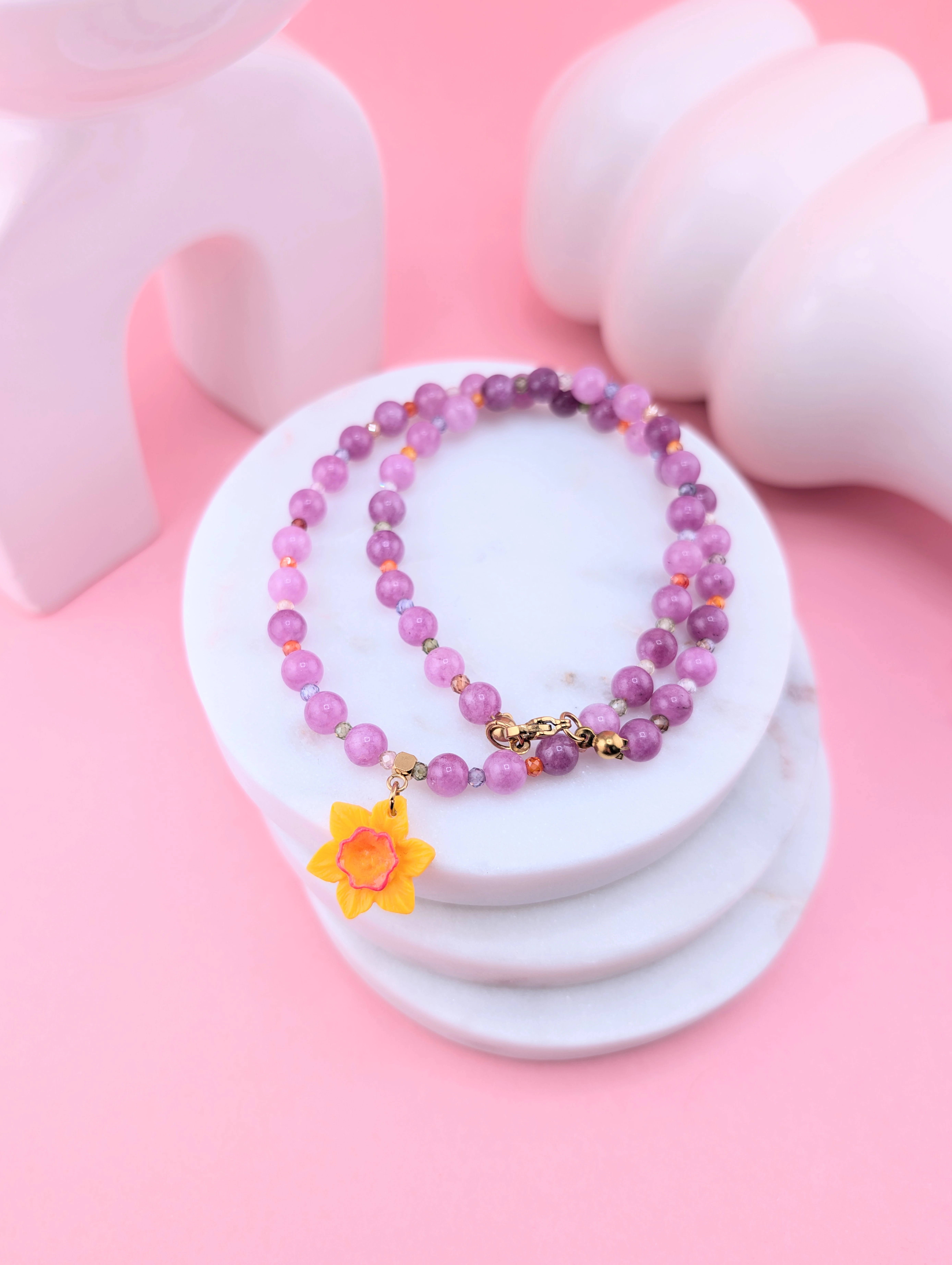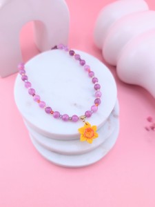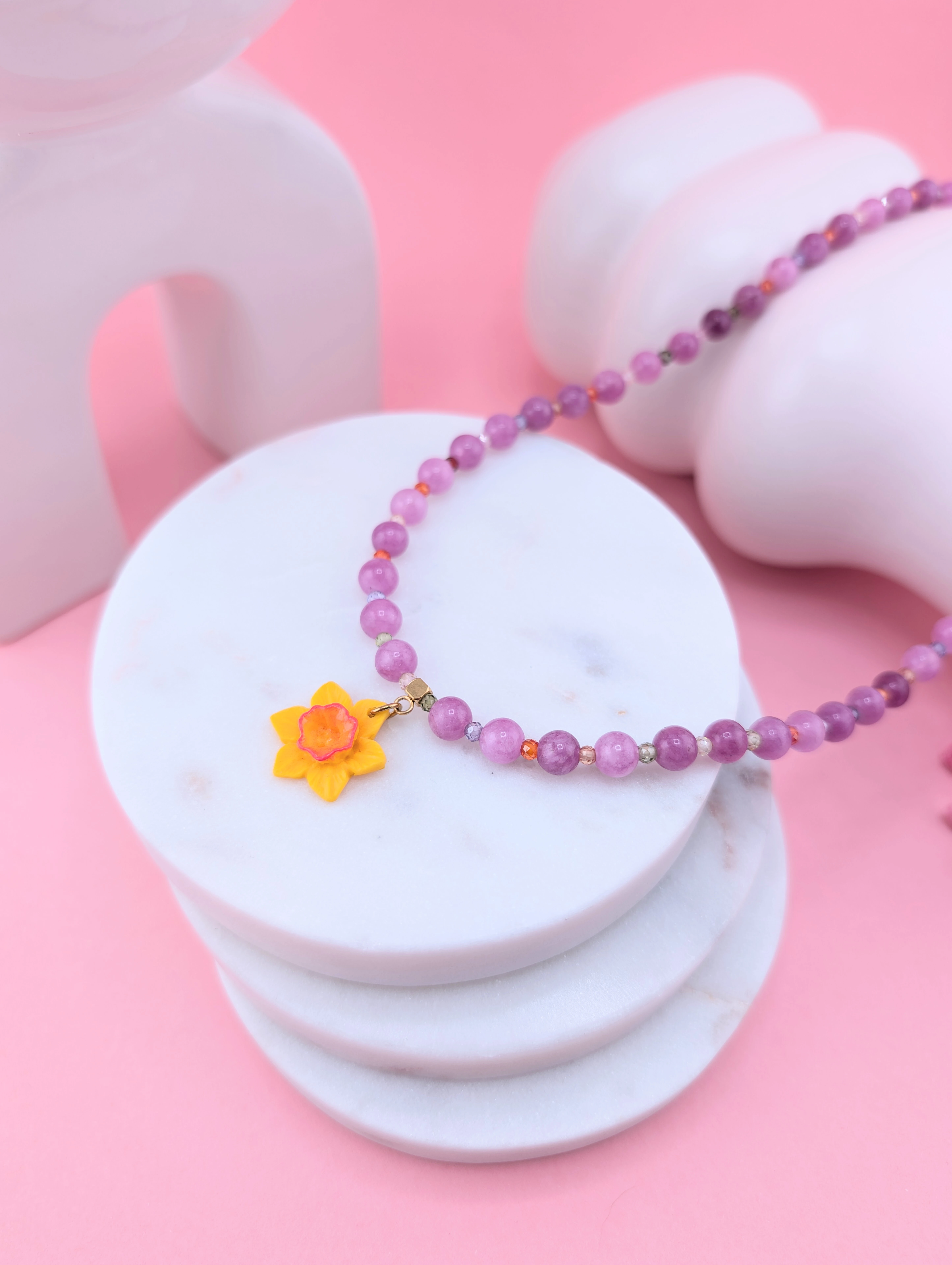 Ten kolorowy naszyjnik handmade łączy naturalne barwy i subtelne detale. Zawieszka w kształcie żółtego żonkila dodaje wiosennego charakteru każdej stylizacji, a ręczne wykonanie zapewnia wyjątkowość i unikatowość produktu.