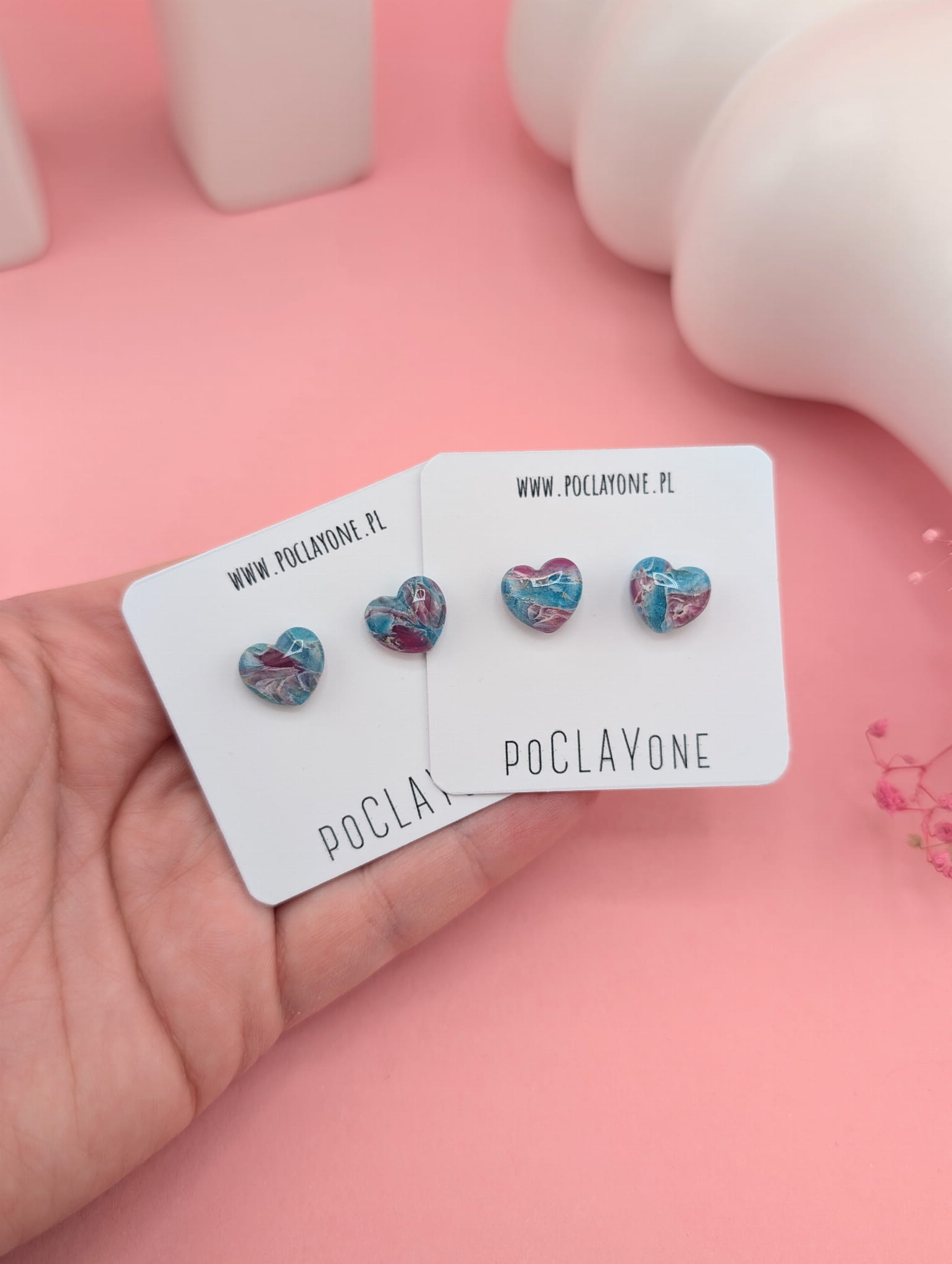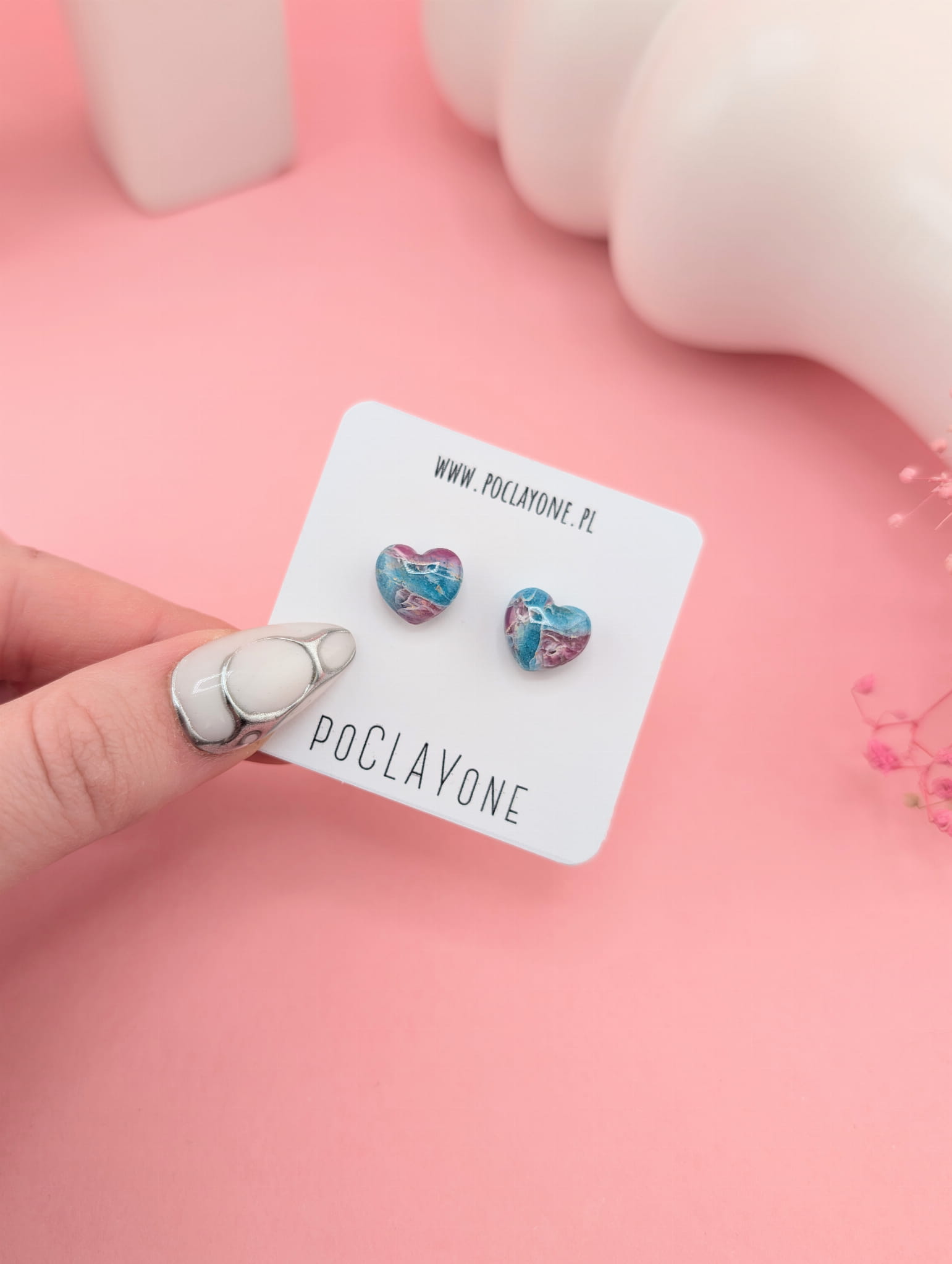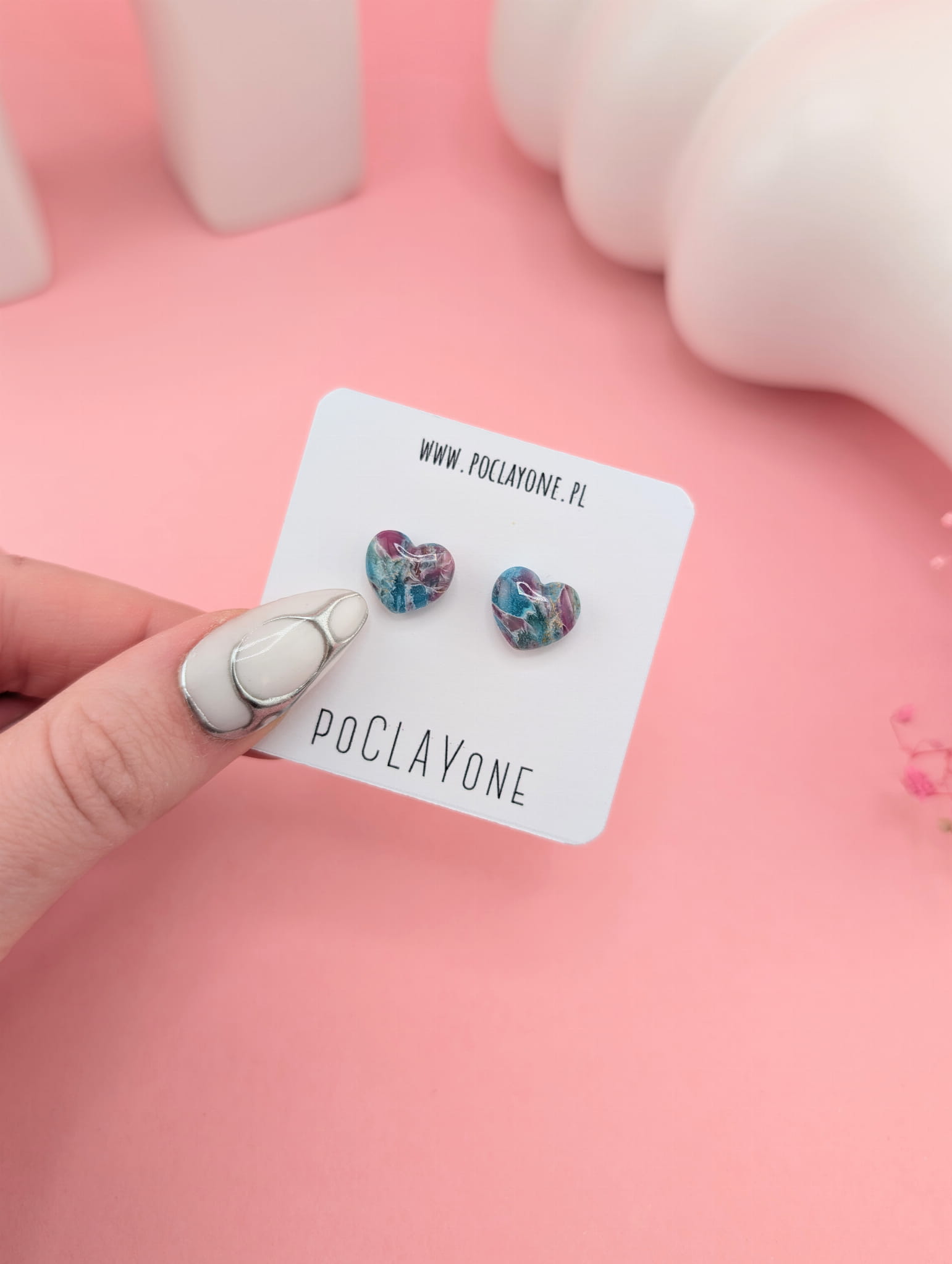 Malutkie kolczyki serduszka Lagoon Mist w marmurkowych kolorach turkusu, niebieskiego i różu. Każda para jest ręcznie wykonana i występuje tylko w jednym egzemplarzu. Wielkość serduszka nie przekracza 1,3 cm.