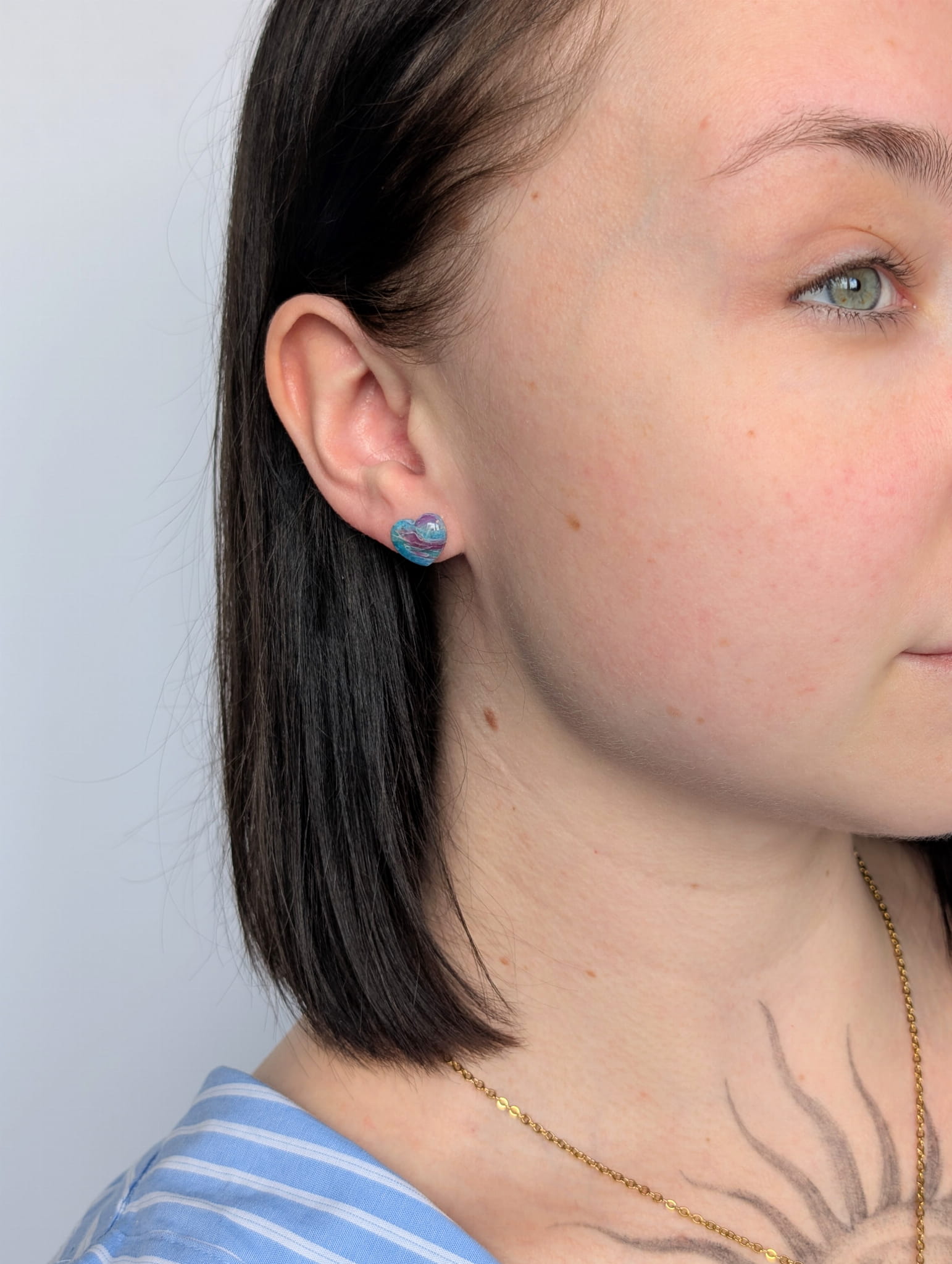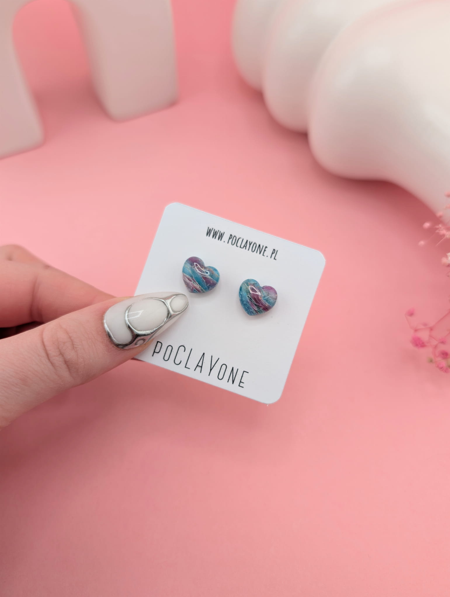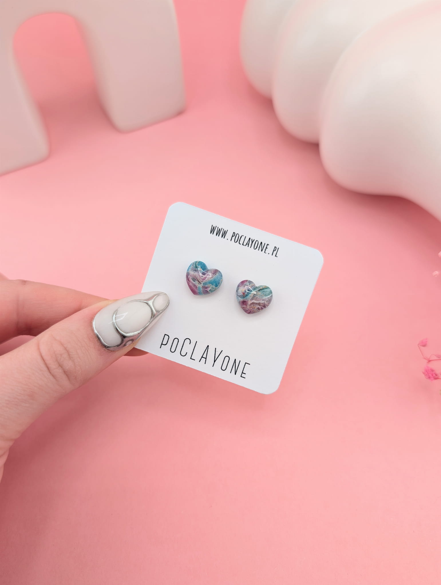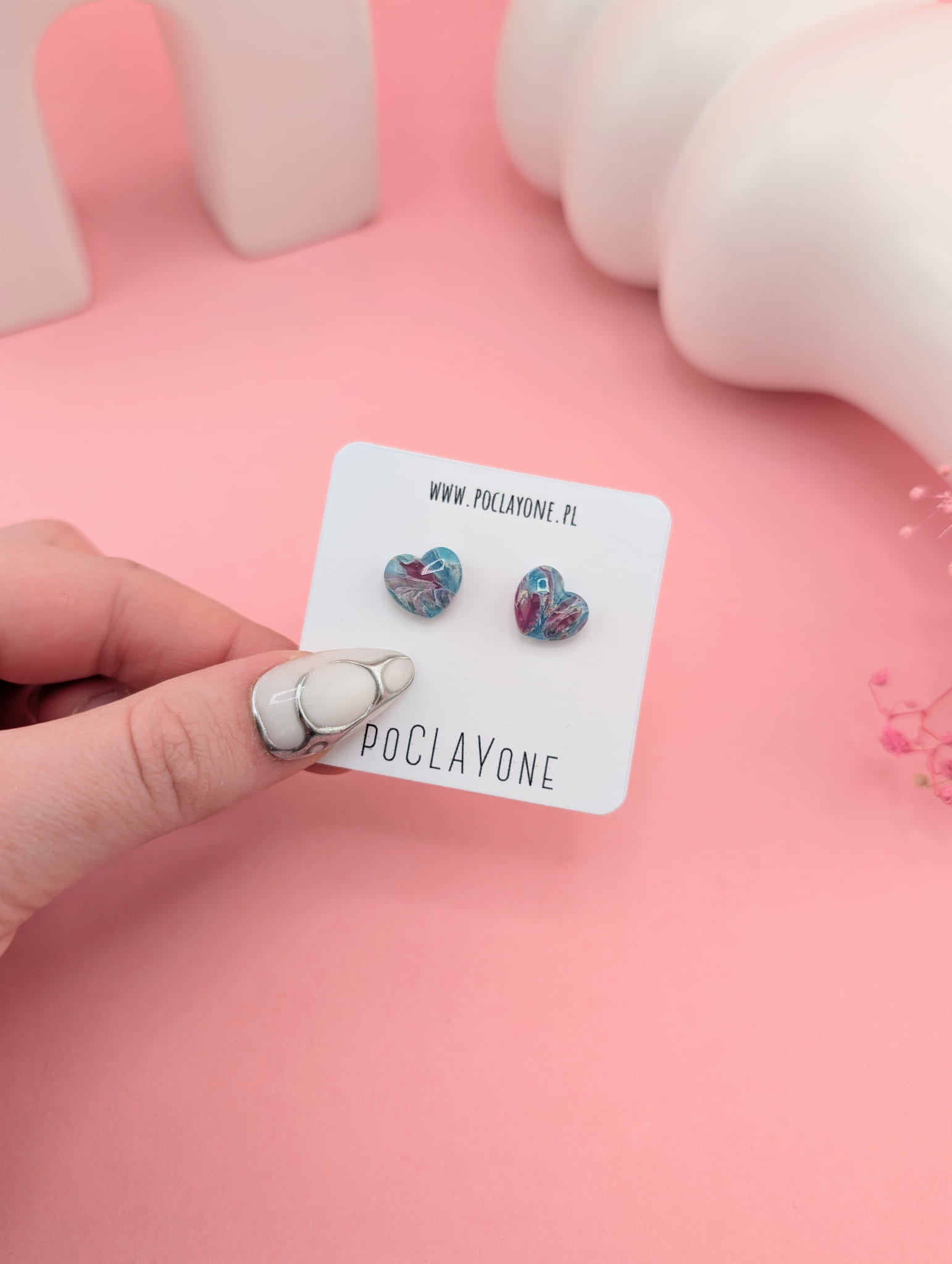 Malutkie kolczyki serduszka Lagoon Mist w marmurkowych kolorach turkusu, niebieskiego i różu. Każda para jest ręcznie wykonana i występuje tylko w jednym egzemplarzu. Wielkość serduszka nie przekracza 1,3 cm.
