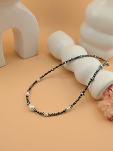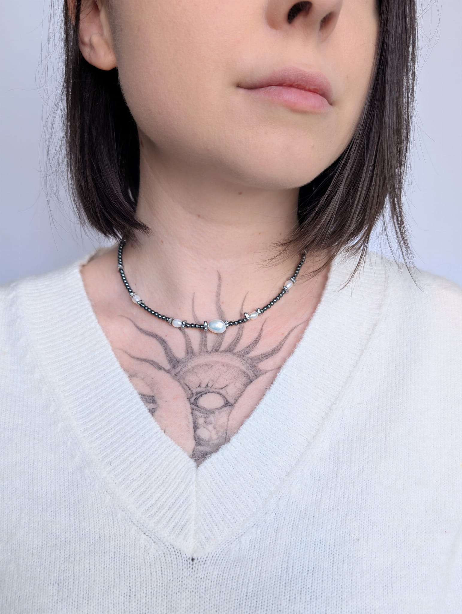 Ten symetryczny choker z grafitowego hematytu został zaprojektowany z myślą o osobach, które cenią klasykę, równowagę i subtelną elegancję. Cztery mniejsze perły rozmieszczone symetrycznie oraz jedna większa perła w centralnym punkcie tworzą wyjątkowo spójną i estetyczną kompozycję.