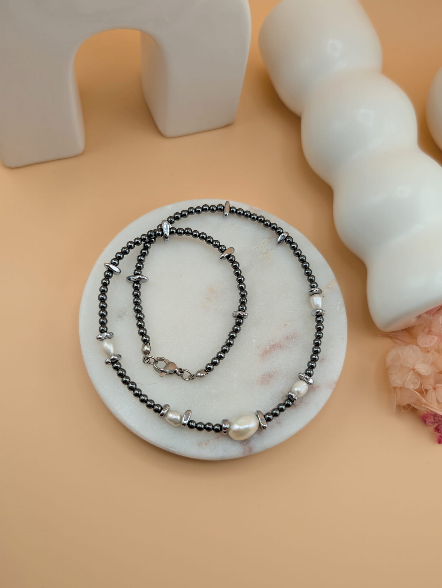 Chłodny połysk grafitowego hematytu doskonale współgra z delikatnym blaskiem pereł oraz srebrnymi przekładkami, dzięki czemu naszyjnik prezentuje się niezwykle elegancko, a jednocześnie pozostaje lekki i minimalistyczny.