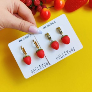 Poznaj wyjątkowe kolczyki wiszące truskawki, ręcznie wykonane z gliny polimerowej, które zachwycają matowym wykończeniem i naturalnym urokiem. Idealne na lato i wakacyjne stylizacje, dostępne na zamkniętych biglach ze stali chirurgicznej w dwóch modnych kolorach: złotym i srebrnym.