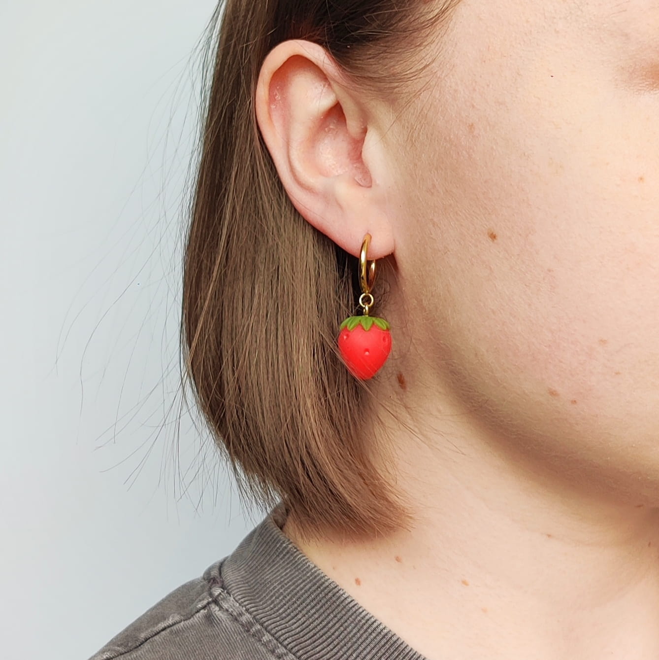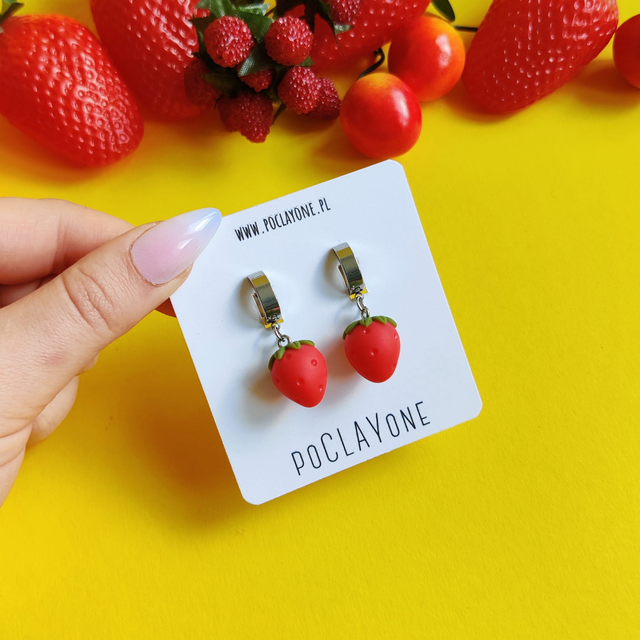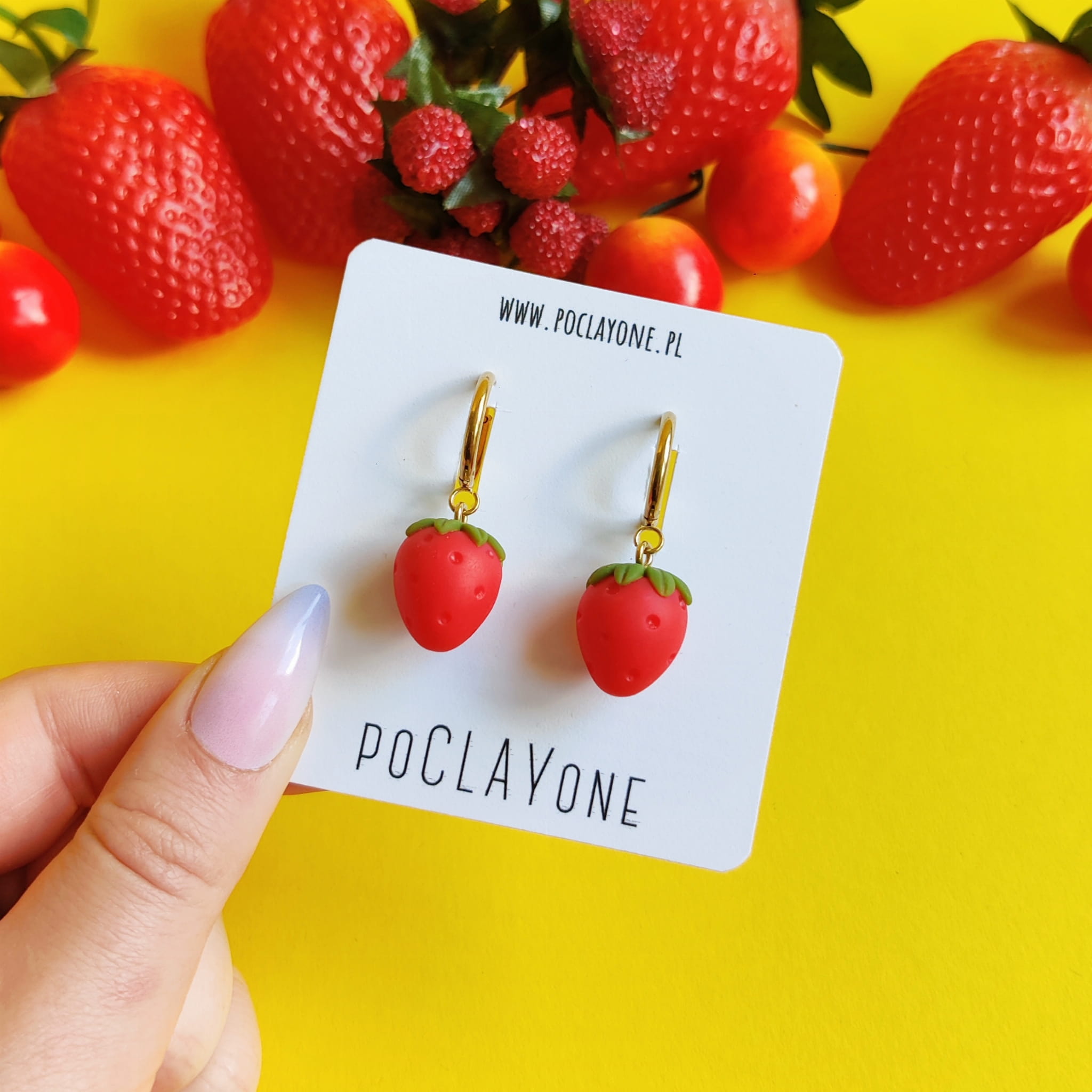 Letnie kolczyki wiszące truskawki z matowym wykończeniem, na zamkniętych biglach ze stali chirurgicznej w kolorze złotym i srebrnym. Ręcznie wykonane i lekkie!