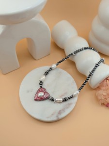 Dodatkowe perły rozmieszczone w kompozycji łagodzą mroczny charakter hematytu, tworząc doskonałą równowagę między romantyzmem a alternatywną estetyką. To idealny wybór dla osób, które kochają nieoczywistą biżuterię i chcą podkreślić swój styl także w walentynki.