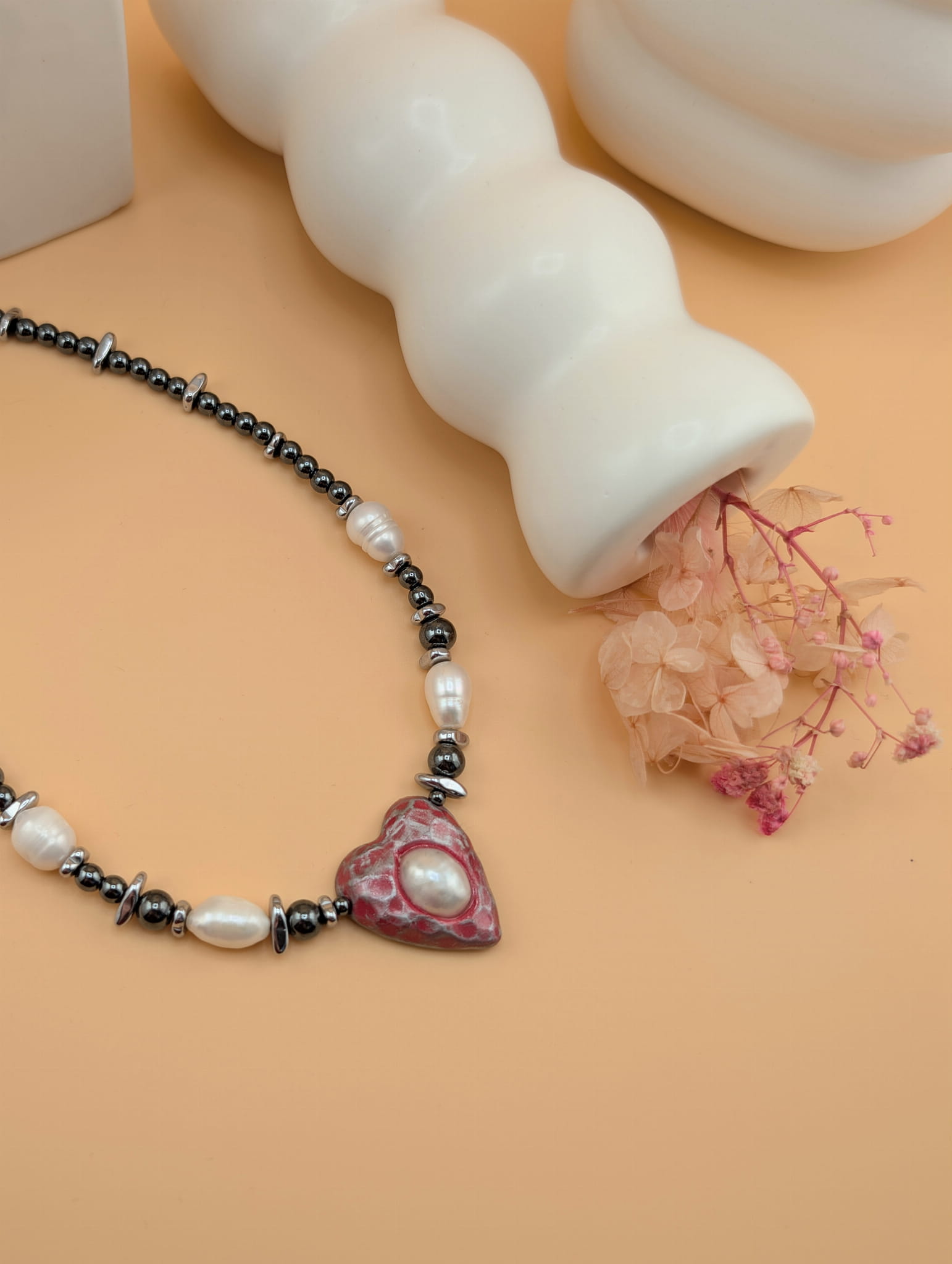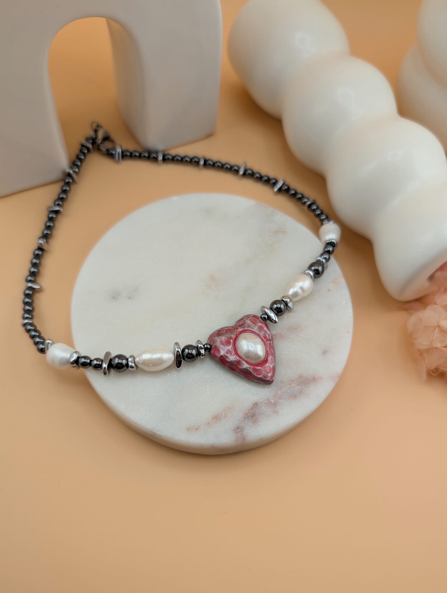 Walentynkowy choker o mrocznym, alternatywnym charakterze, wykonany z grafitowego hematytu, pereł oraz serca z modeliny z zatopioną perełką w centralnej części.