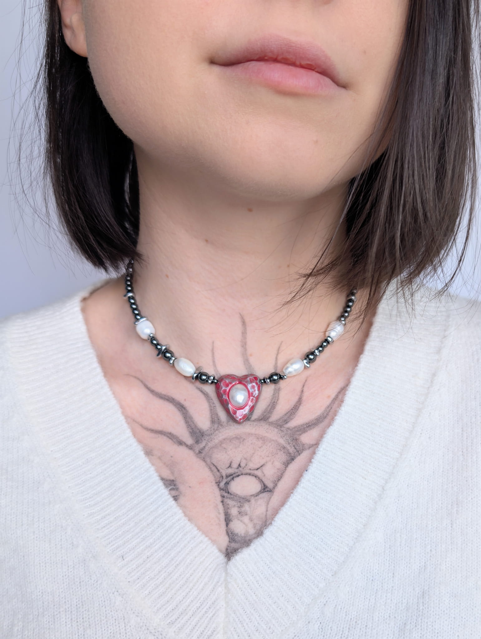 Walentynkowy mroczny choker z hematytu z sercem i perłą – alternatywna biżuteria