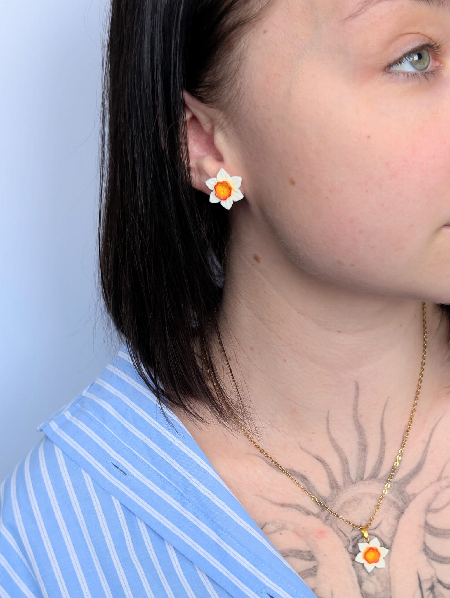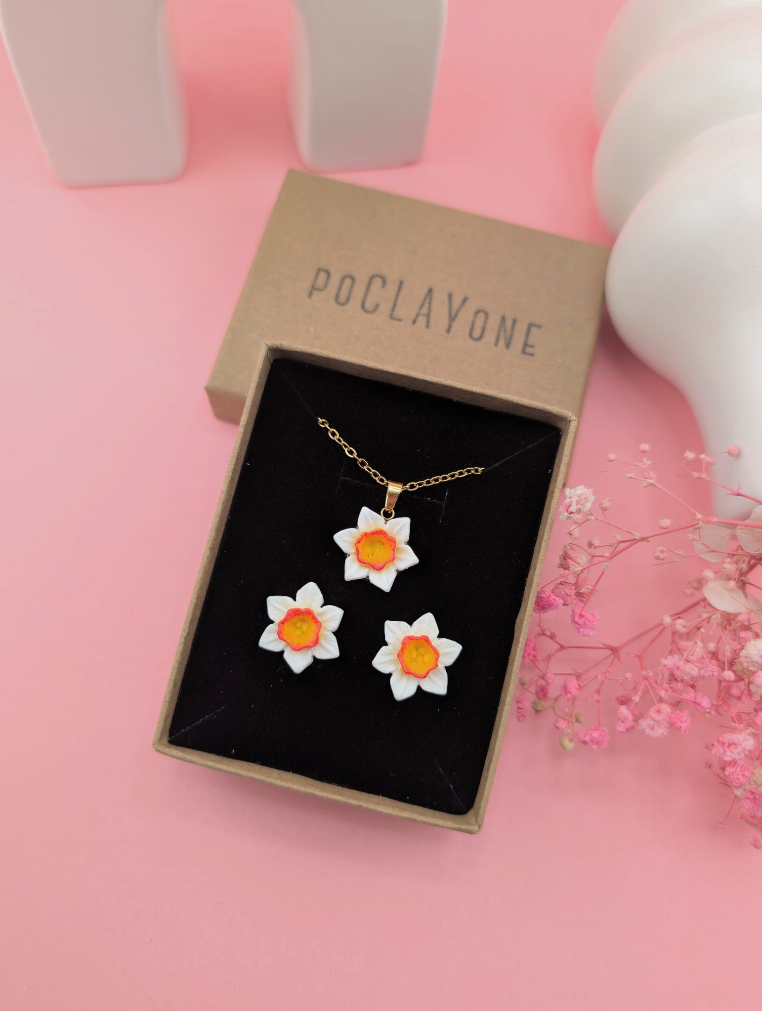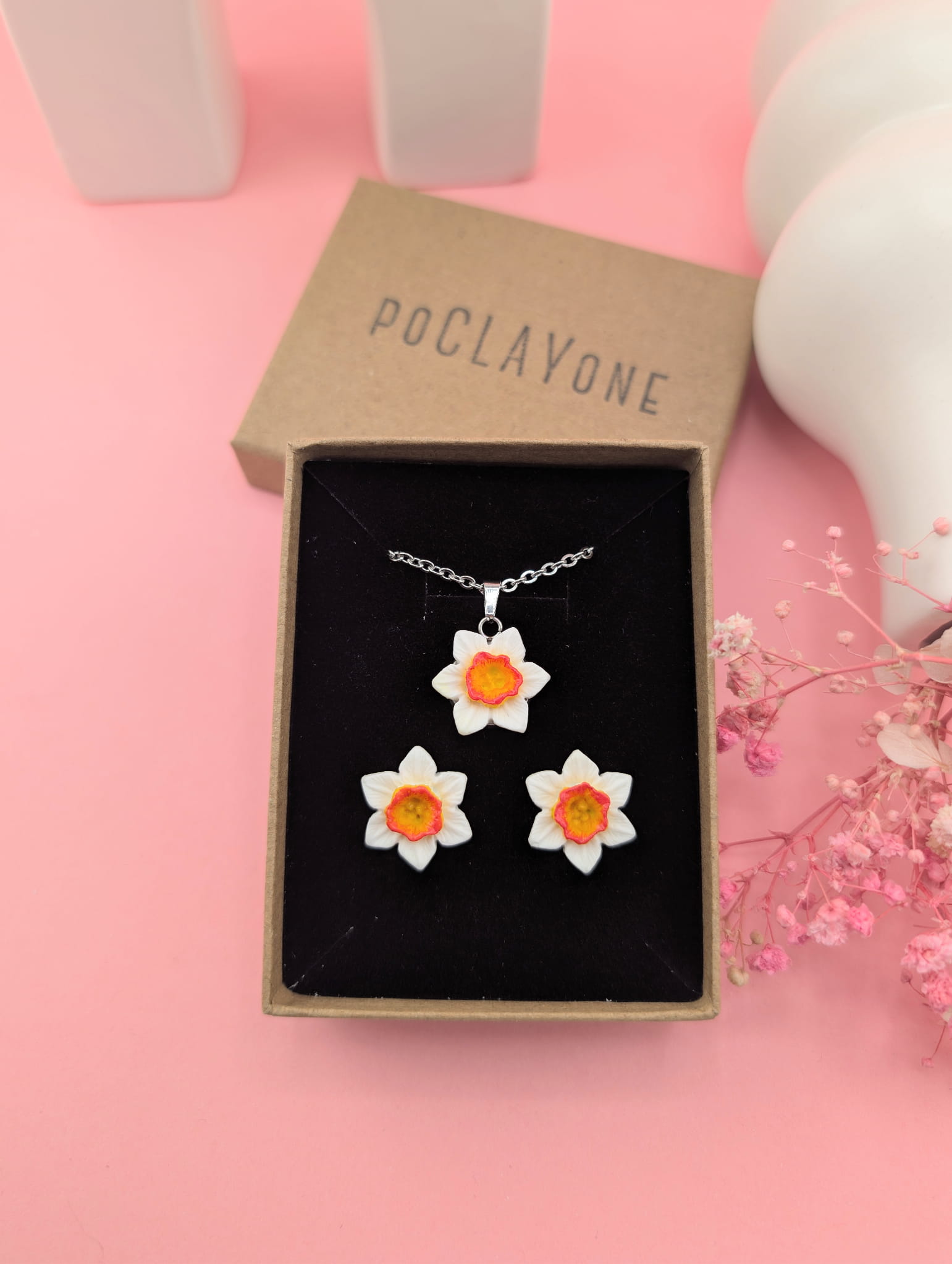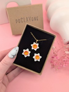 Wiosenny komplet biżuterii z białym żonkilem to subtelny zestaw inspirowany naturą. W skład kompletu wchodzą kolczyki sztyfty w kształcie białych żonkili oraz naszyjnik na łańcuszku o długości 47 cm z zawieszką żonkila. Delikatna, kwiatowa biżuteria idealna na co dzień i jako prezent.
