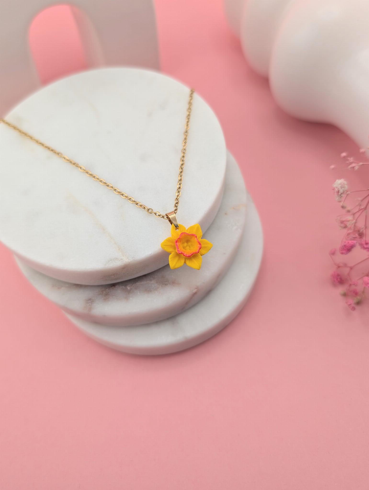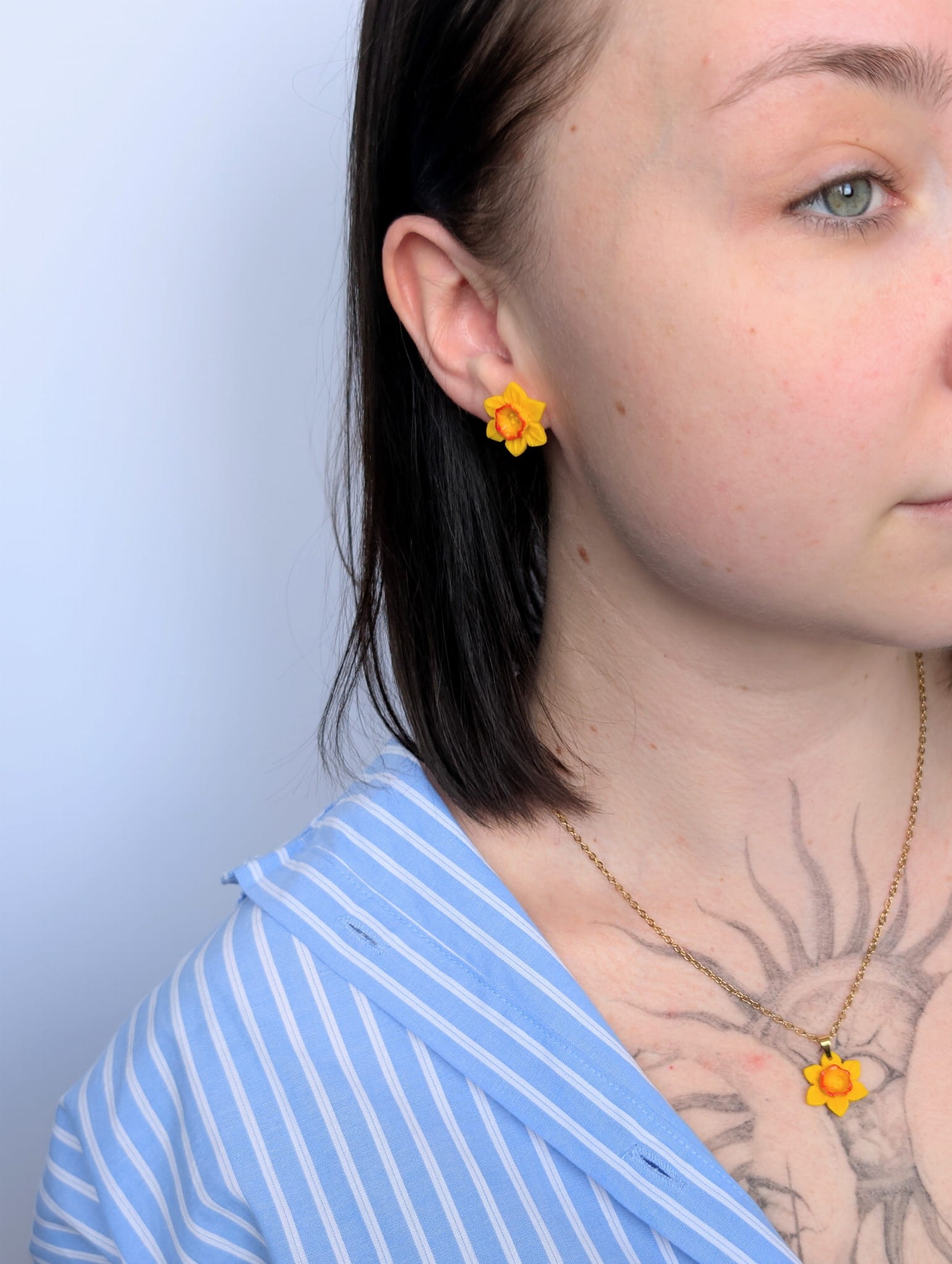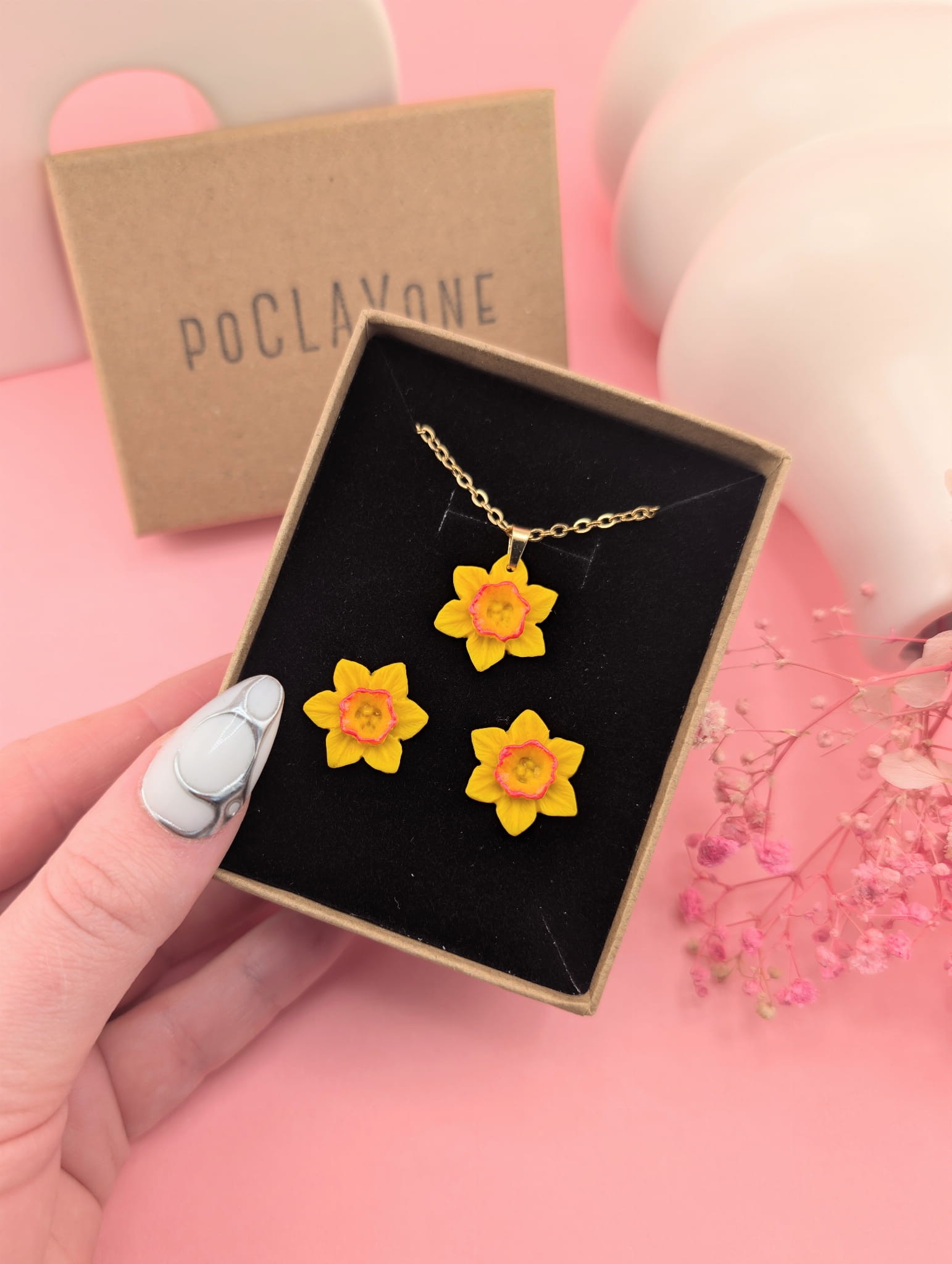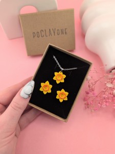 Wiosenny komplet biżuterii z żółtym żonkilem to uroczy zestaw inspirowany naturą. W skład kompletu wchodzą kolczyki sztyfty w kształcie żółtych żonkili oraz naszyjnik na łańcuszku o długości 47 cm z zawieszką żonkila. Delikatna, kwiatowa biżuteria idealna na co dzień i jako prezent.