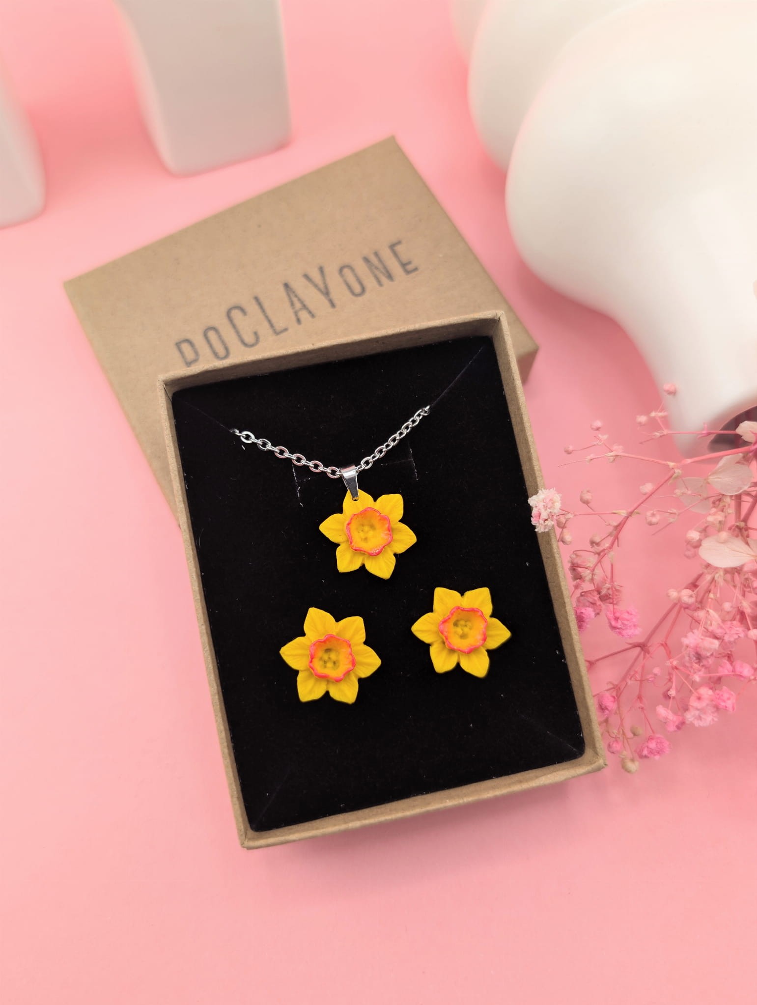 W skład zestawu wchodzą kolczyki sztyfty w kształcie żonkili oraz naszyjnik z zawieszką żonkila na łańcuszku o długości 47 cm. Dzięki temu komplet jest harmonijny, spójny i wygląda bardzo elegancko.