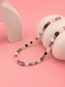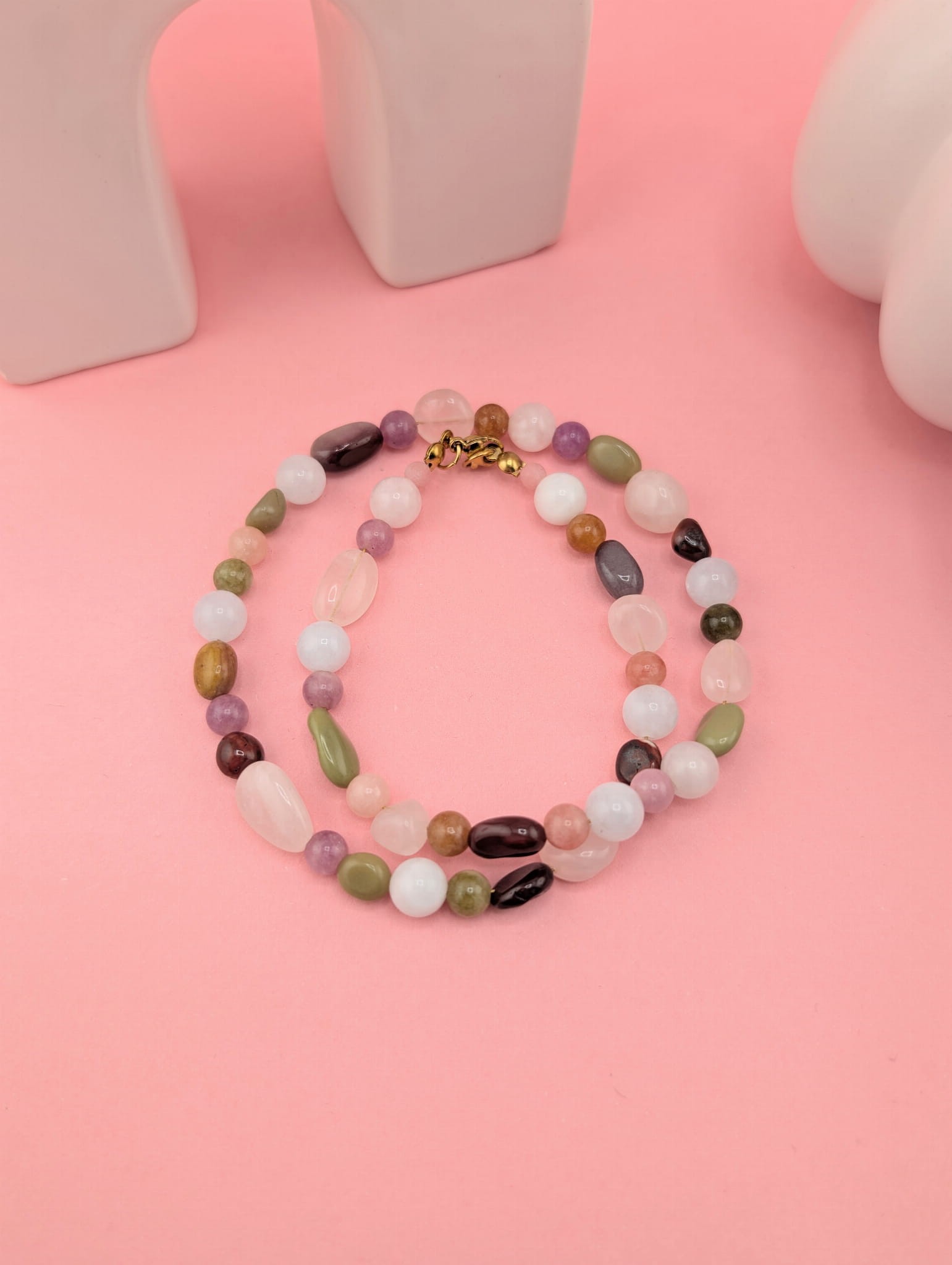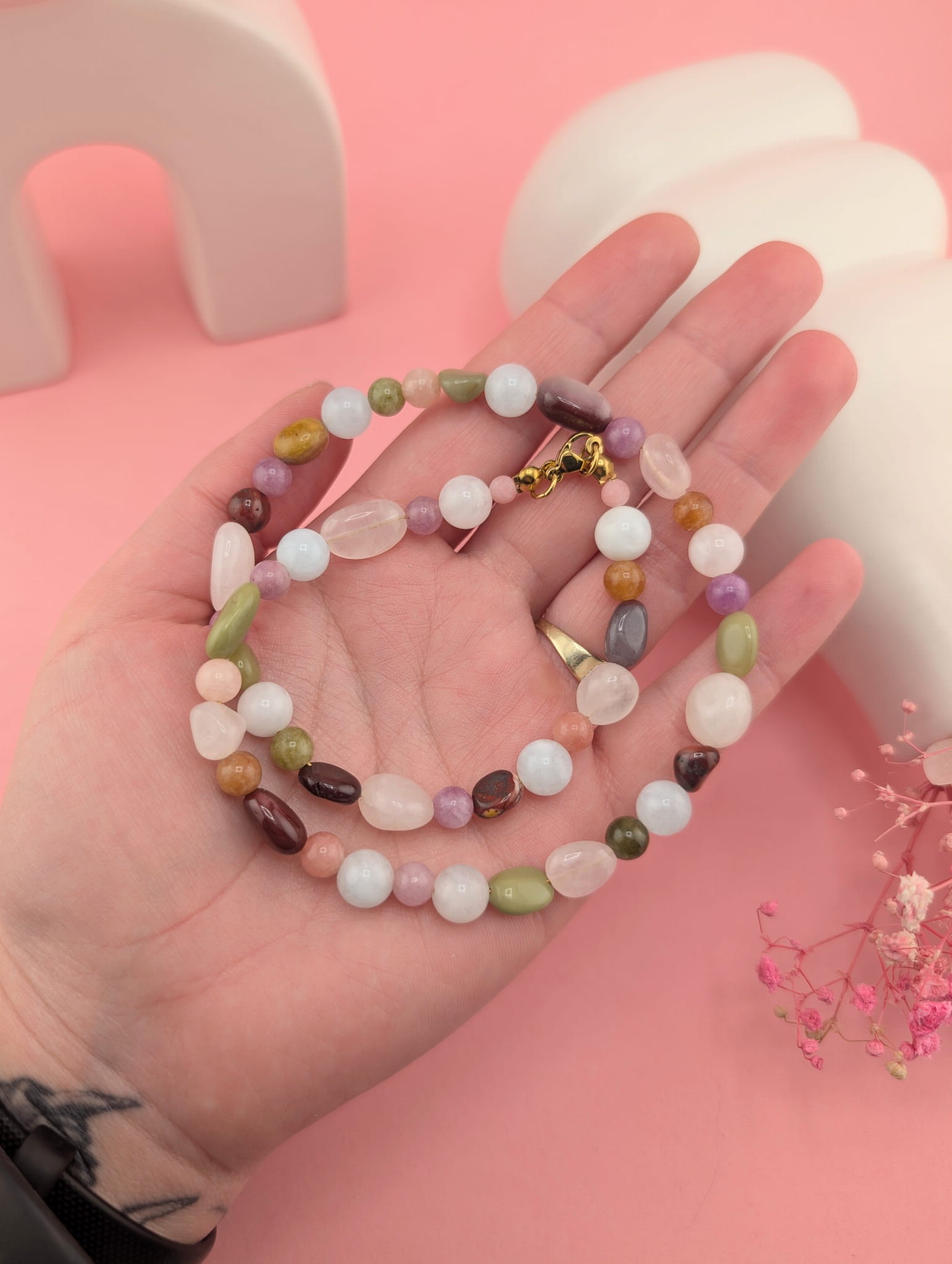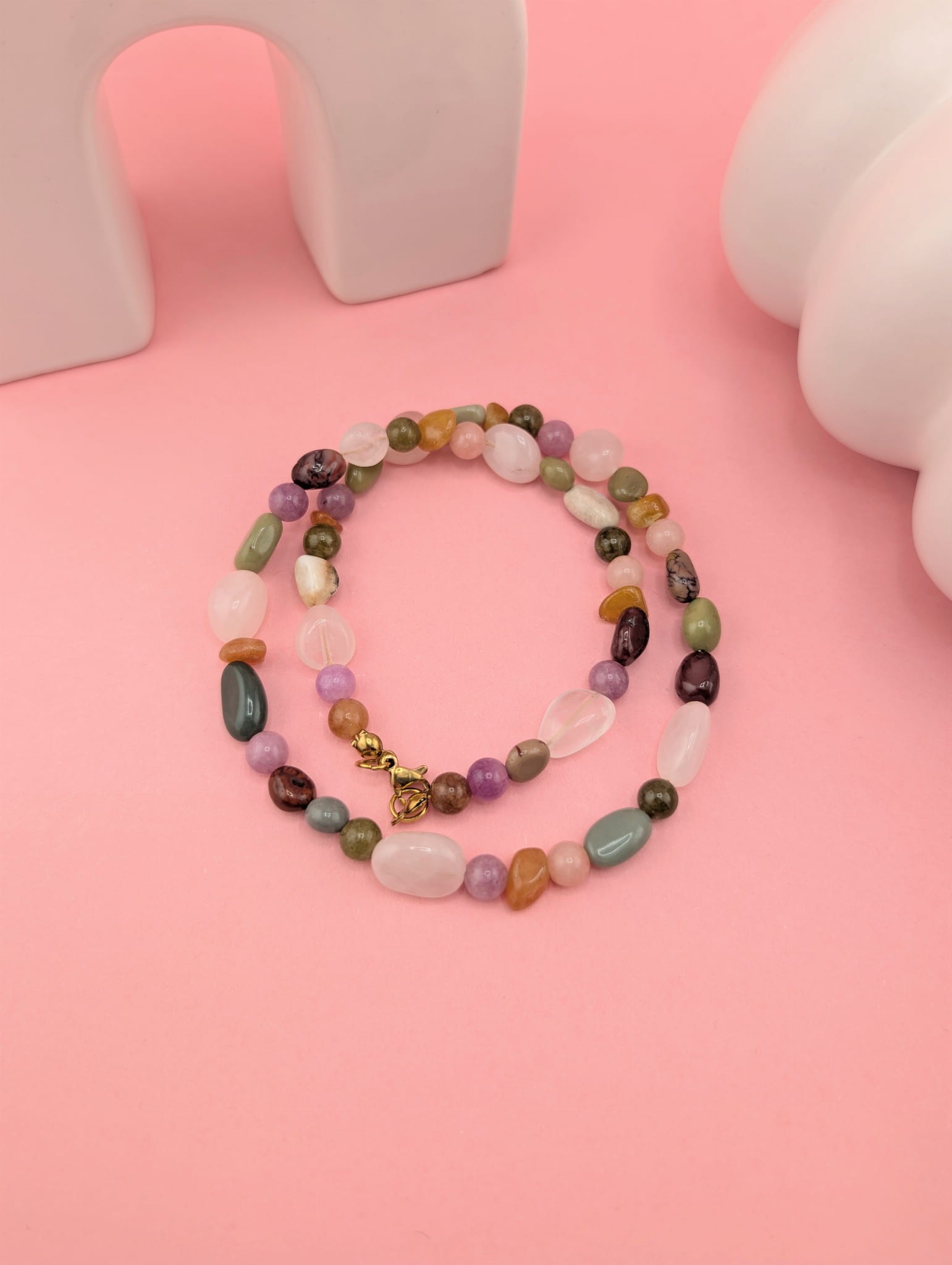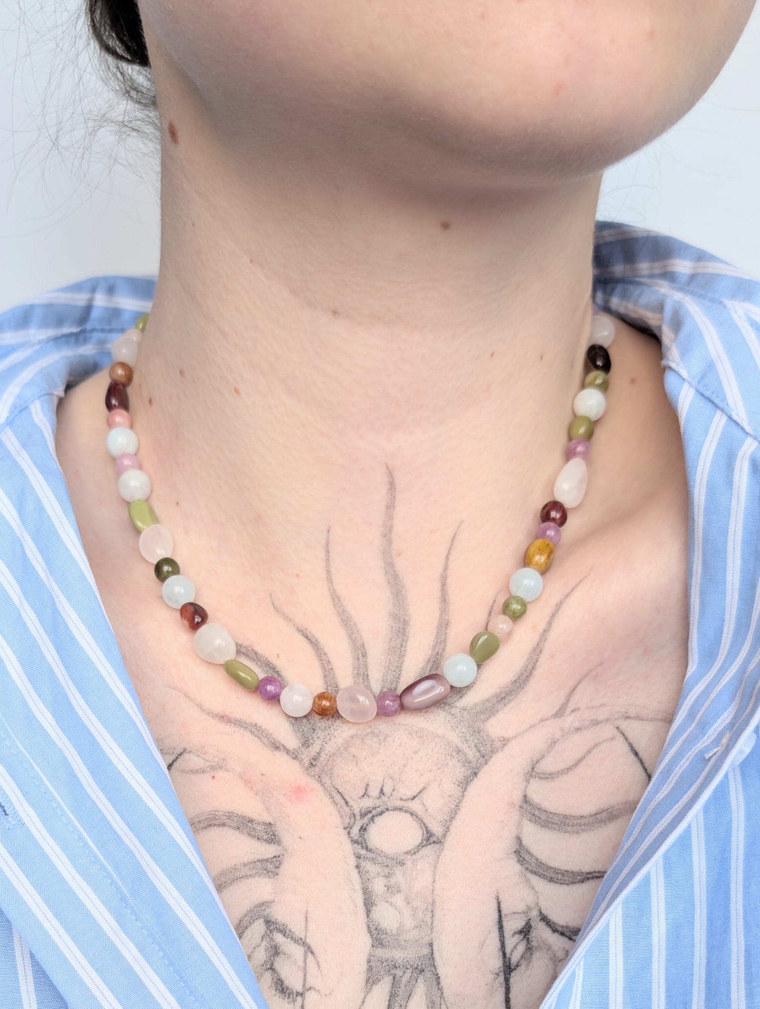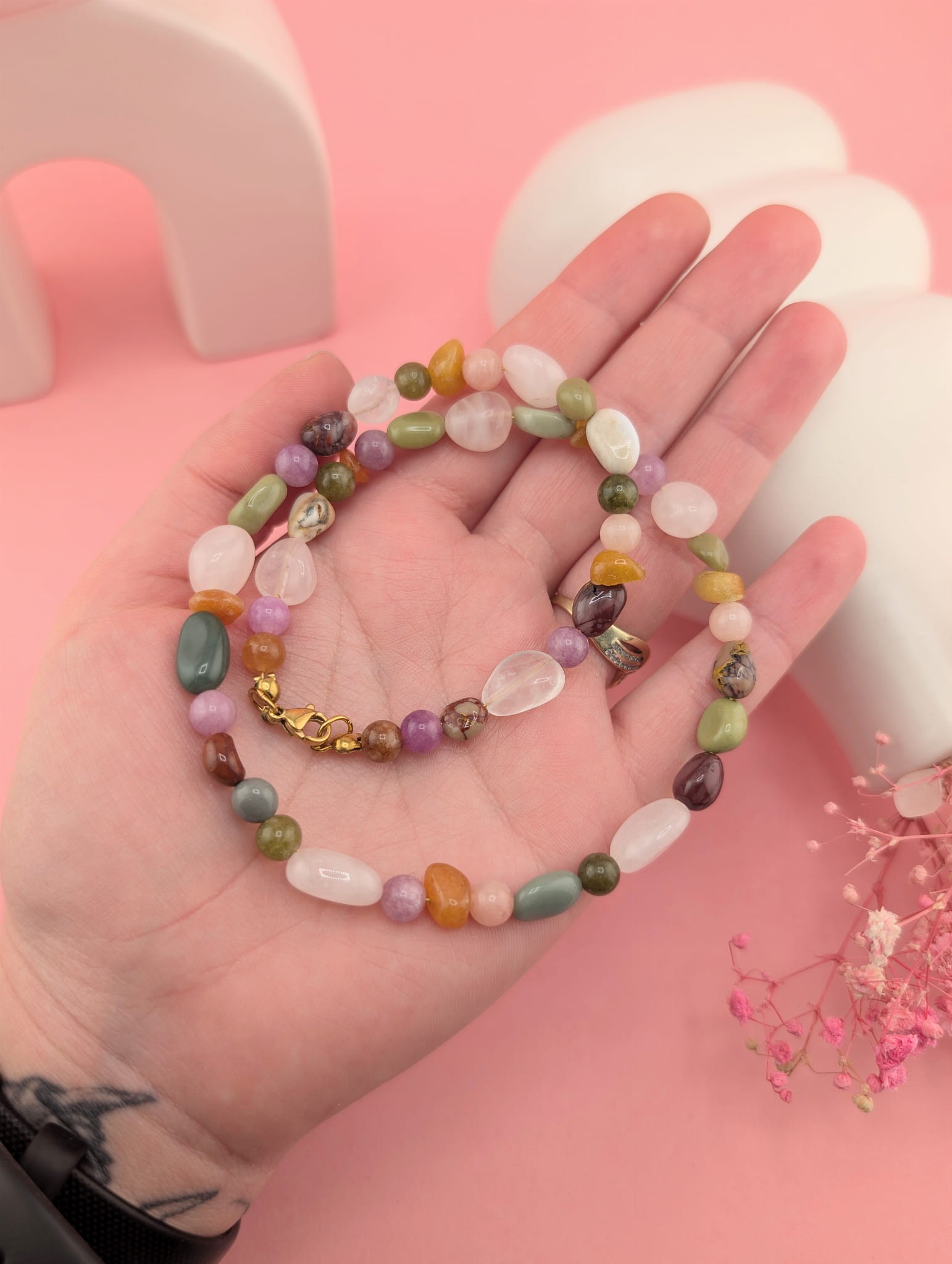 Naszyjnik wykonany z mieszanki naturalnego agatu i kwarcu zachwyca różnorodnością barw i naturalnych wzorów. Każdy kamień ma swój niepowtarzalny charakter, dzięki czemu naszyjnik jest wyjątkowy.