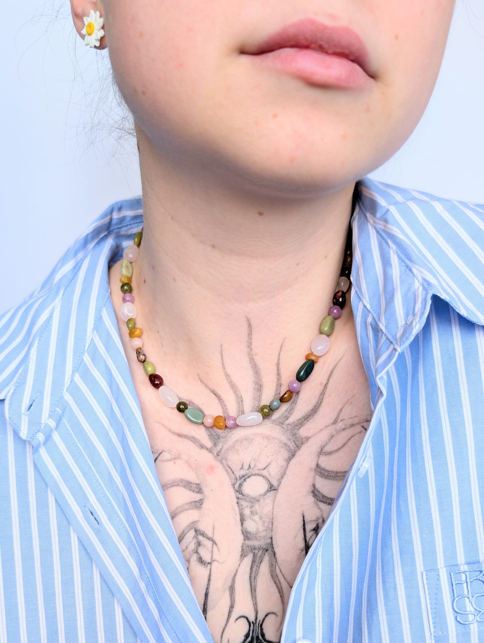 Wiosenny naszyjnik z kamieni naturalnych wykonany z mieszanki agatu i kwarcu. Kolorowe kamienie tworzą wyjątkową, naturalną kompozycję. Długość naszyjnika około 44 cm.