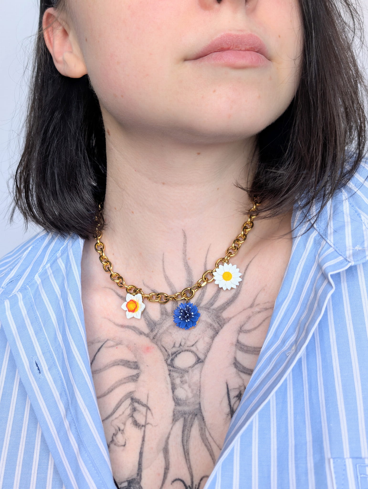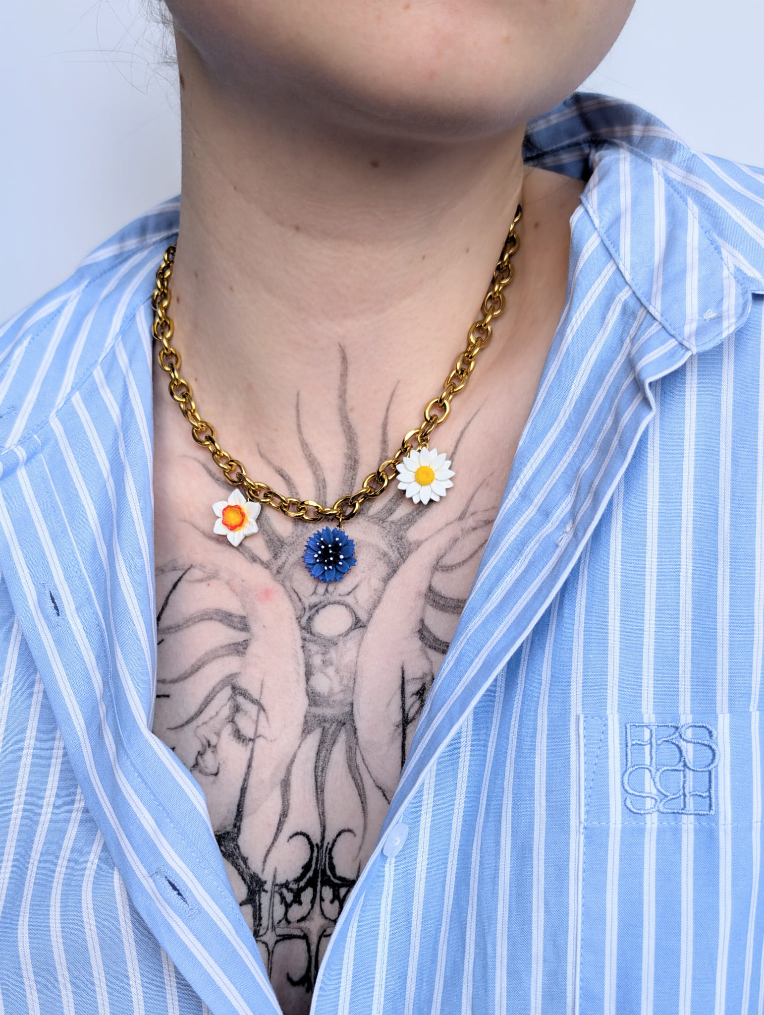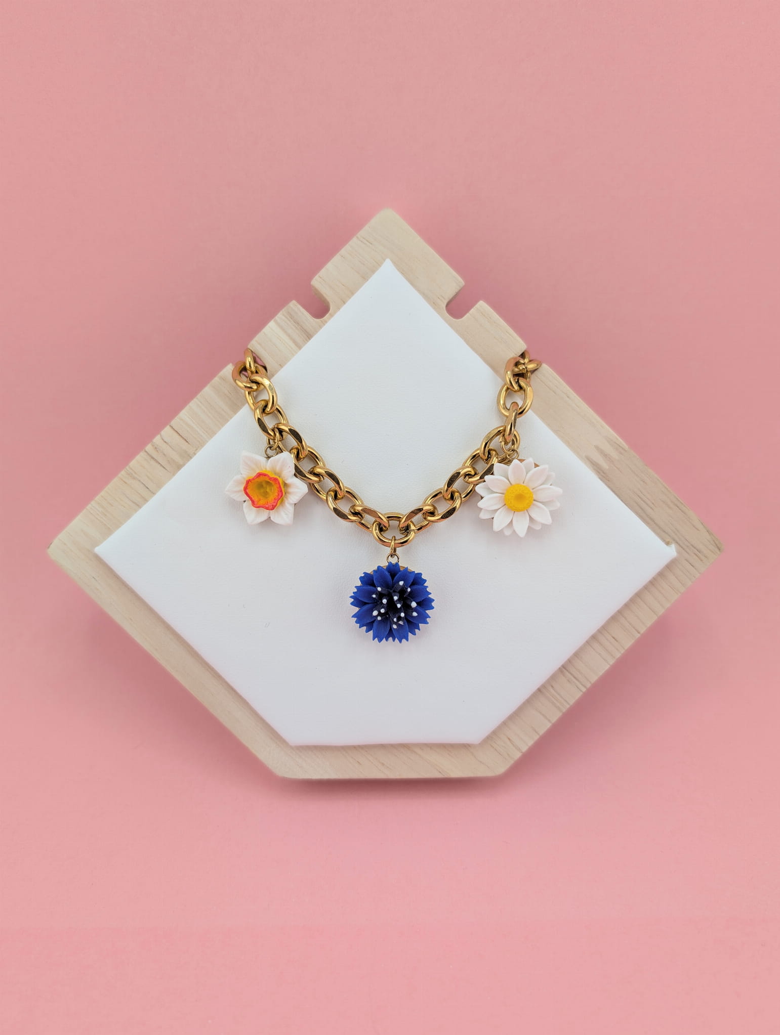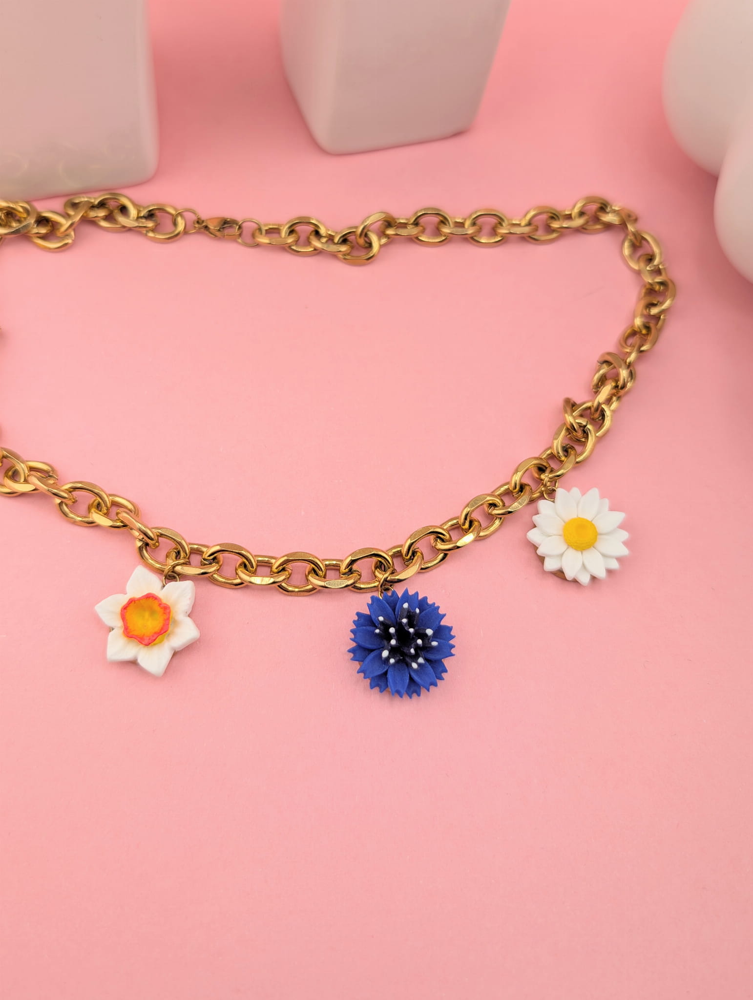 Wiosenny, kwiatowy naszyjnik z chabrem, stokrotką i żonkilem na grubym złotym łańcuszku o długości 41 cm. Połączenie polnych kwiatów z masywnym łańcuszkiem tworzy efektowną, wiosenną biżuterię idealną na codzień i wyjątkowe okazje.