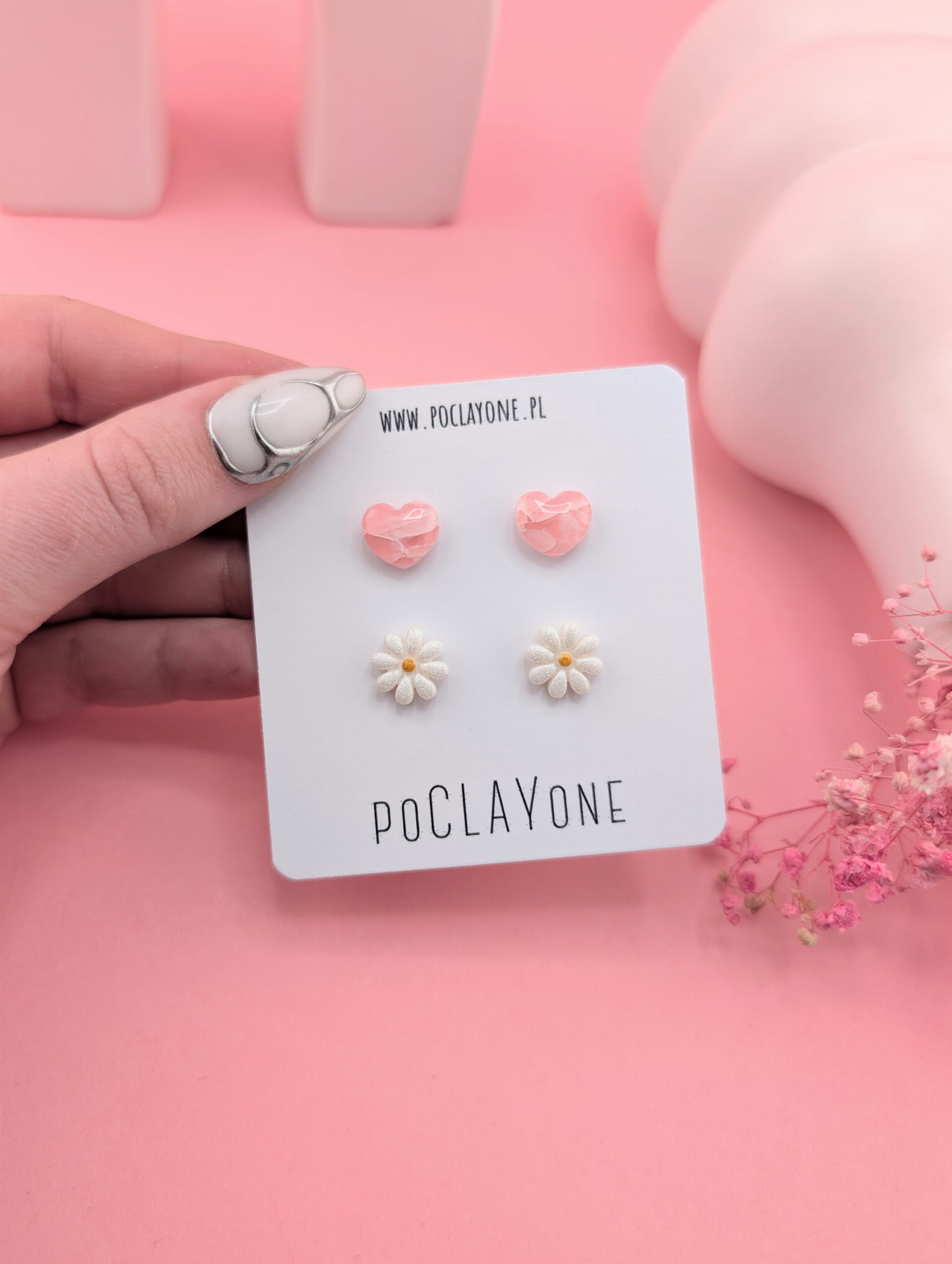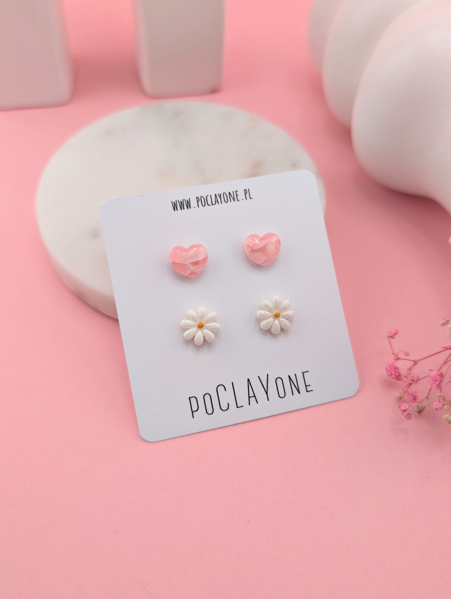 Zestaw kolczyków łączy dwa subtelne motywy: różowe serduszka marmurki oraz perłowe stokrotki. Połączenie pastelowego różu i perłowego połysku tworzy uroczy, wiosenny akcent, który ożywia każdą stylizację.