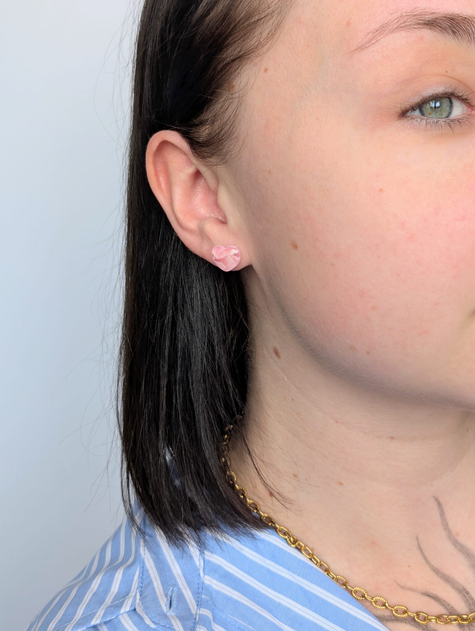 Każda para kolczyków jest ręcznie wykonana, a marmurkowa technika nadaje unikatowy wygląd różowym serduszkom. Perłowe stokrotki dodają subtelnego połysku i elegancji.
