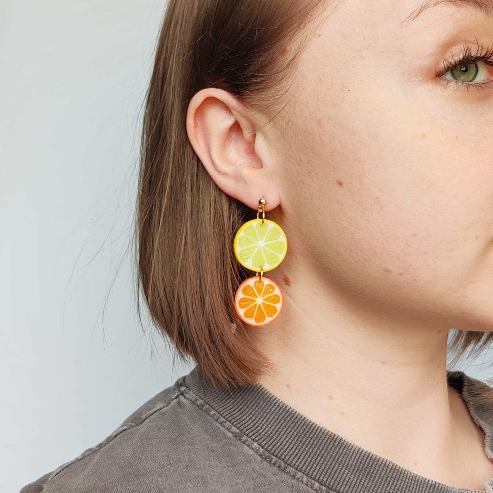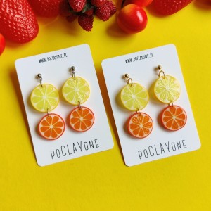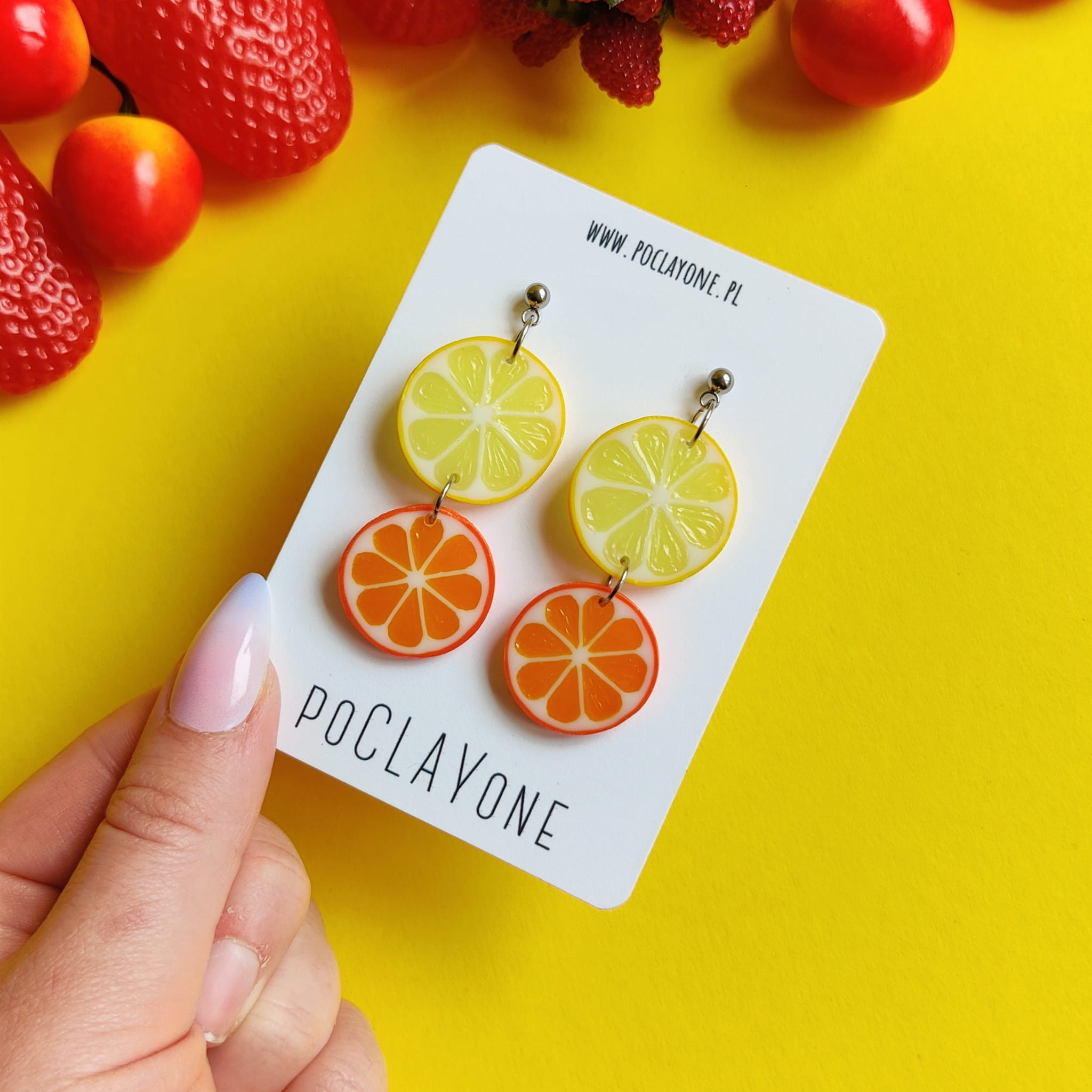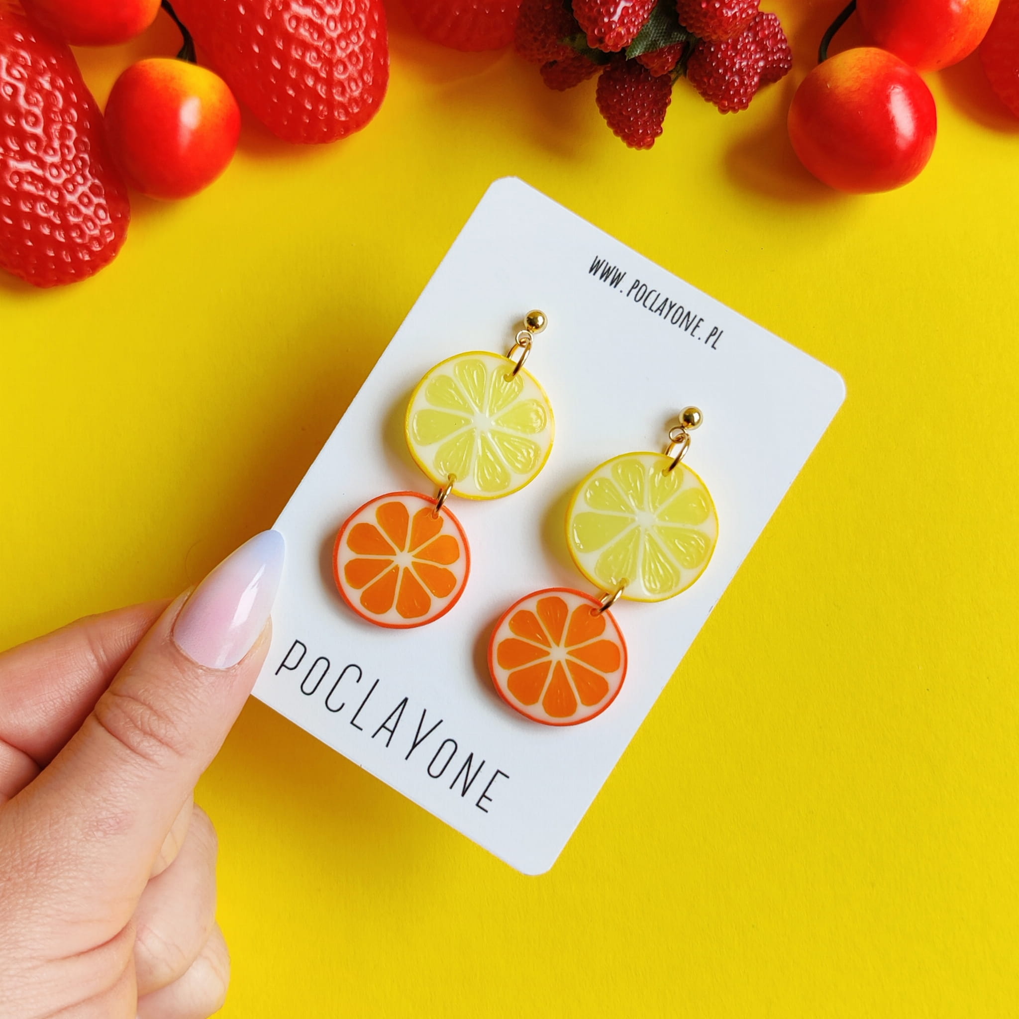 Wiszące kolczyki cytrusy – plasterki cytryny i pomarańczy, ręcznie wykonana biżuteria letnia