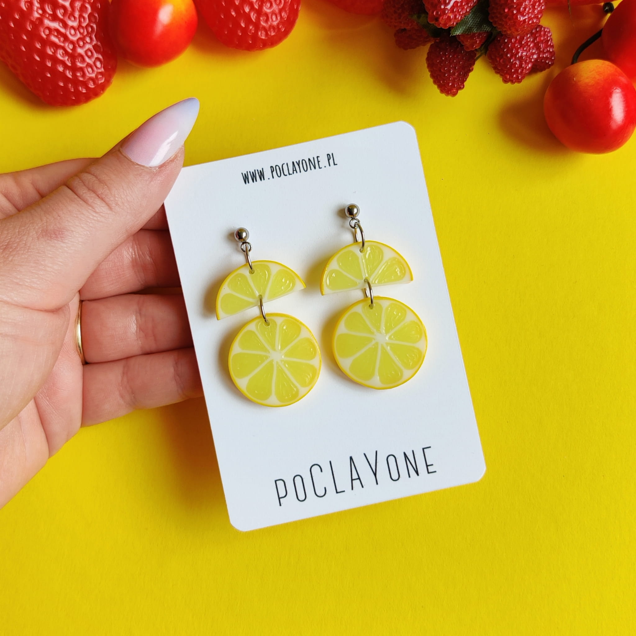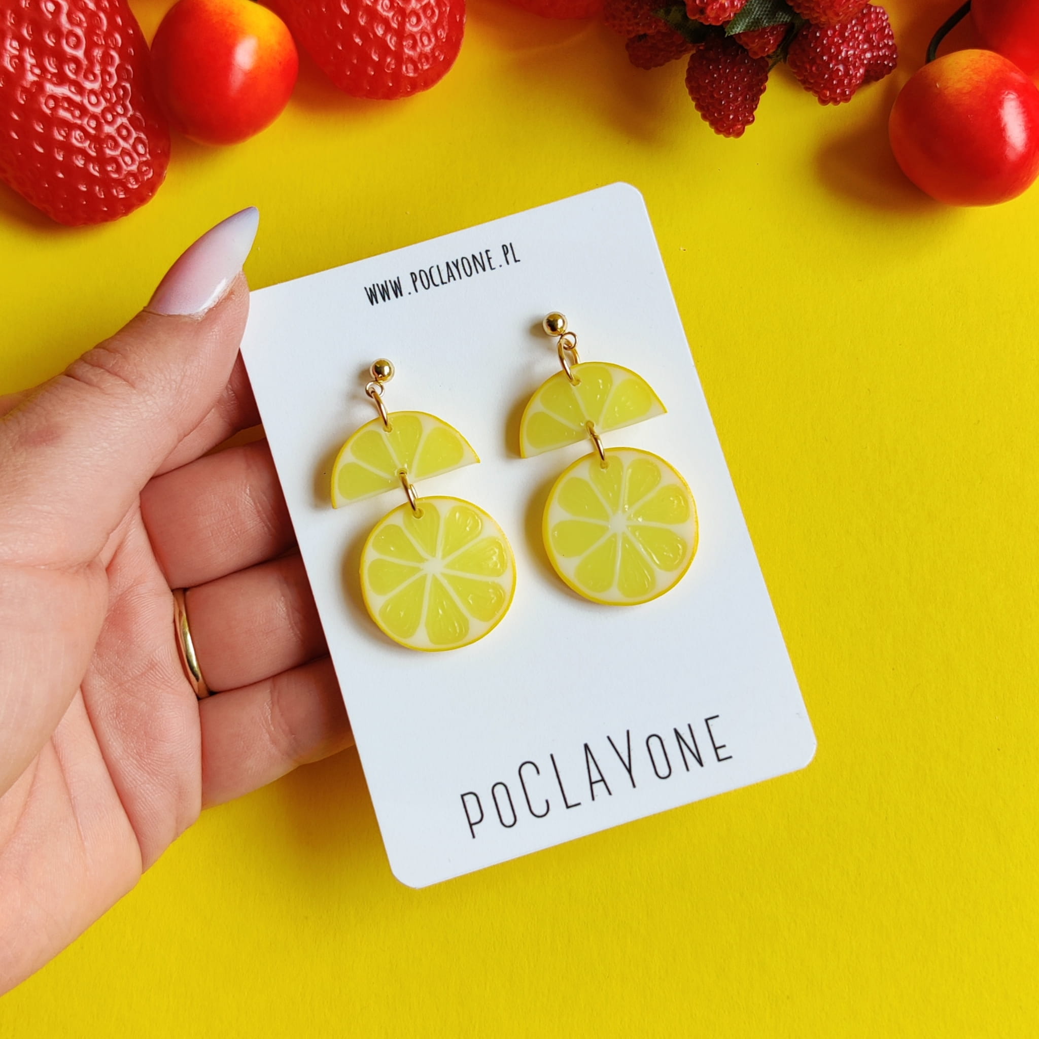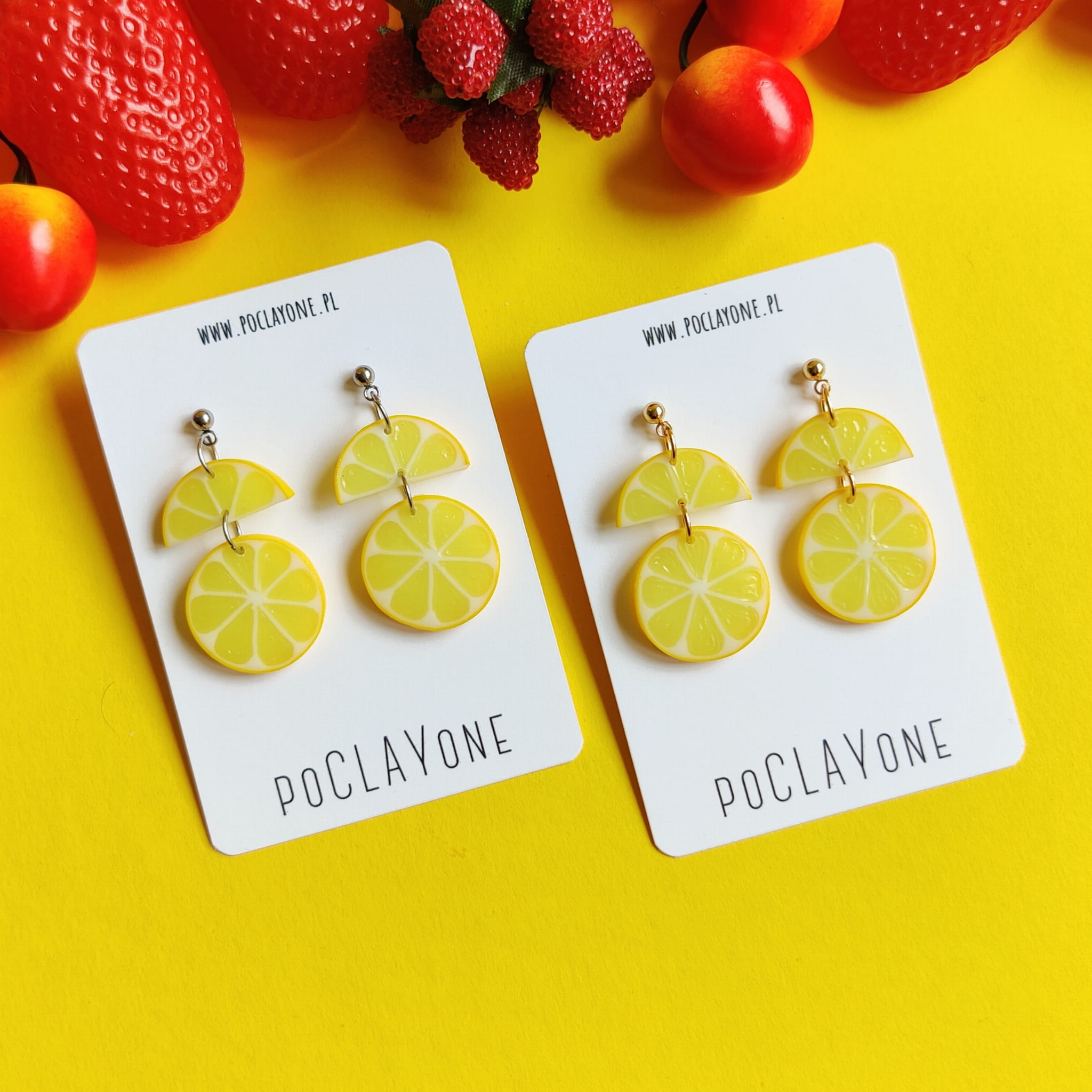 Ręcznie wykonane wiszące kolczyki plasterki cytryny w intensywnym żółtym kolorze, na biglach ze stali chirurgicznej. Idealne letnie, owocowe kolczyki!