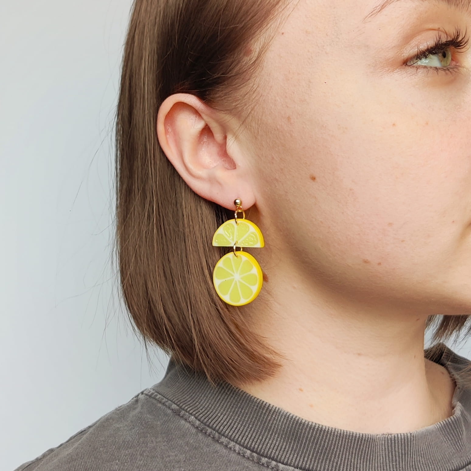 Wiszące kolczyki plasterki cytryny – ręcznie robiona biżuteria letnia, soczysty żółty kolor