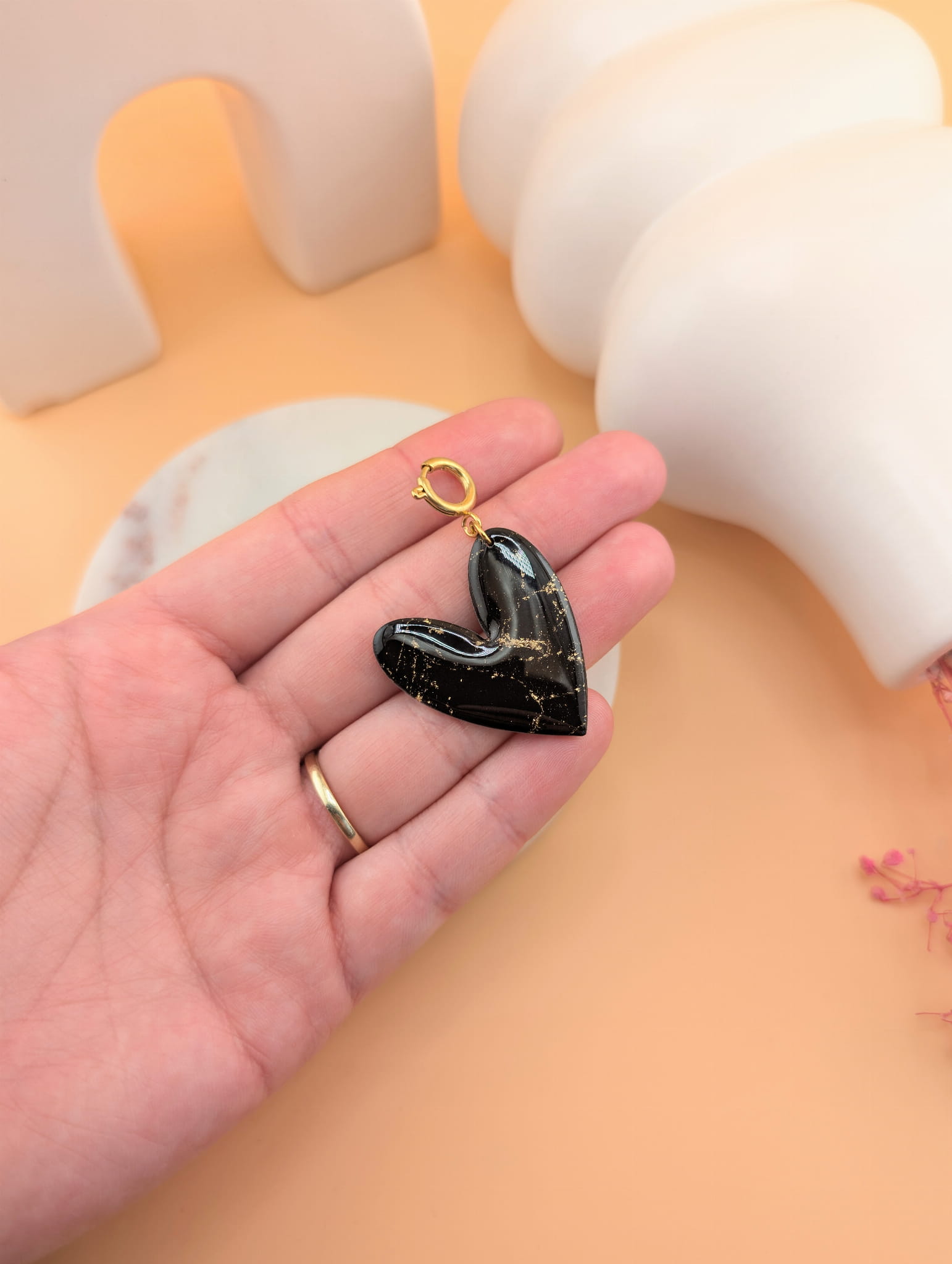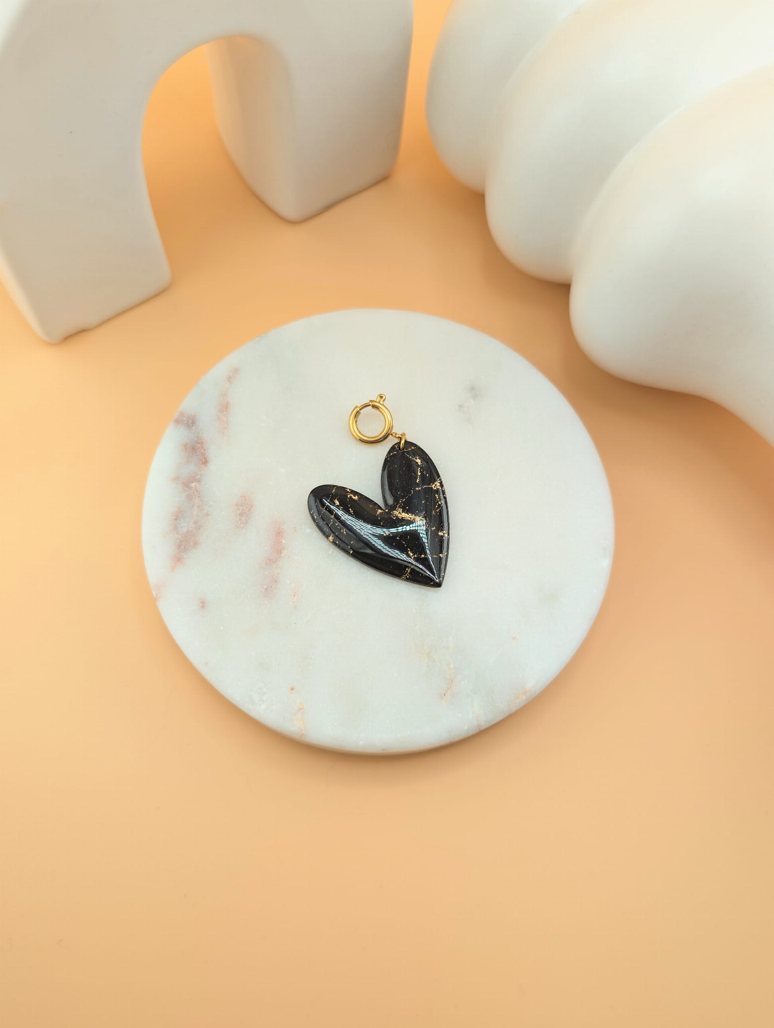 Elegancka zawieszka serce w czarno-złotym marmurkowym wzorze o wielkości ok. 3,5 cm. Wyrazisty, stylowy dodatek do naszyjników, idealny na co dzień i na wyjątkowe okazje.