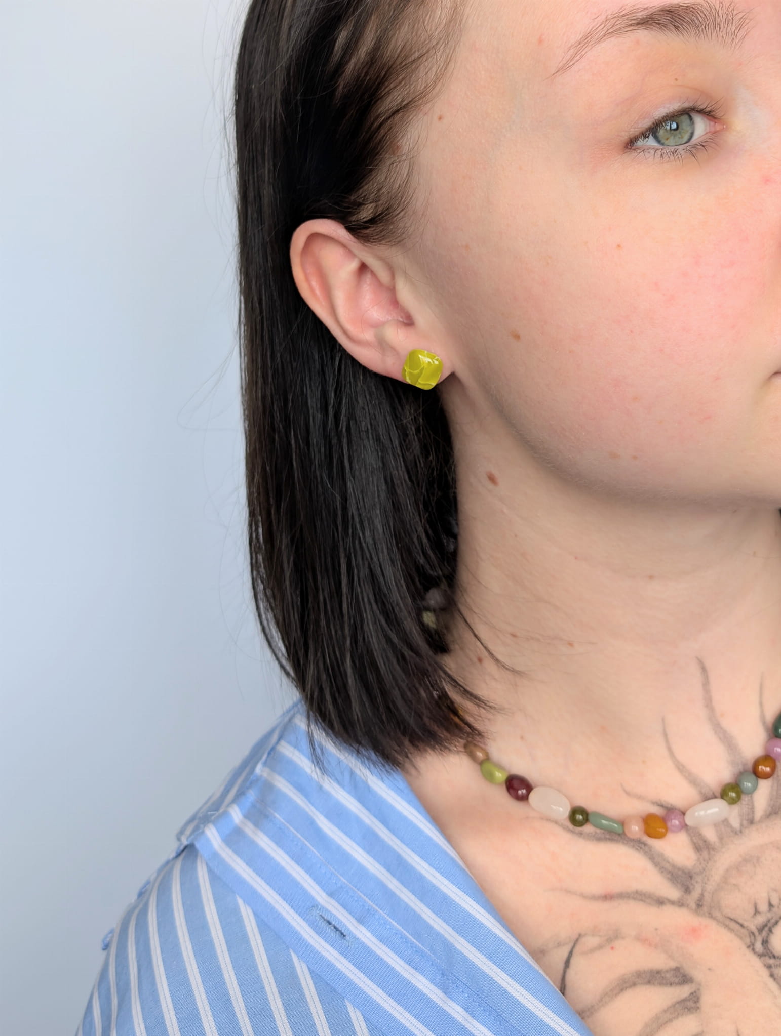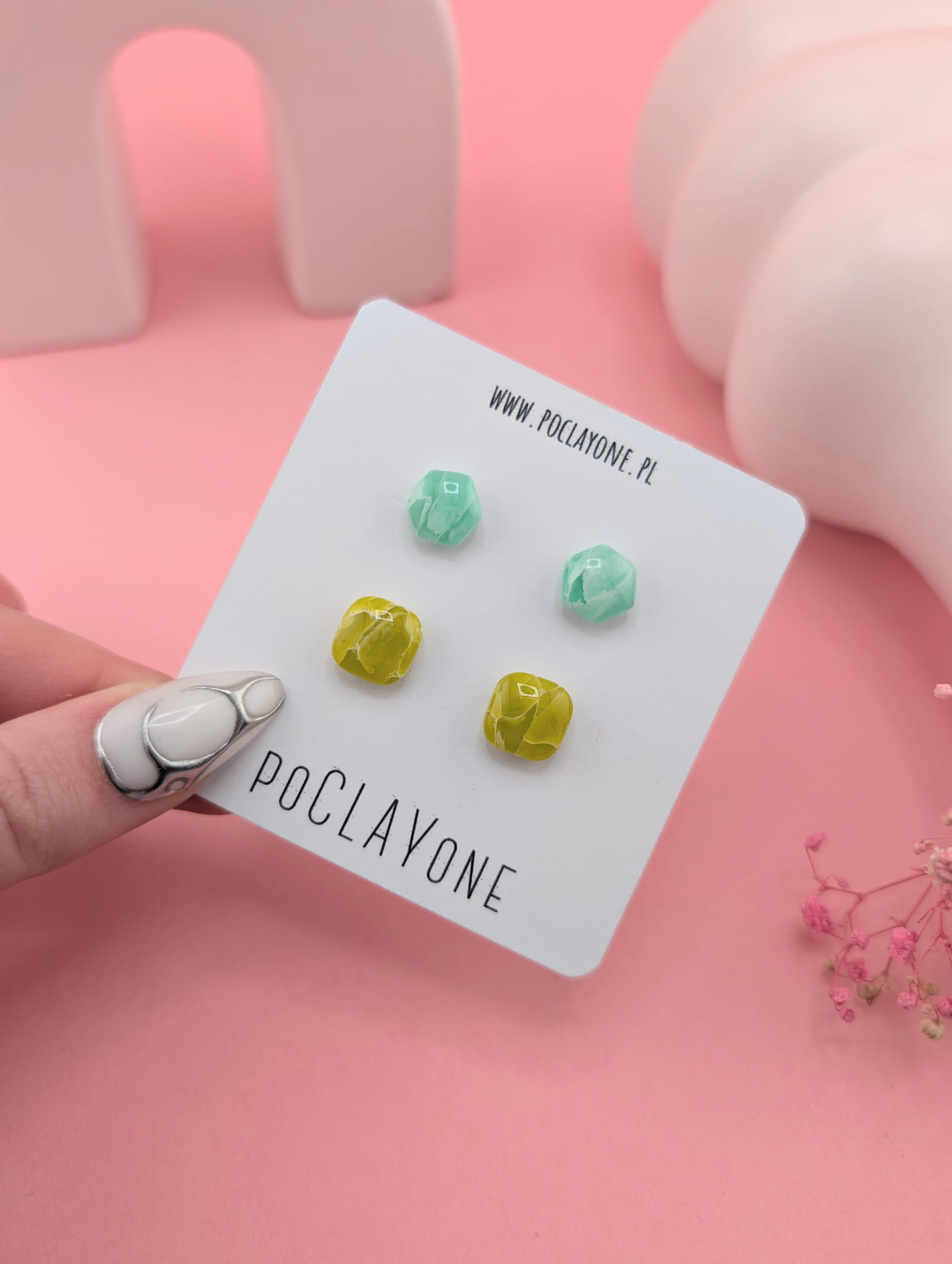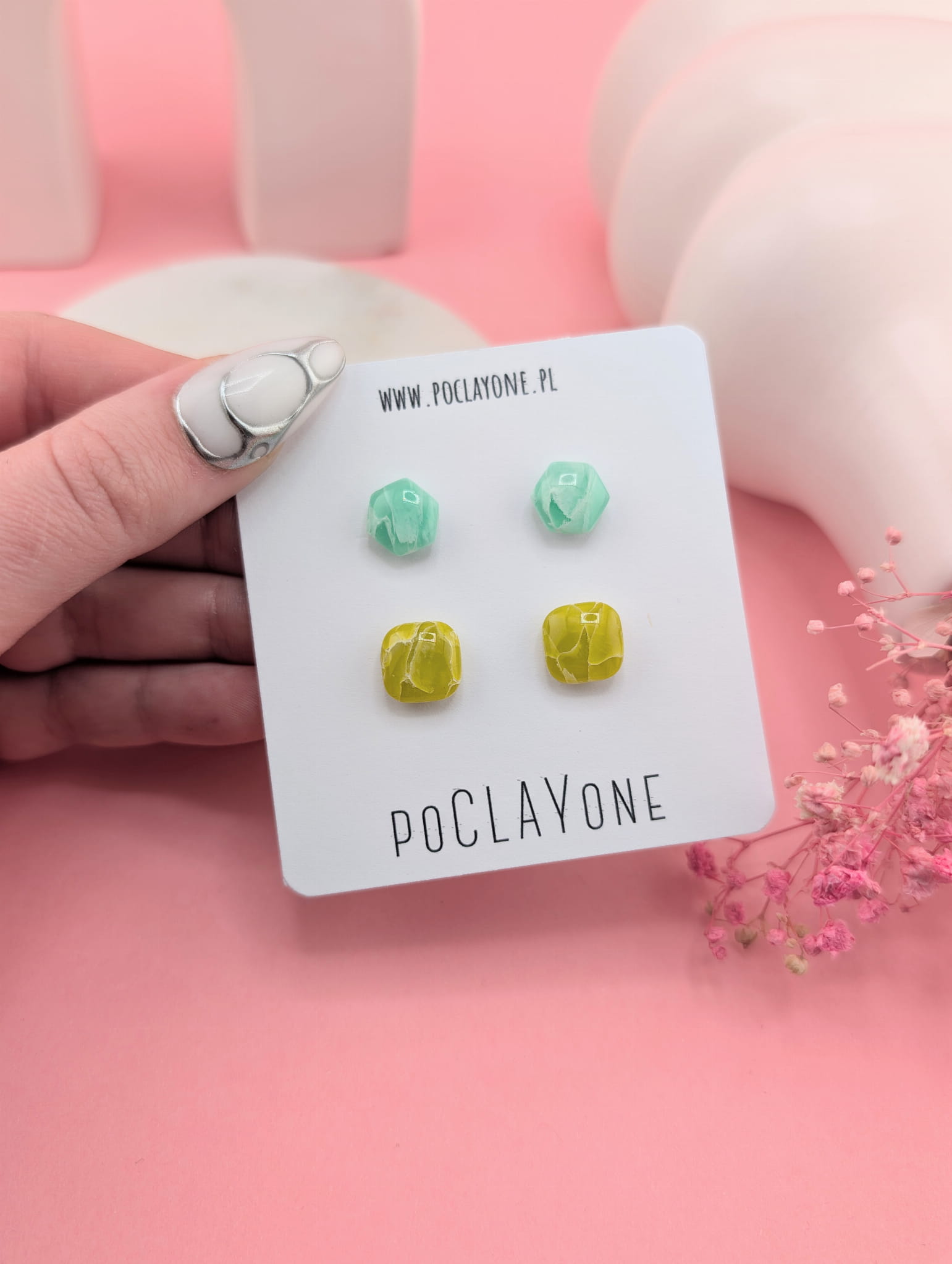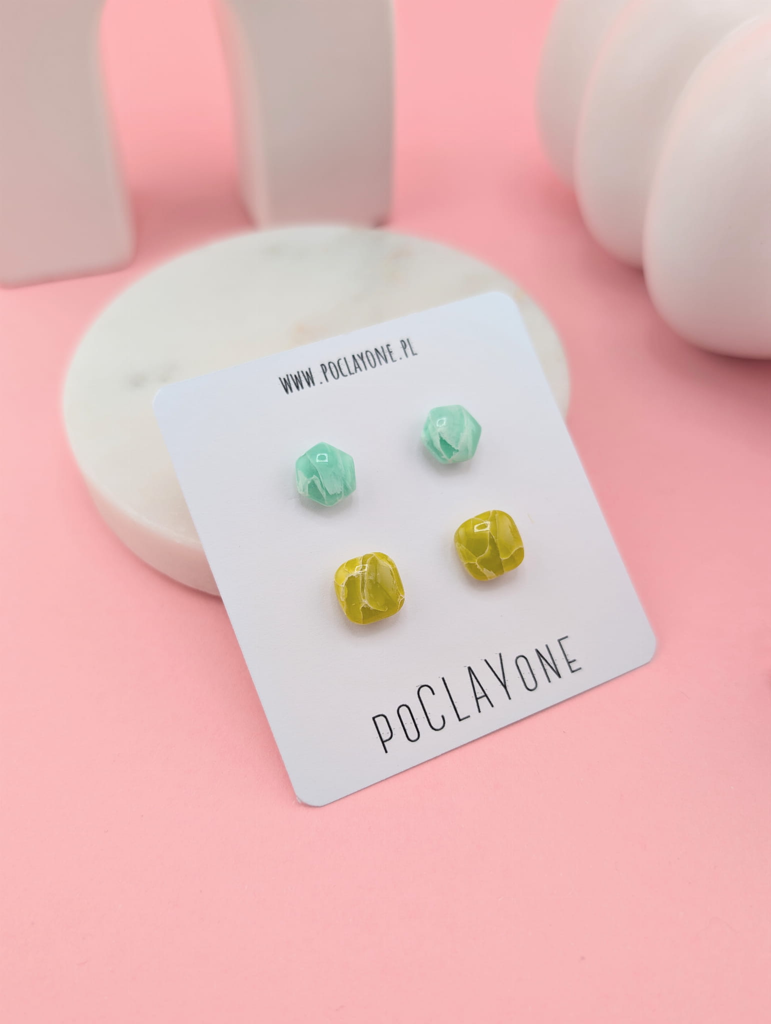 Zestaw kolczyków sztyftów – limonkowe kwadraciki i miętowe heksagony, wykonane ręcznie metodą marmurkową. Każda para jest unikatowa, tworząc kolorowy i nowoczesny akcent do codziennych stylizacji.
